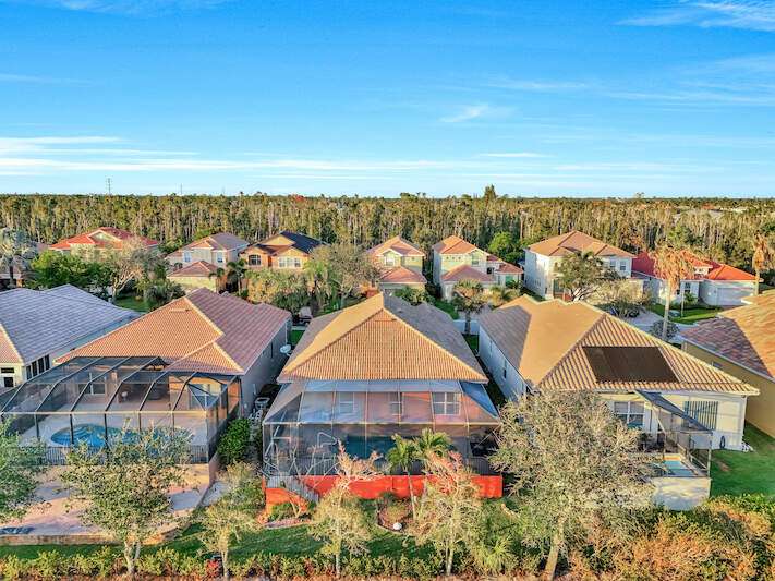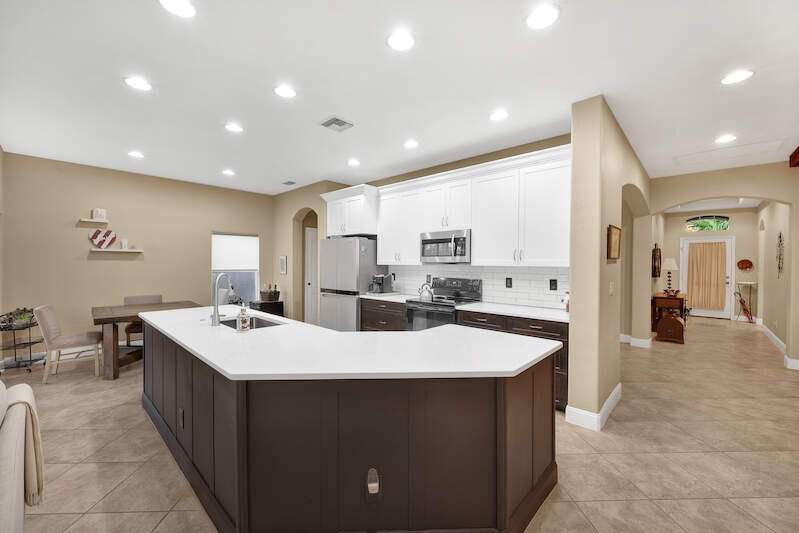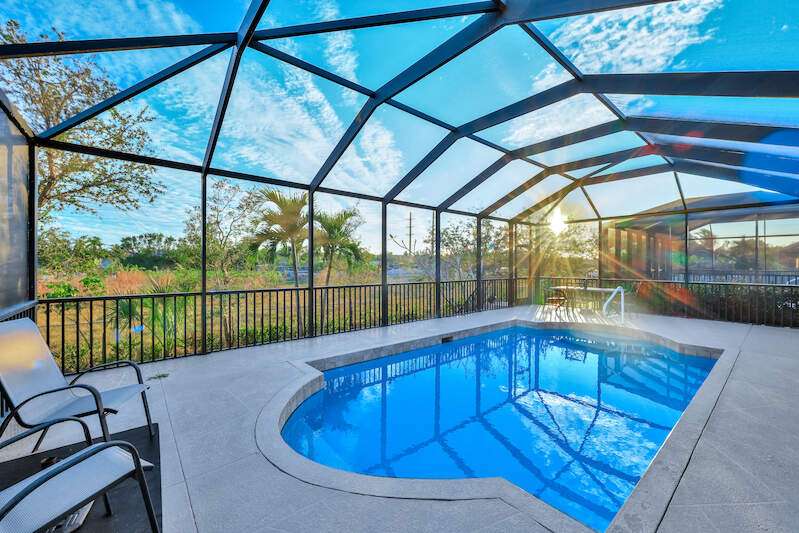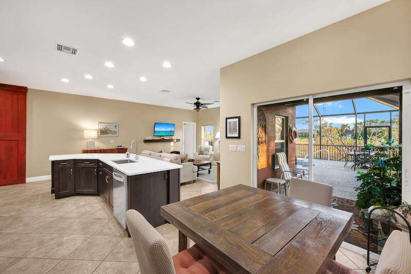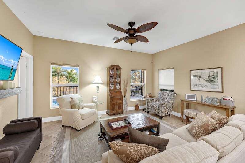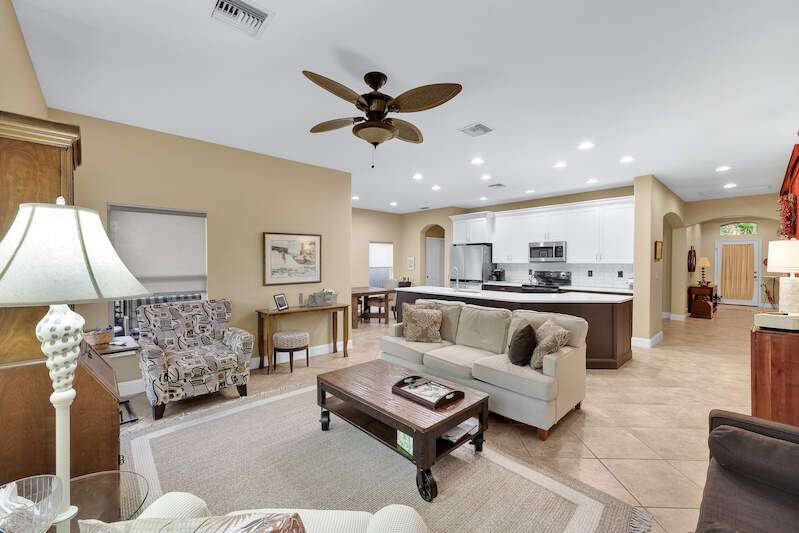 **OWNER FINANCING AVAILABLE** Welcome to 8701 Banyan Bay Rd. This beautiful 3 bedroom + Den, 2 bathroom, 2 car garage pool home is located in gated Banyan Bay with low HOA Fees and minutes from beaches, shopping, restaurants and much more. Through the front door you are greeted with the neutral color palette and large 18" tile on the diagonal leading you through the main living areas. Entertaining is a breeze in this open living/kitchen area with large kitchen Island for extra storage and counter space or take your dinner party to the formal dining room. The kitchen was beautifully upgraded in 2023 including new two-tone kitchen cabinets, quartz counter tops, fridge/freezer, dishwasher and stunning tile backsplash. Additional 2023 improvements include new carpet in the bedrooms, new water heater and a new roof. The primary suite offers ample space, walk-in closet and ensuite bath featuring dual sinks and large slate tile walk-in shower. 2 additional bedrooms, den with barn style door and 2nd bath provide plenty of space for family and friends. Outdoors you can enjoy SWFL living at its best from the comfort of your screened in lanai boasting your own private heated pool; updated in 2023 with a new pool pump and heater, this private oasis will entice you to relax and soak in the warm sun. This quiet Winkler extension corridor community also features a community pool. It's quite lovely at Banyan Bay!