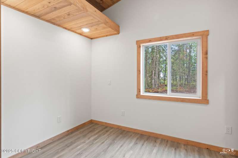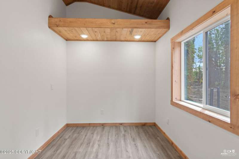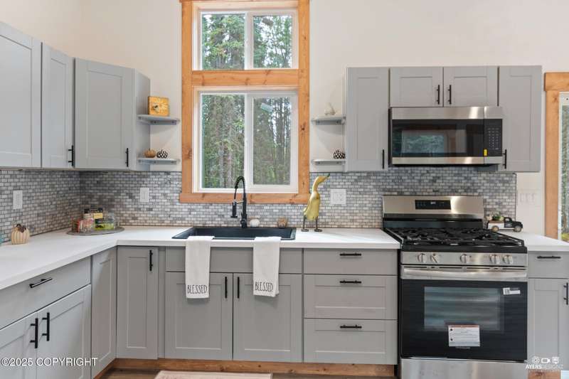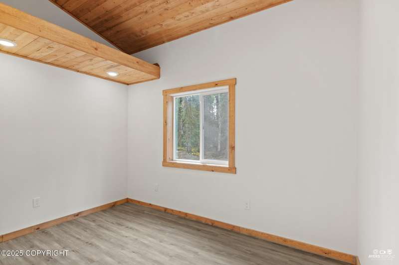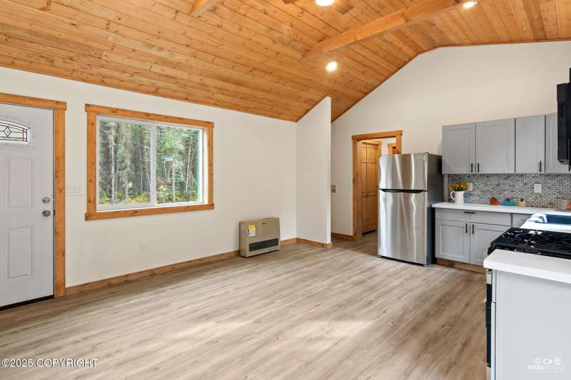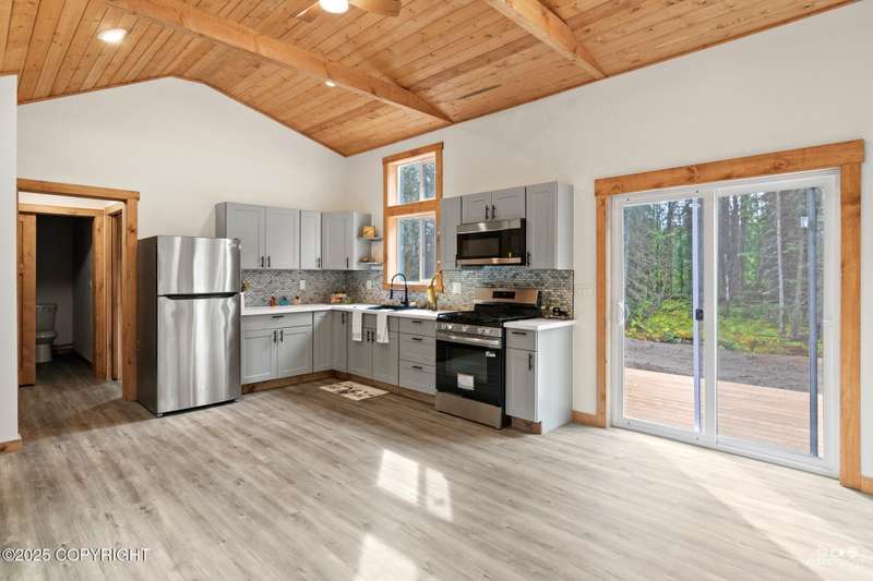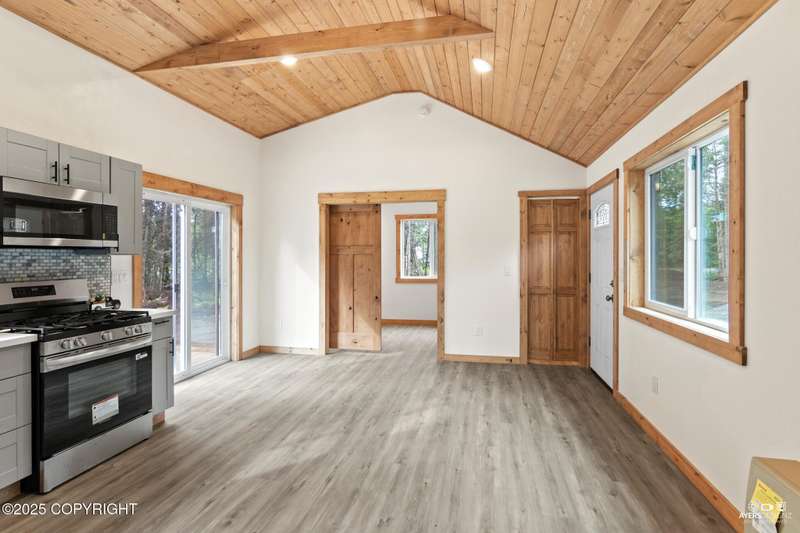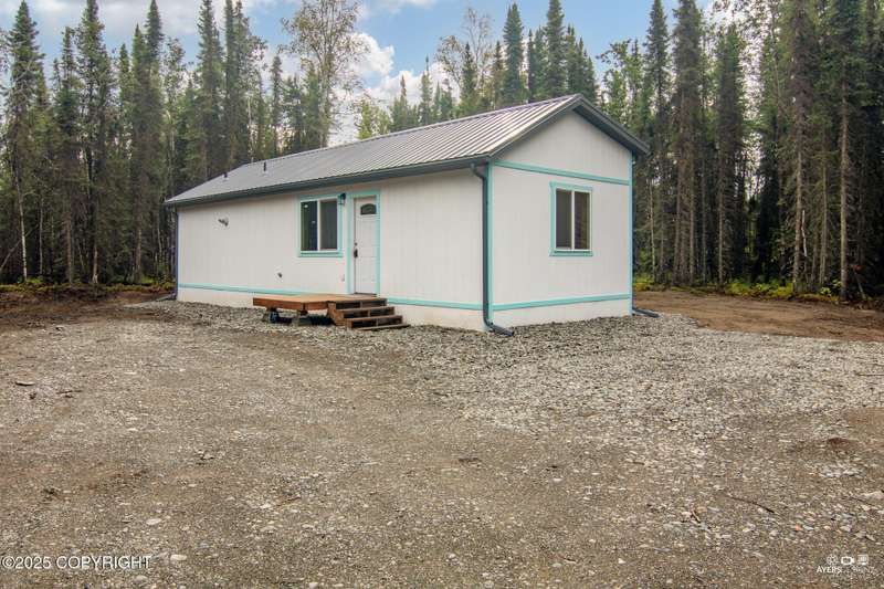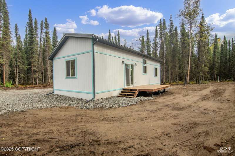 Cute as a button and brand new! Kitchen features tiled backsplash, solid surface countertops, stainless steel appliances, and double windows over the kitchen sink to let in more sunlight. Bathroom shower is beautifully tiled, and bedrooms both have overhead storage w/tongue and groove vaulted ceilings throughout. Back deck for BQs, nearly an acre, and close to fishing!
