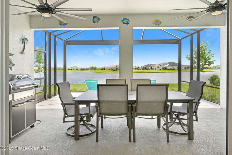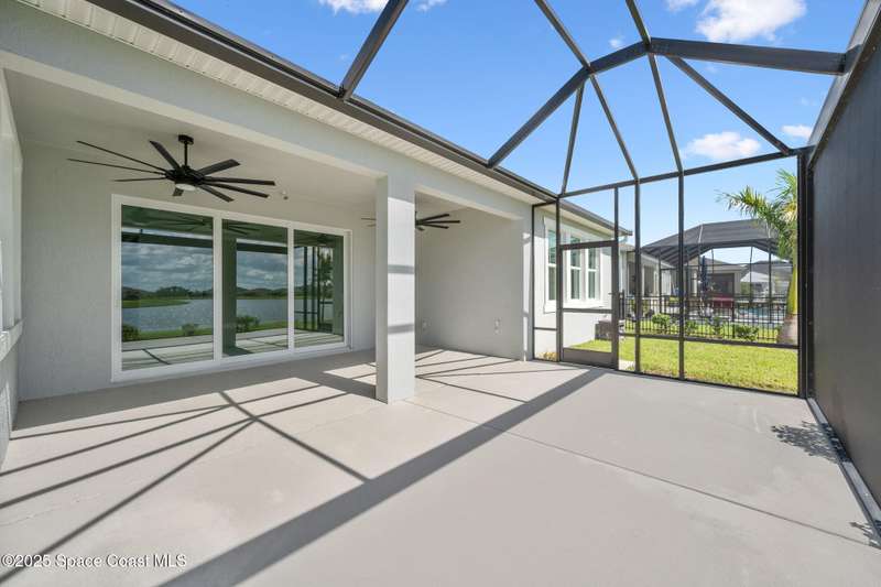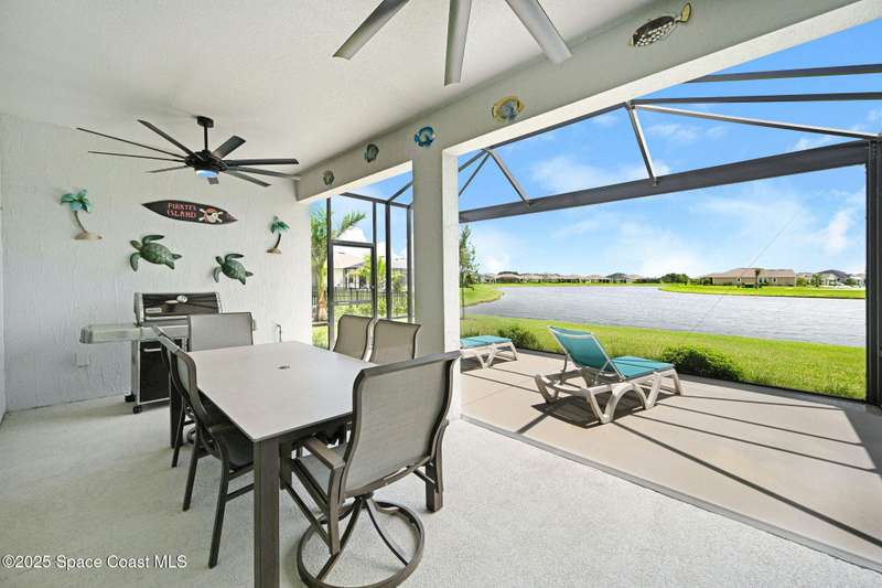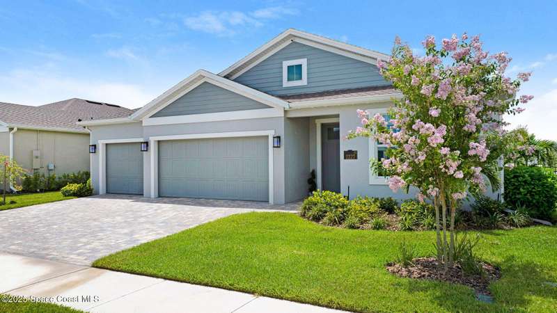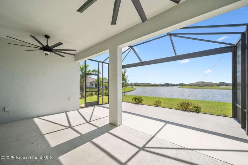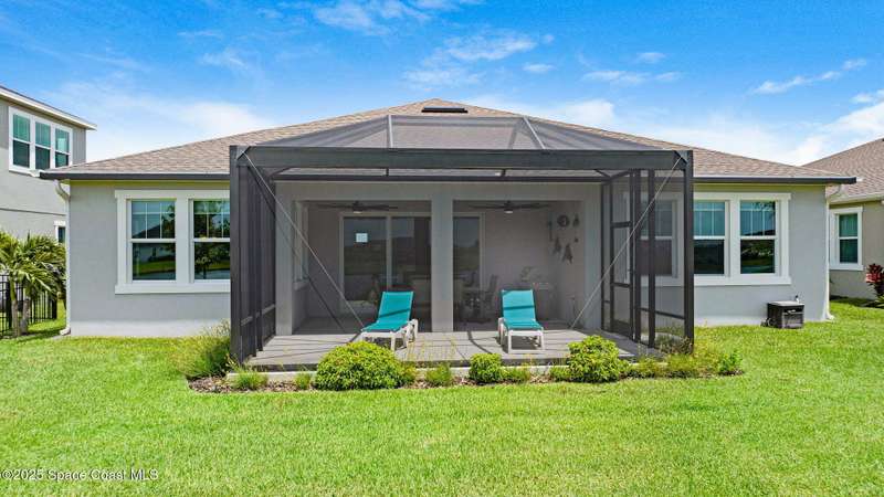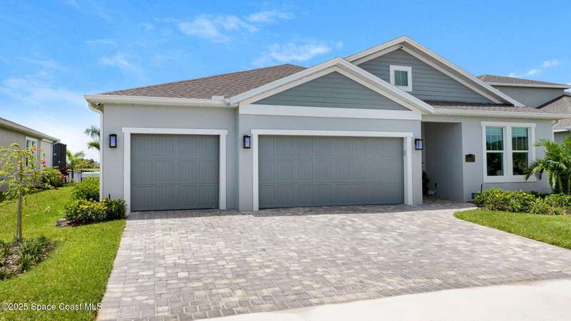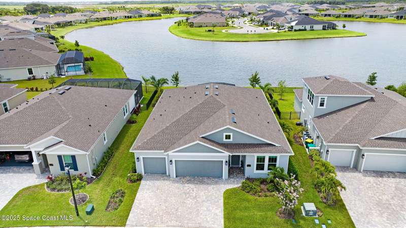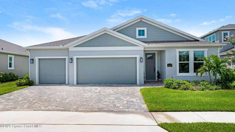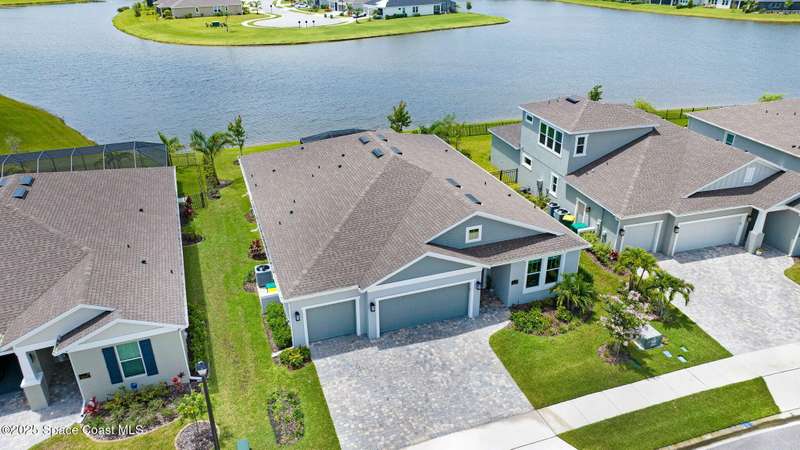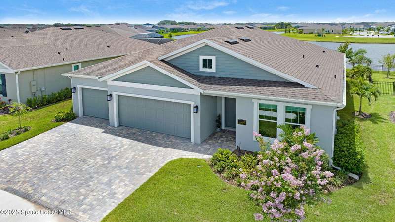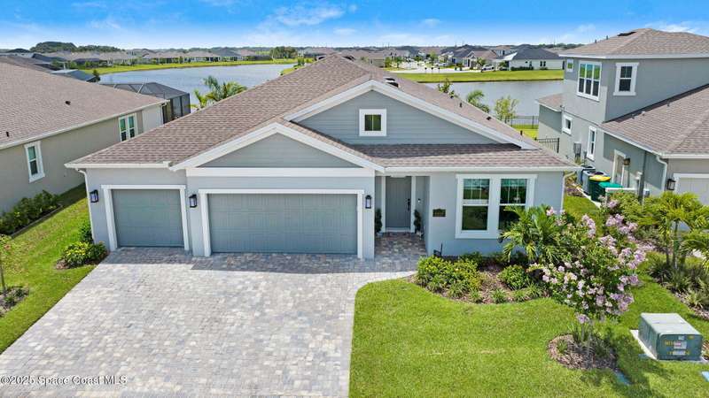 Welcome to this stunning 2023 home, featuring 3 bedrooms + office, 3.5 baths, spacious 3-car garage. Located in Pangea Park community, this modern home offers a peaceful, well-designed split floor plan with million-dollar lakefront view + large backyard to build your own POOL. Each bedroom has WIC, full bath, upgraded fans. The gourmet kitchen is a chef's dream w/Samsung SS appliances, upgraded 42-inch cabinets, quartz countertops, large island perfect for entertaining, huge walk-in pantry. The living room includes tray ceiling with upgraded recessed lighting + 84-inch fan. Enjoy serene lake views from the extended lanai with panoramic screen. Office features glass French doors and 2 windows. The Master suite features a tray ceiling + massive closet. The laundry room is equipped with Samsung Smart washer, dryer, sink. Garage has epoxy flooring, heavy-duty pull-down stairs, utility sink. Tile floors throughout, gutters all around, Termite Bond, 10-year Builder's Structural Warranty. Located in the maintained section of Pangea Park, this property offers a worry-free lifestyle. The HOA covers all lawn maintenance, including mulching, weeding, and sprinkler care.Residents can enjoy fantastic community amenities, including a pavilion, pool, playground, and tennis/pickleball courts.The home's prime location puts you just minutes from the new Publix and Costco, as well as The Avenue shops, dog parks, the Brevard Zoo, and a variety of dining and golfing options. For travel and day trips, it's less than one hour to Orlando and about 30 minutes to Port Canaveral.