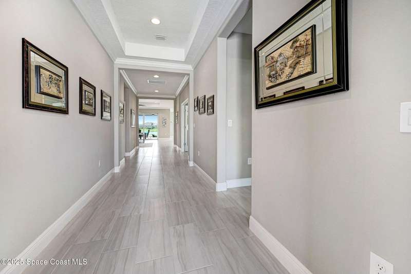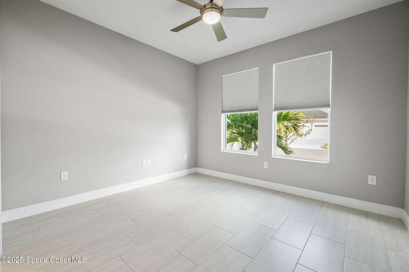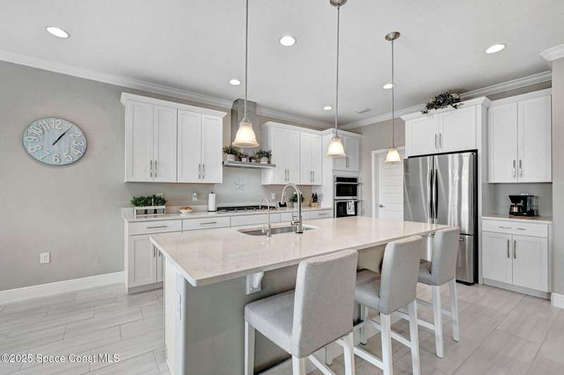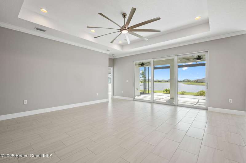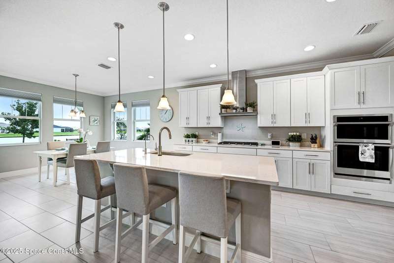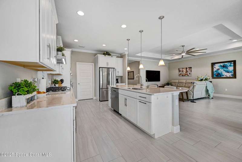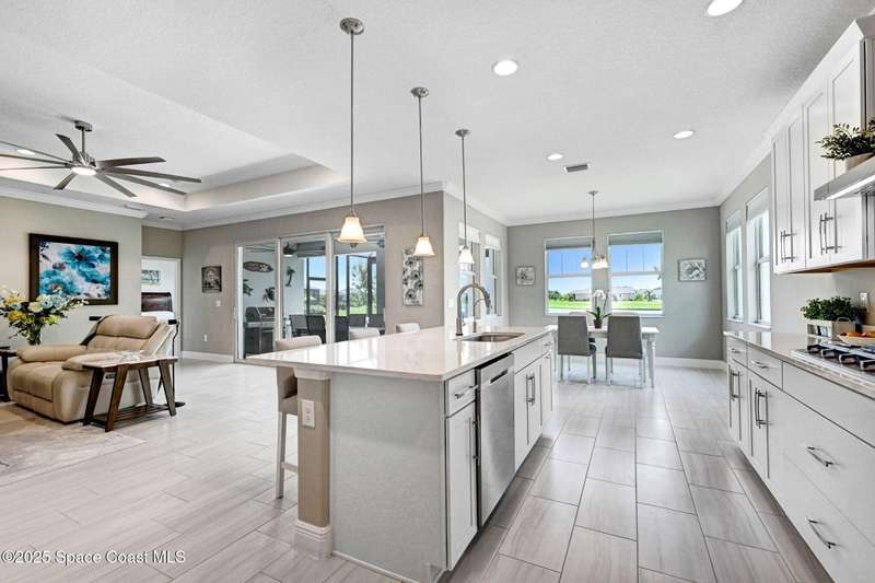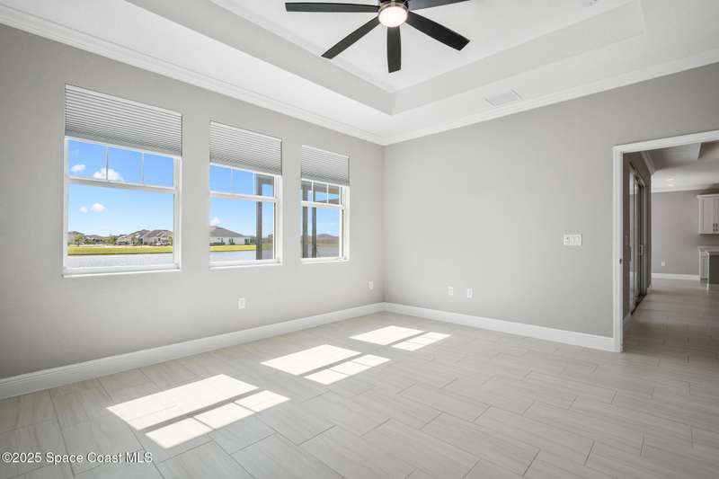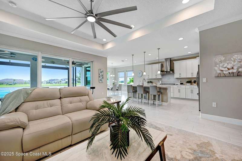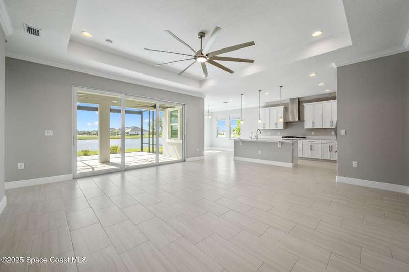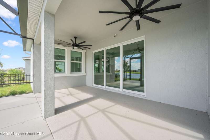 Welcome to this stunning 2023 home, featuring 3 bedrooms + office, 3.5 baths, spacious 3-car garage. Located in Pangea Park community, this modern home offers a peaceful, well-designed split floor plan with million-dollar lakefront view + large backyard to build your own POOL. Each bedroom has WIC, full bath, upgraded fans. The gourmet kitchen is a chef's dream w/Samsung SS appliances, upgraded 42-inch cabinets, quartz countertops, large island perfect for entertaining, huge walk-in pantry. The living room includes tray ceiling with upgraded recessed lighting + 84-inch fan. Enjoy serene lake views from the extended lanai with panoramic screen. Office features glass French doors and 2 windows. The Master suite features a tray ceiling + massive closet. The laundry room is equipped with Samsung Smart washer, dryer, sink. Garage has epoxy flooring, heavy-duty pull-down stairs, utility sink. Tile floors throughout, gutters all around, Termite Bond, 10-year Builder's Structural Warranty. Located in the maintained section of Pangea Park, this property offers a worry-free lifestyle. The HOA covers all lawn maintenance, including mulching, weeding, and sprinkler care.Residents can enjoy fantastic community amenities, including a pavilion, pool, playground, and tennis/pickleball courts.The home's prime location puts you just minutes from the new Publix and Costco, as well as The Avenue shops, dog parks, the Brevard Zoo, and a variety of dining and golfing options. For travel and day trips, it's less than one hour to Orlando and about 30 minutes to Port Canaveral.