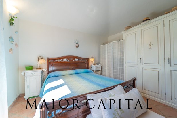 The sleeping area includes two double bedrooms, spacious and furnished with solid wood and wrought iron elements that recall the Sardinian artisanal style. One of the two bedrooms has direct access to the garden, offering maximum independence and continuity between indoors and outdoors.