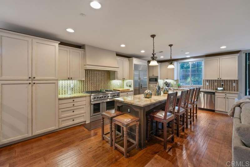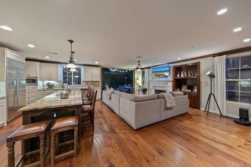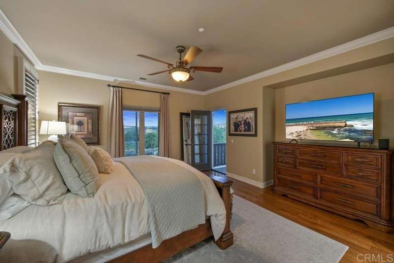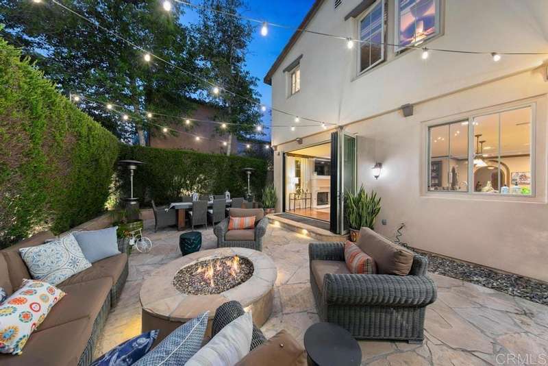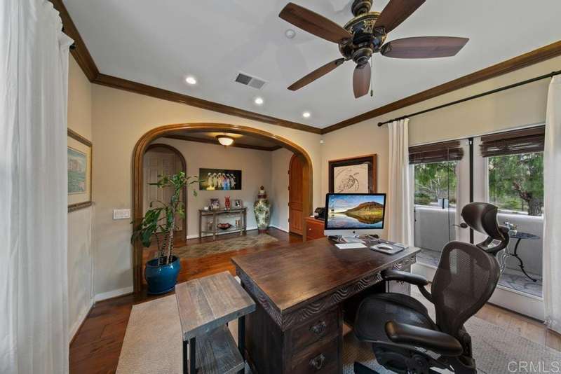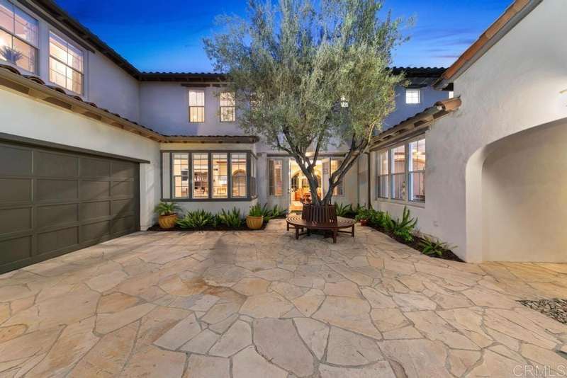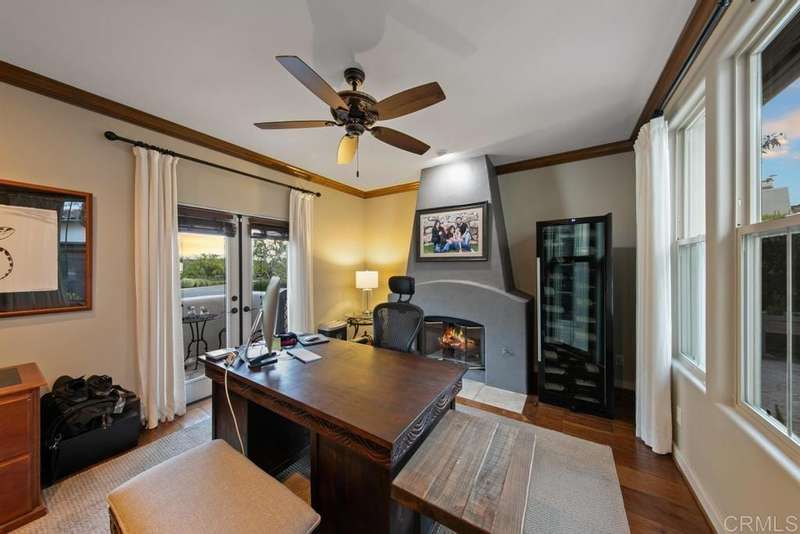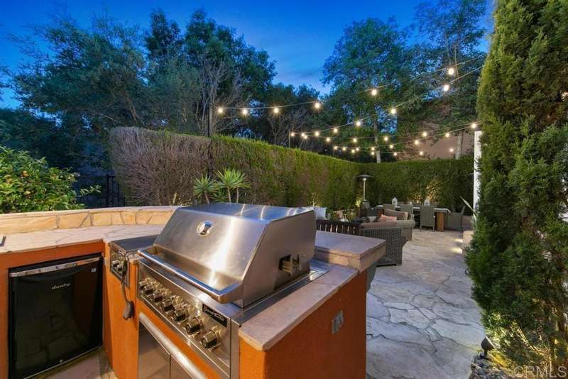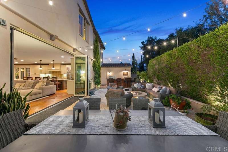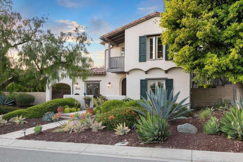 Welcome to this stunning former Santaluz model home, lovingly updated with custom touches. Enjoy sunset vistas over the canyon from the front of the home, while the private backyard is an entertainer's paradise. Gather around the outdoor kitchen, fire pit, or under the cantina lights for unforgettable alfresco dining experiences. The interior boasts Richard Marshall wood floors, plantation shutters, built-out niches, and wood shelving in the library. The open living concept seamlessly connects the family room, kitchen, and nook, with a folding Panoramic door with retractable screen door leading to the expansive backyard. The chef's kitchen features a large island, top-of-the-line appliances, including a Subzero Refrigerator / Freezer and a DCS commercial-style range. The primary suite enjoys a private balcony with sunset views and a spa-like bathroom with an oversized customized closet. Additional highlights include a finished garage with additional storage, bonus room/loft/5th bedroom and a downstairs office with two secondary en-suite bedrooms upstairs. This private retreat offers tranquility and seclusion, with a private gate and serene surroundings. Santaluz is a premier private, gated golf and lifestyle community, offering sweeping views, hiking and biking trails, and preserved parkland. The Santaluz Club membership, available separately, provides access to an array of amenities, including a private 18-hole golf course