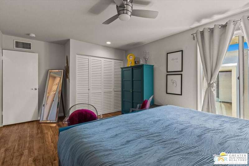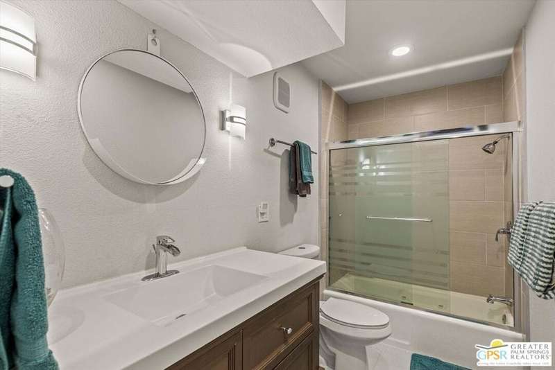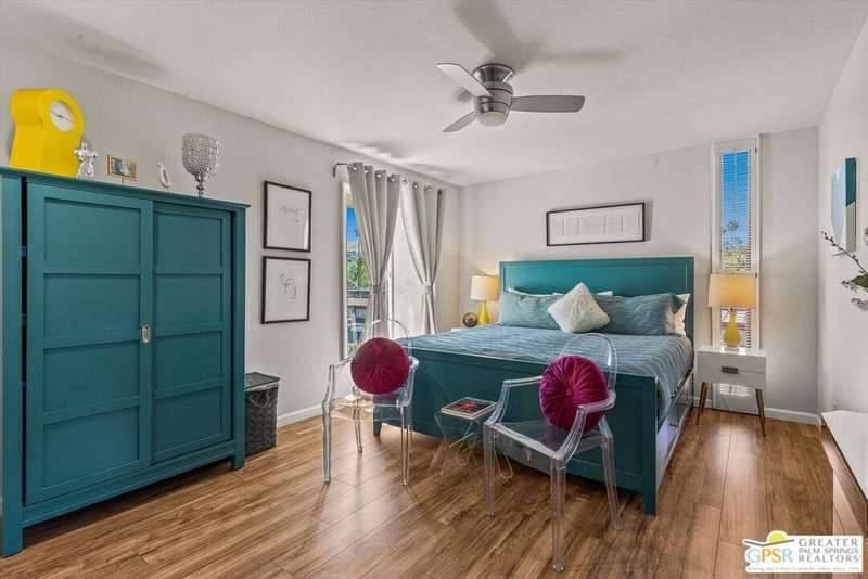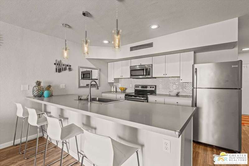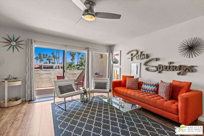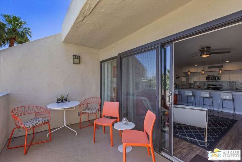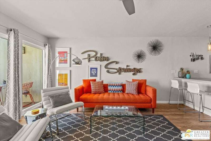 Live the carefree and fashionable Palm Springs lifestyle at this furnished turnkey condo with gorgeous mountain, pool and park views. Offering an outstanding location in the resort community of Smoke Tree Racquet Club, the single-level design was reimagined down to the studs in 2017 and now features on-trend upgrades throughout approximately 775 square feet. Entertain, relax and dine in an open living and dining area that flows to a private and sunny balcony overlooking the resort's central park and enormous swimming pool one of the largest in Palm Springs. A remodeled open-concept kitchen features white cabinetry, a peninsula breakfast bar, full tile backsplash, a trio of contemporary pendant lights, and stainless steel appliances. Custom tile shines in the bath and complements an upgraded vanity and circular mirror, while the bedroom is spacious and private. Wood-look plank flooring, custom paint and window treatments, and contemporary furnishings lend timeless style throughout. Designed by visionary Palm Springs architect Hugh Kaptur, Smoke Tree Racquet Club is home to lighted tennis and pickleball courts, lush landscaping and a dog park. Smoke Tree Village is right across the street and features shops, restaurants, Ace Hardware and Ralphs Fresh Fare Supermarket. Downtown Palm Springs is moments away, miles of hiking trails are nearby, and Palm Springs International Airport makes it easy to enjoy this turnkey condo as a vacation getaway or a full-time residence.