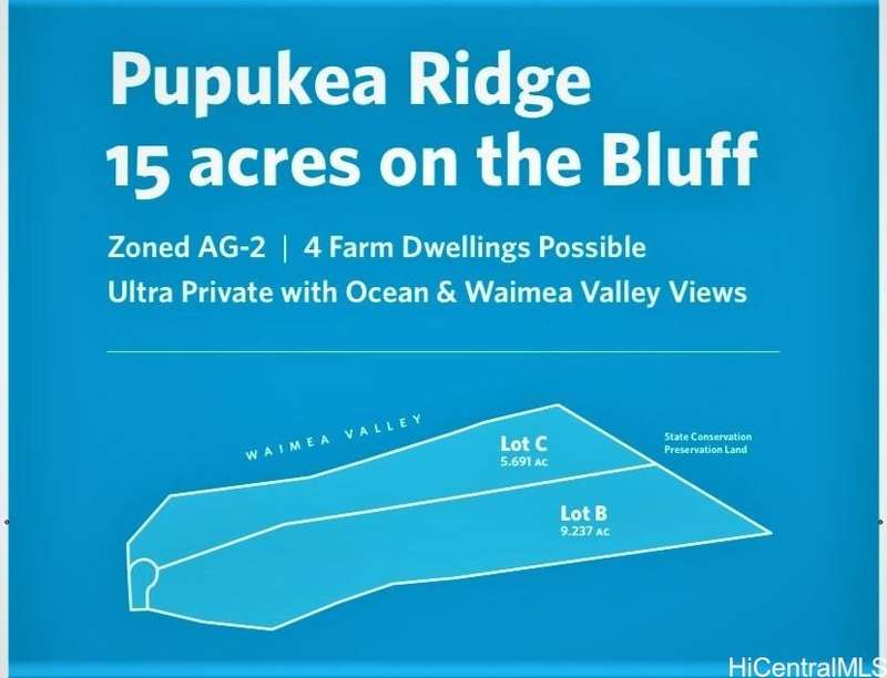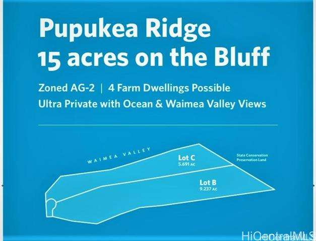 Among the last of its kind available, this undeveloped bluff/ridge lot in prestigious Pupukea is a rare opportunity for a discerning buyer. This ridge line, previously protected from development, is available for purchase. Preserve breathtaking ocean and mountain views for generations to come. Privacy is the norm throughout all 15± acres thanks to borders shared with State conservation land in front and Waimea Valley on the west. Tucked between dramatic mountains and views of deep blue waters of the Pacific, this lot is an impeccable blank canvas for your own tropical escape. Dream up a paradise of your design above Waimea Valley and make the most of jaw-dropping panoramic views. With potential to develop up to four dwellings & AG structures.