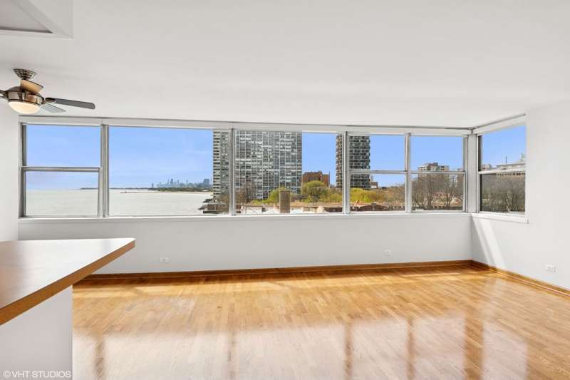 Residence 6V will not disappoint. Enjoy unobstructed views of Lake Michigan, Downtown City Skyline, Navy Pier, fireworks, Edgewater Beach, completely breathtaking from southwest corner Residence sun-drenched with natural sunlight. Residence 6V, renovated features formal entry, wood laminate floors throughout entire unit including bedroom, bathroom, with pedestal sink, new toilet, medicine cabinet, shower glass, tub/ shower combined, gracious bedroom with built in Armoires for folded and hanging clothing storage. Open kitchen concept with beautiful scenic views, breakfast bar, all wood cabinetry, separate dining area, more than adequate living space. Newer windows. Roller shades throughout. Full amenity building features 24 hour doorstaff, onsite maintenance, management and engineering staff. Complete gym, roof top deck for 360 degree views, bicycle storage. Steps away from the Chicago Express bus and EL stop making this a very public transpiration friendly location to Downtown and Loyola University's Campus. Rent includes tangible items including cable, internet, and heat. Electricity is paid outside rent by Tenant. Building offers garage parking for additional fee. No storage with this unit. Renovated unit is available NOW, professionally deep cleaned and freshly re-painted. Parking available through the building at $158 per month, no waiting list
