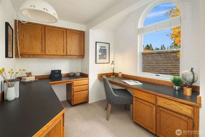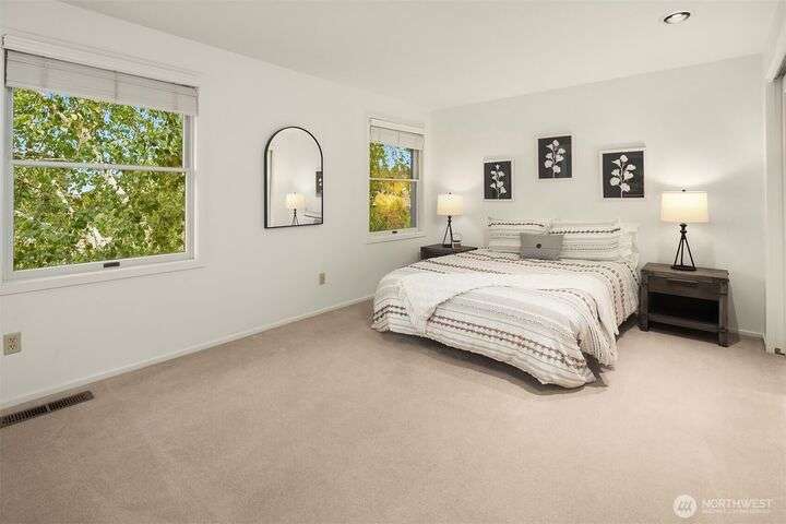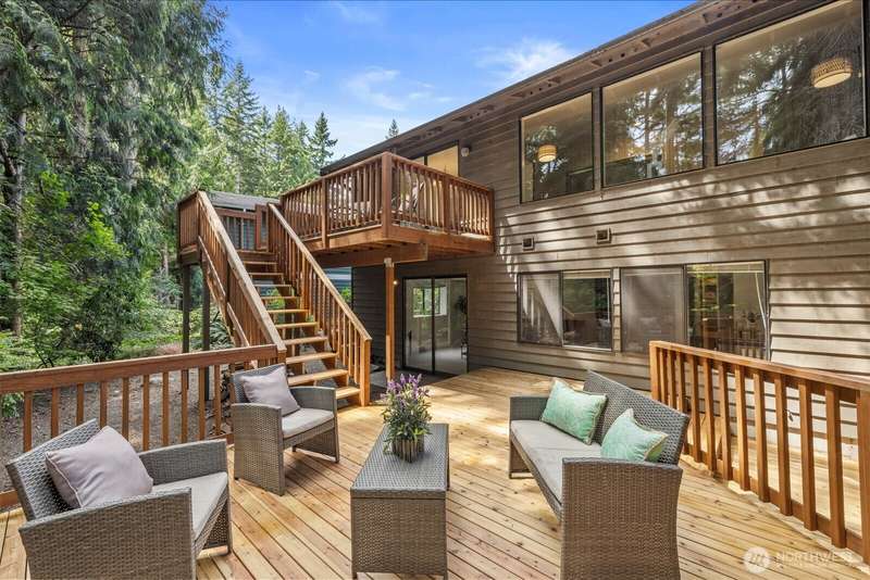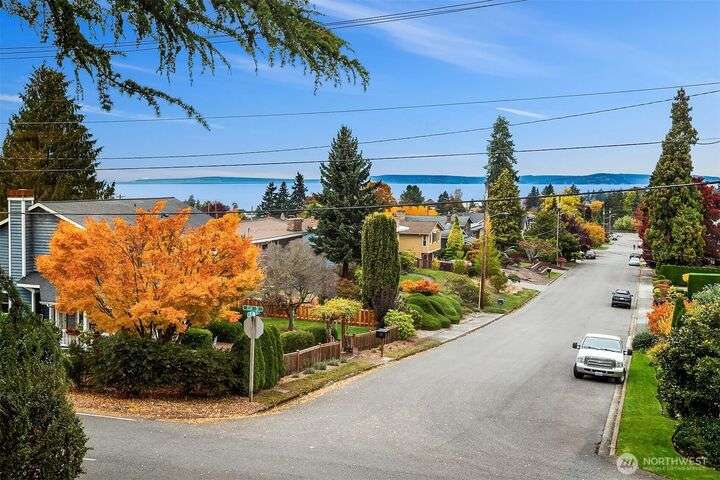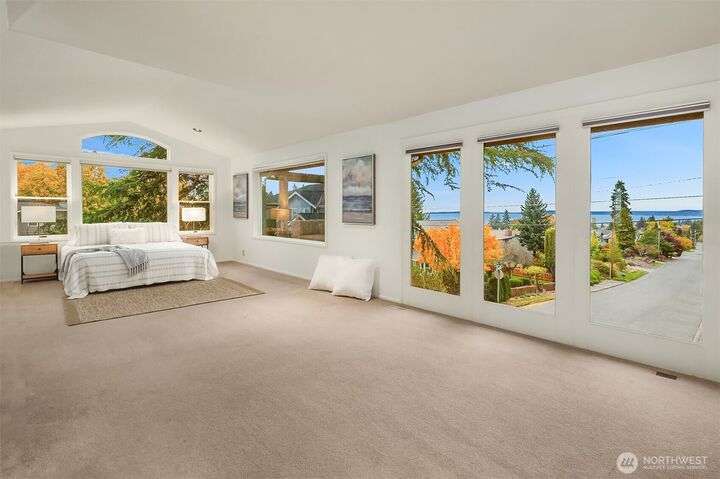 Coveted Edmonds Bowl living at the top of Elm Place this 2-bed home nestled on a corner lot = best views & privacy. Inviting soaring formal living room. Gas fireplace w/ brick surround, vaulted ceilings & hardwoods. Seamless flow to formal dining & kitchen. Enjoy Sound & Whidbey views while cooking + abundant storage. Casual dining space w/ sliding door opens to covered deck for yr-round enjoyment. Built-in buffets & pantry shelving. Guest bath on main. Upstairs features two Primary Suites options. One w/ an array of windows framing Sound, Whidbey, & Olympic views. Oversized! Enjoy a sitting area to unwind. 2nd suite has larger 5-pc bath w/ skylights, dual sinks & soaking tub. A/C. 2-car garage & welcoming front courtyard. Near it all.