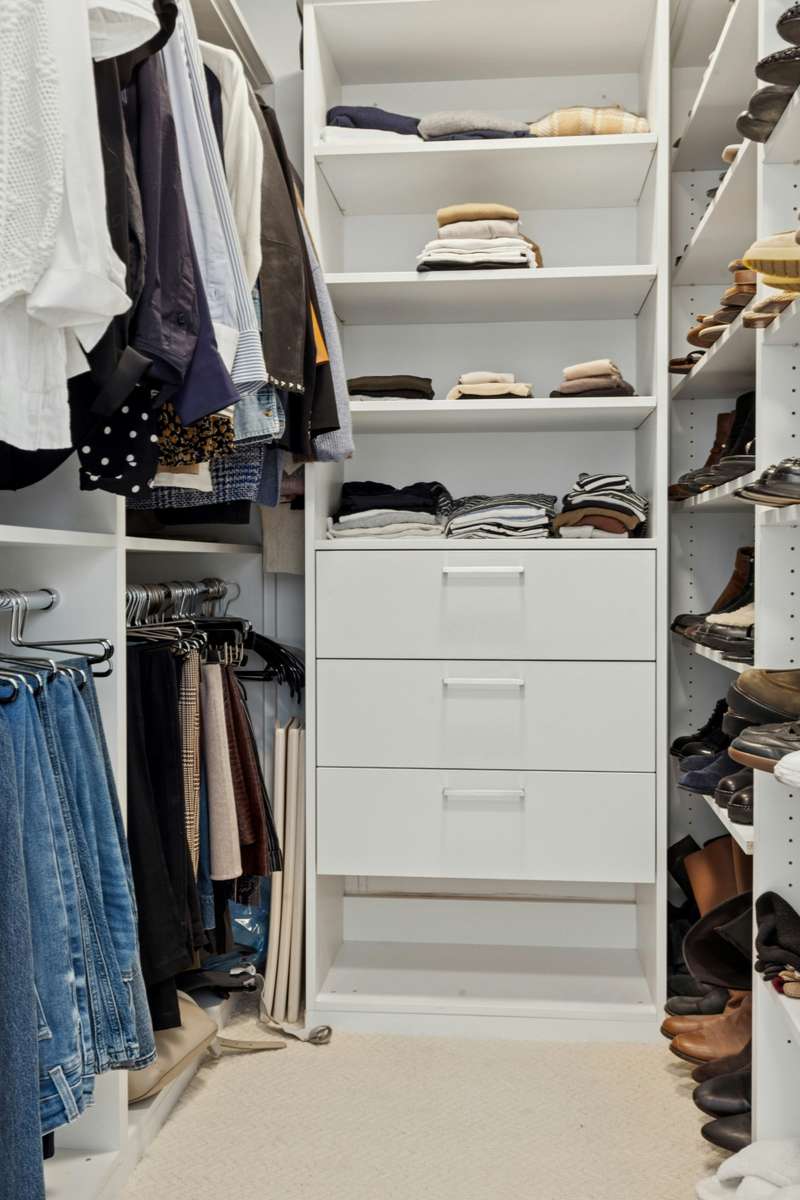 The serene primary suite offers a luxurious retreat with a walk-in closet, built-in floating bedside tables, and Vermont Danby marble window sills. Custom Shade ;Store treatments add comfort and privacy. A second, fully built-out closet provides additional storage. The en-suite, spa-like bath features a full Travertine slab shower, custom Glassos vanity and mirror, Dornbracht fixtures, and a Toto toilet.