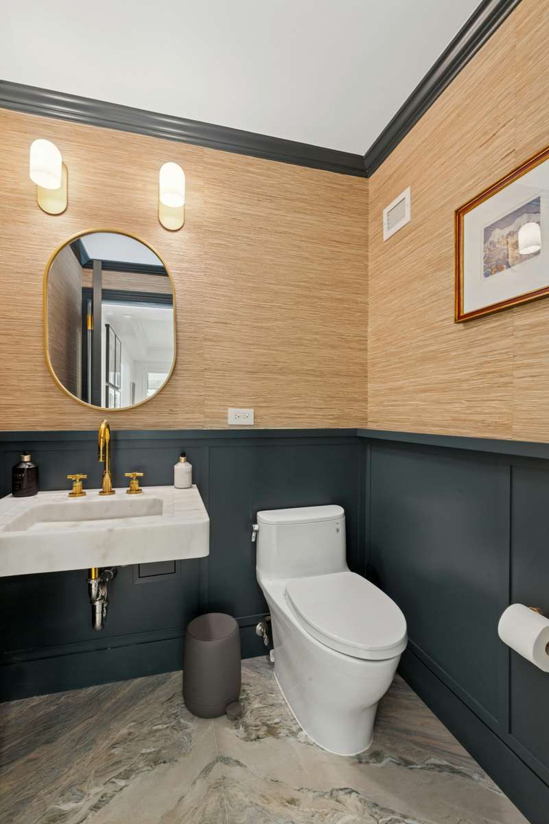 The spacious second bedroom easily doubles as a guest suite or home office, with its own en-suite bathroom showcasing a full Glassos slab shower, marble mosaic flooring, Dornbracht fixtures, and Toto toilet. Completing the home is a stunning Art Deco-inspired powder room just off the entry - a true statement space with a custom sink carved from a single stone and a dramatic bookmatched marble floor.