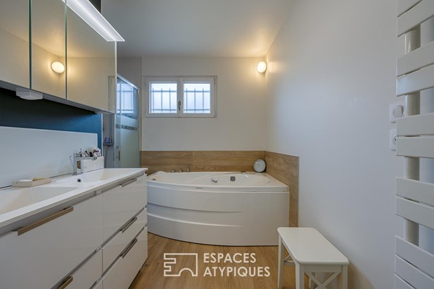 Upstairs, the attic has been converted and offers a bright and flexible space, with a shower room and toilet. This volume can accommodate two additional bedrooms, an office, or even a creative space, depending on your desires.