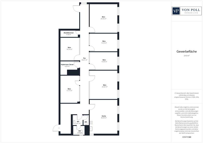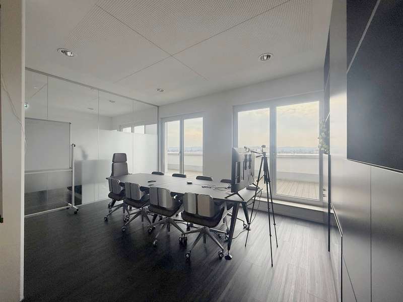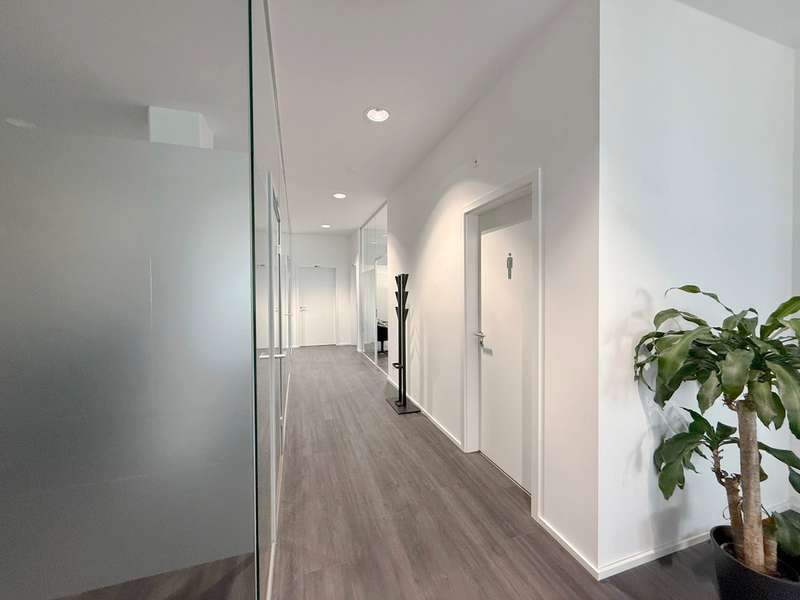This high-quality office unit extends over the 2nd floor and offers approx. 216 m² that can be used as office or meeting rooms. The office unit impresses with its high-quality furnishings, which create an efficient and pleasant working environment. The clear room height is a generous 3.00 m, and approx. 2.60 m in some areas, such as the sanitary facilities. The triple-glazed windows with external blinds ensure pleasant light regulation and high energy efficiency. White CPL interior doors and elegant glass doors in the glass walls emphasize the modern and light-flooded design of the rooms. Parking spaces can be rented for €50 per month. See this prestigious office space for yourself and arrange a viewing appointment. We look forward to your inquiry!