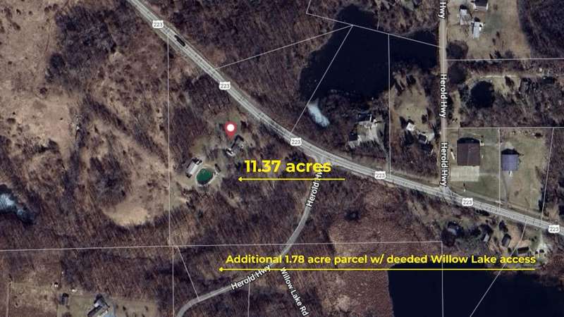 Beautiful Country Retreat on 13+ Acres with Lake AccessSet on 11.37 acres plus an additional 1.78-acre parcel, this 2,700 sq. ft. home offers country living with deeded access to Willow Lake. Updated in 2017, the home features 3 bedrooms, 2 full baths, a dining room with fireplace, living room wet bar, and a finished walk-out basement. Outdoors, enjoy a sandy-bottom pond with sandy beachfront, a beach house with power and loft, and trails connecting food plots and hunting blinds. A large pole barn with water, 220 electric and lean-to. This property combines comfort, recreation, and natural beauty in one perfect package.