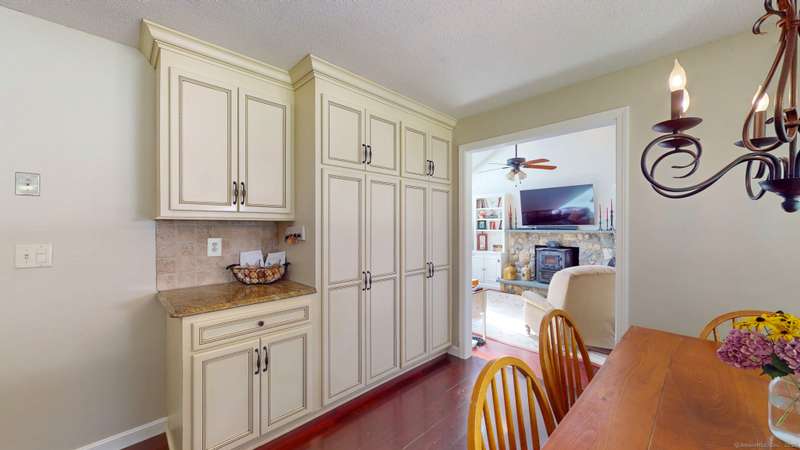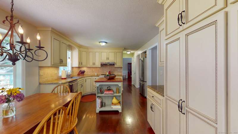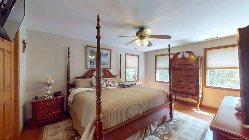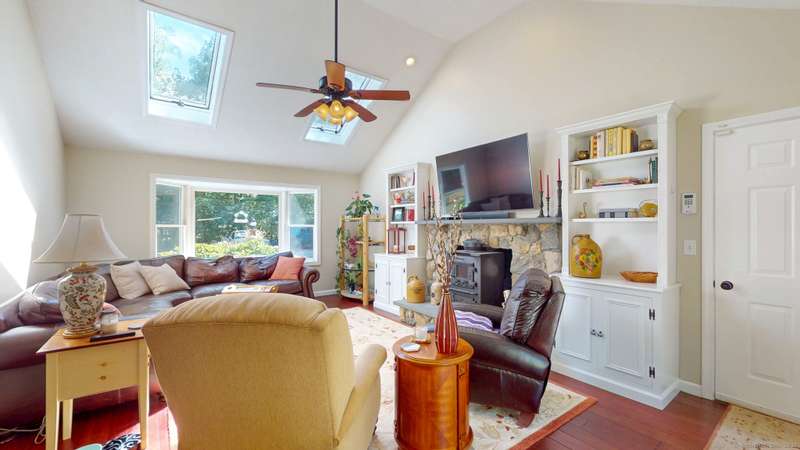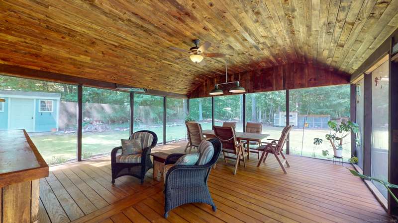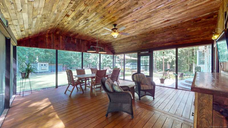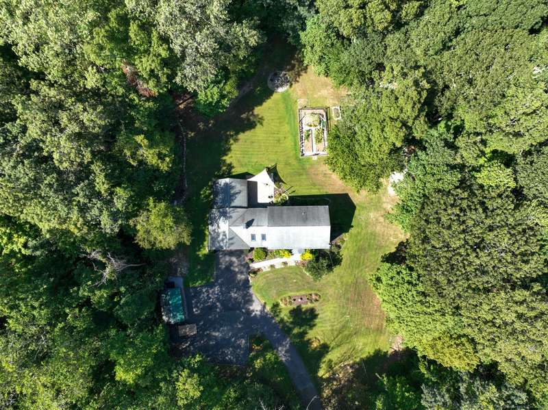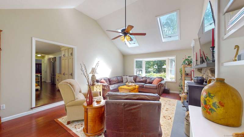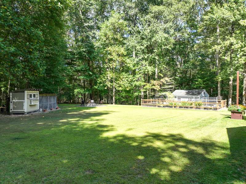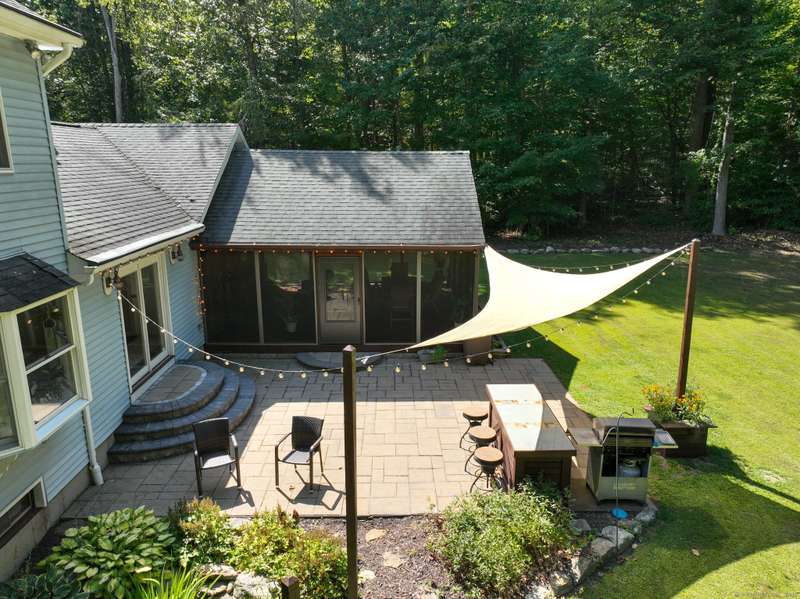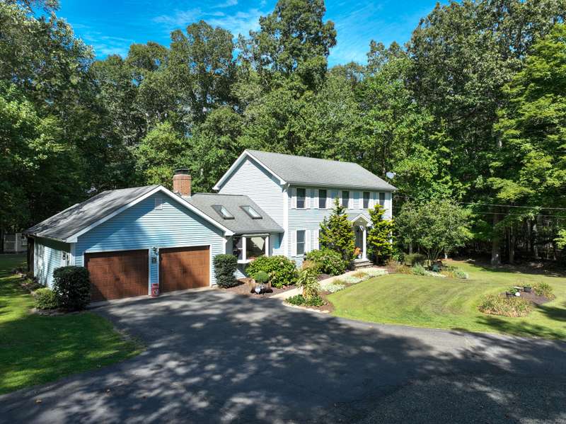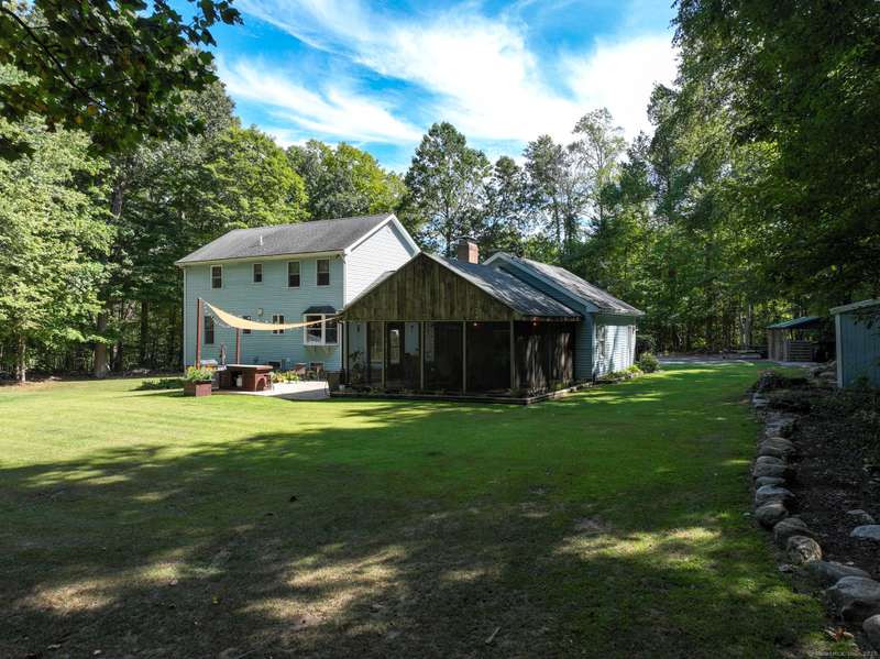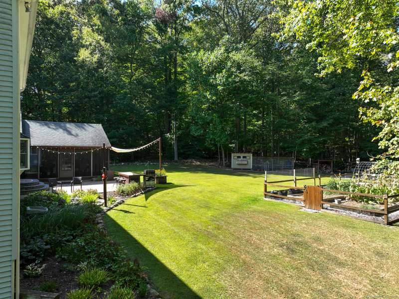 This is not your typical colonial! Set on 3.3 acres bordering state forest, this home offers both privacy and versatility. The recently remodeled eat-in kitchen is the heart of the home, while the family room-featuring skylights, a bow window perfect for plants or pets, and a wood-burning fireplace with insert-creates a warm and inviting space. The first floor also includes a formal living room, dining room, and office, giving you plenty of options for everyday living. Upstairs, each of the three bedrooms boasts a walk-in closet. The primary suite includes a full bath with air jet tub. Hardwood floors run throughout, and the lower level includes a finished room for even more flexibility. The outdoor space is truly exceptional-you may never want to go inside! Enjoy a 20x20 screened-in porch with ceiling fan and TV, a beautiful patio with koi pond, and an amazing firepit for gatherings. Gardeners will appreciate the fenced raised-bed garden, while hobbyists will love the detached garage