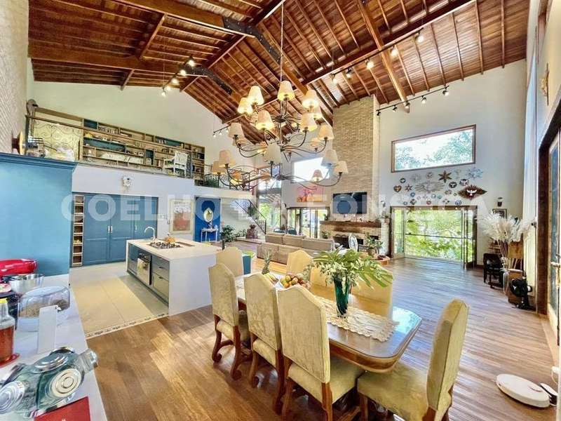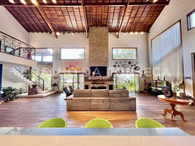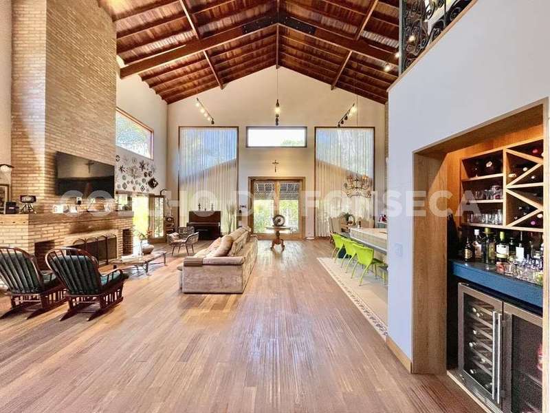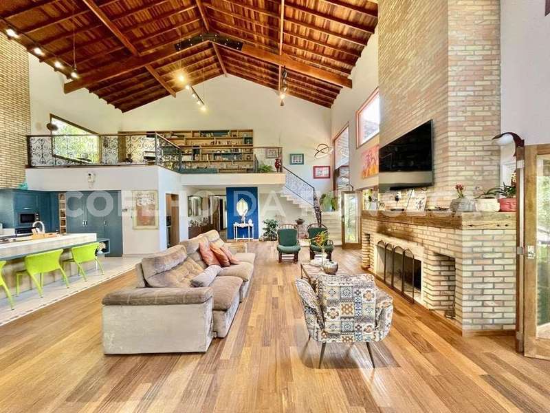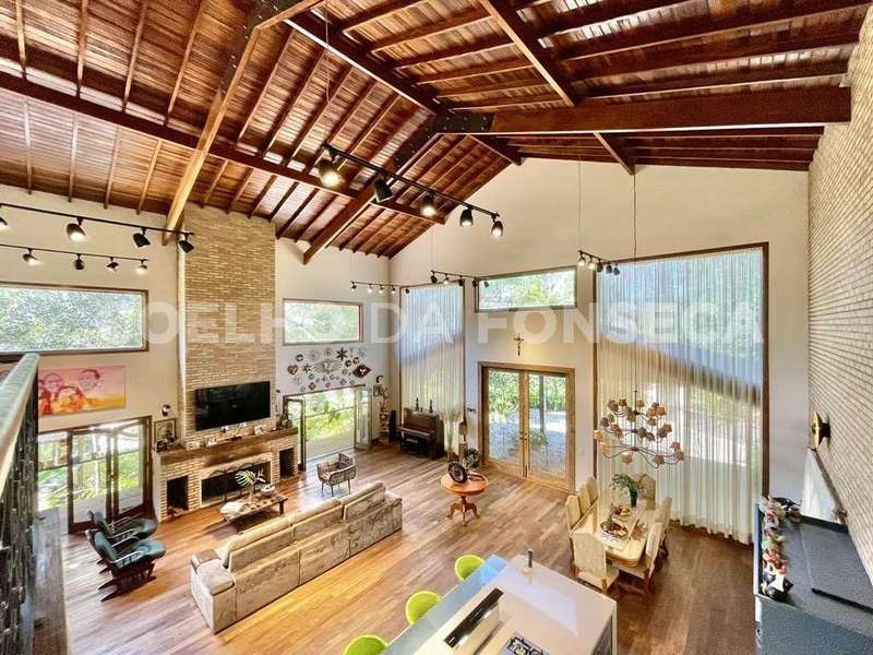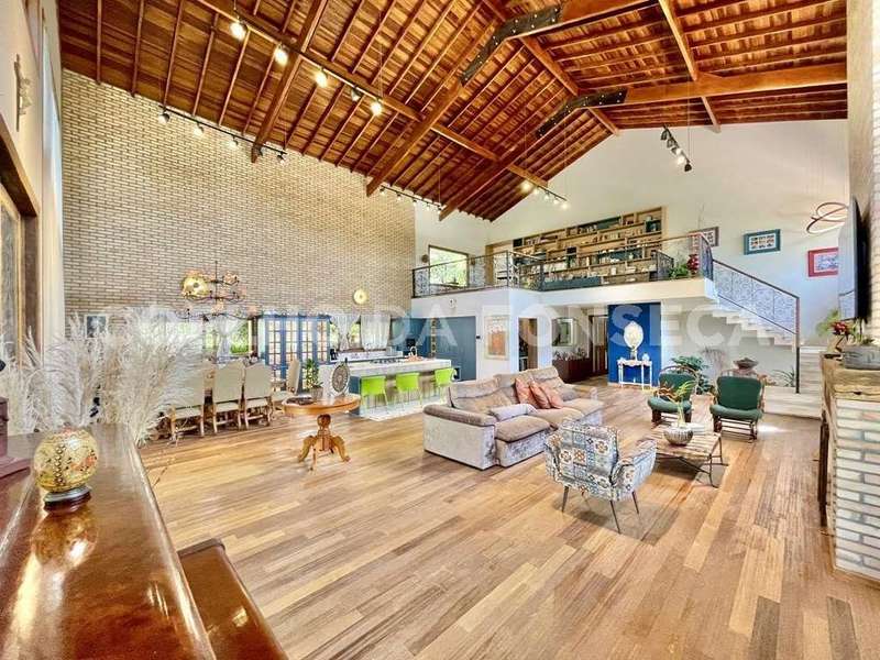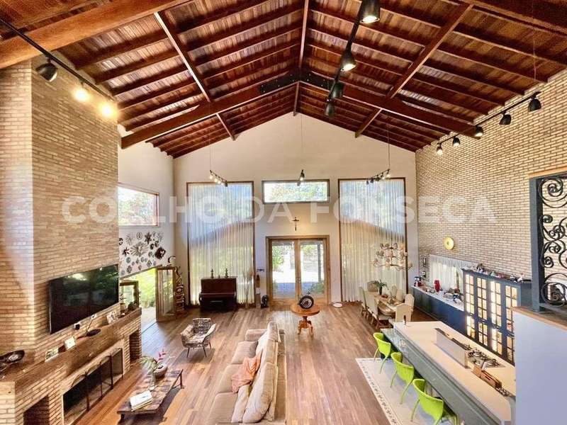 Linda Casa de Campo Rústica, contemporânea e impecável com excelente acabamento. Casa com 7 Dormítórios sendo 5 suites com armários e portas balcão grandes e varandas integradas. Pisos em Madeira de demolição, porcelanato e cerâmica. Jardim com Paisagismo formado por árvores Frutíferas , Telhas em concreto. Projeto de gesso e Iluminação. Casa envidraçada e Iluminada. Hall Social de entrada com Porta dupla em Madeira trabalhada vidro e Ferro. Piso Superior 3 suites com closets e ar condicionado. Piso Terreo com 4 dormitórios sendo 2 Suites com closets. Living com pé direito duplo para 6 ambientes, voltados para grande varanda com guarda corpo em Madeira.