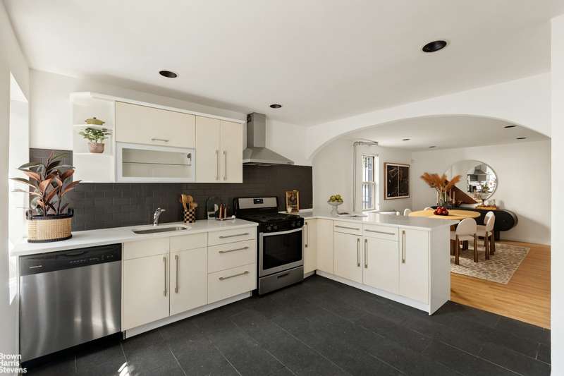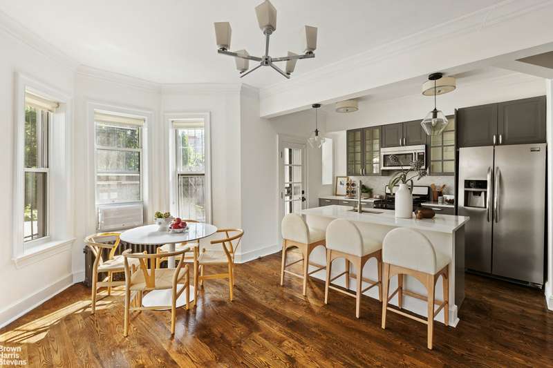 The lower duplex offers 4 bedrooms and 2 bathrooms. ; The unit spans two spacious levels and opens into a sun-filled living room with gleaming hardwood floors and graceful archways that nod to the home's original architectural details. The updated eat-in kitchen is equipped with top-of-the-line stainless steel appliances, including a GE refrigerator and Frigidaire dishwasher, complemented by a bright breakfast area that enjoys natural light from oversized windows. A convenient in-unit washer and dryer are thoughtfully tucked away just off the kitchen. The first bedroom is located on the main level, while upstairs you'll find three additional bedrooms, each offering custom storage, hardwood floors, and ample space. The front-facing primary bedroom is a standout, featuring exposed brick, a decorative fireplace mantel, and a distinctive angled wall of windows that adds charm and architectural interest.