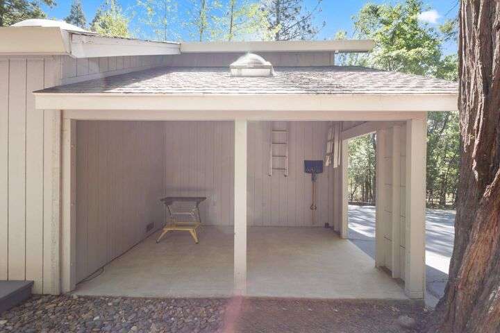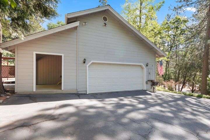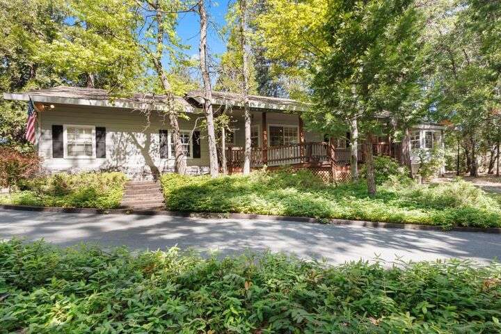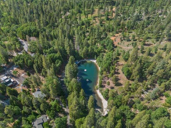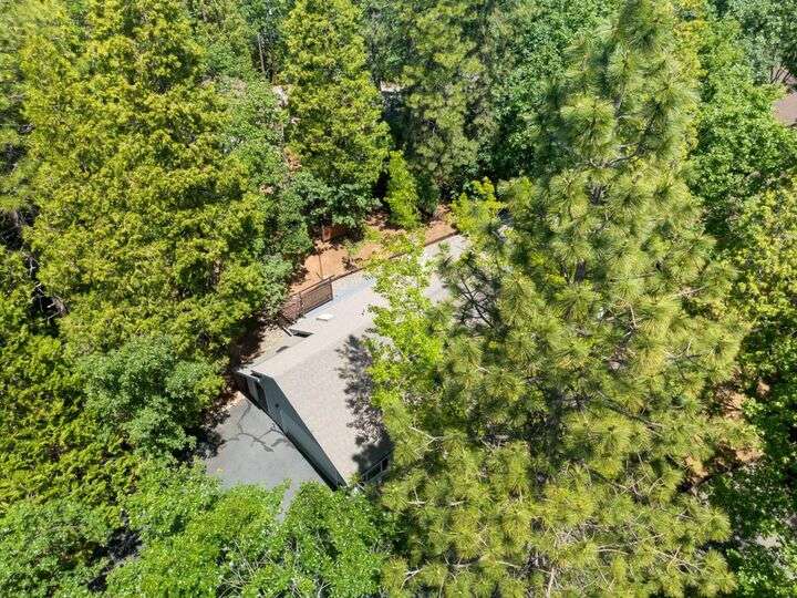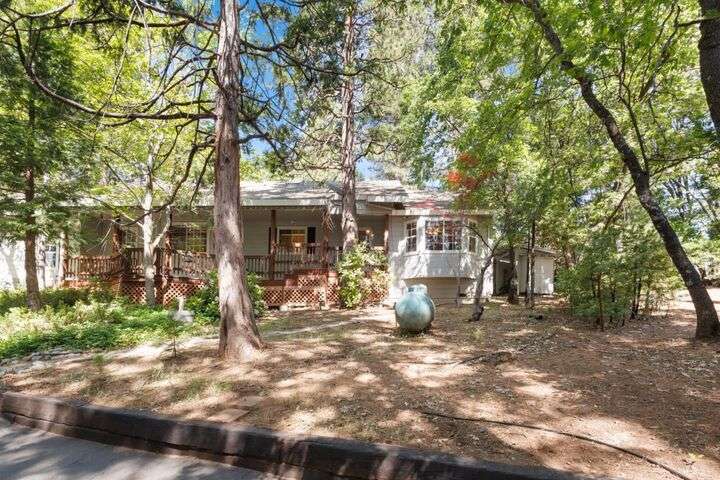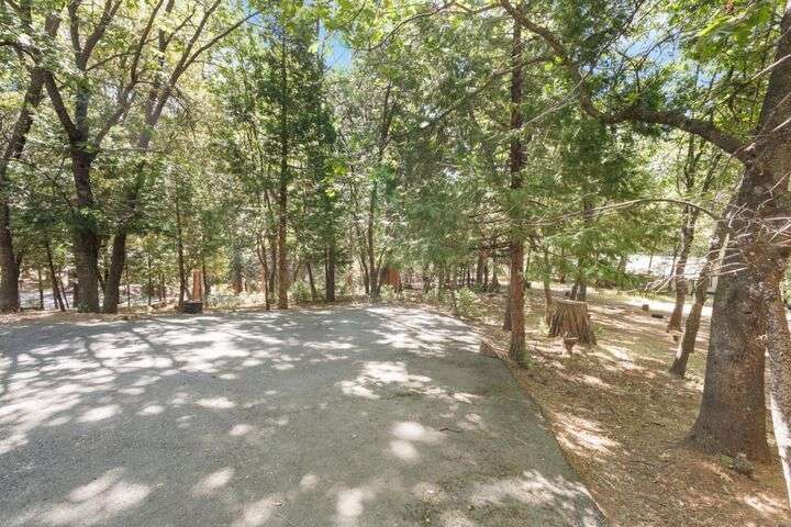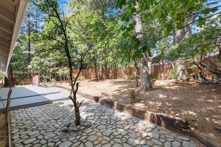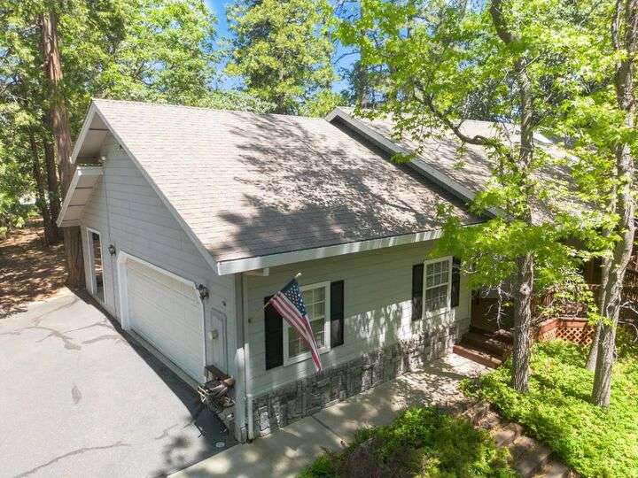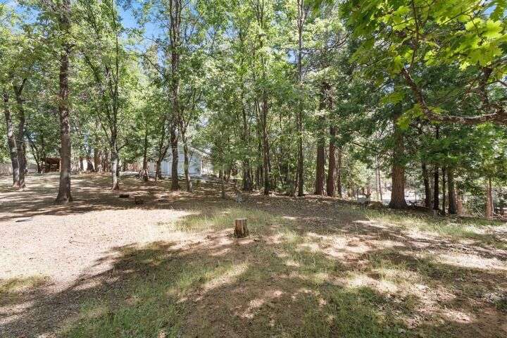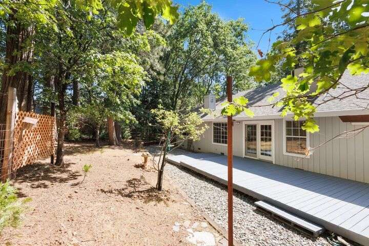 Escape to Cedar Ridge with this beautifully maintained single story mountain retreat, where comfort meets the beauty of the Sierra Foothills. Nestled on a rare double lot totaling 24,642 sqft (0.57 acres), this home offers 3 bedrooms, 2 bathrooms (plus a garage urinal), and 1,780 sqft of inviting living space. Inside, vaulted ceilings and five skylights fill the open layout with natural light, while the kitchen overlooks the living room, perfect for entertaining or everyday living. Large windows frame peaceful views of the expansive lot, bringing the surrounding greenery and fresh mountain air inside. Step outside to a private deck, pre wired for a jacuzzi, ideal for relaxing evenings or gatherings under the stars. The primary suite features a cedar lined walk in closet and double sinks, while the attached two car garage adds convenience. Enjoy nearby water trails and exclusive private access to Dogwood Lake, all just steps from your door. Whether for a weekend getaway or full time residence, this single level retreat offers light, space, and Sierra charm on a fully combined, generously sized lot.
