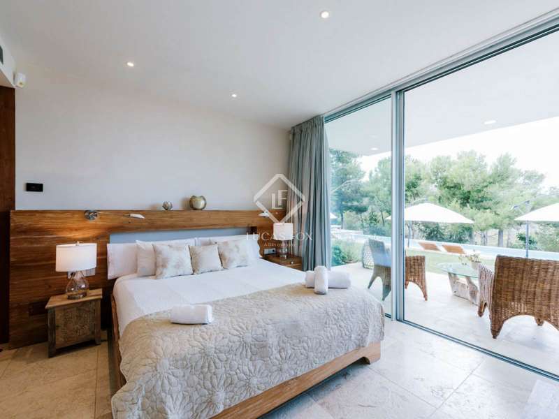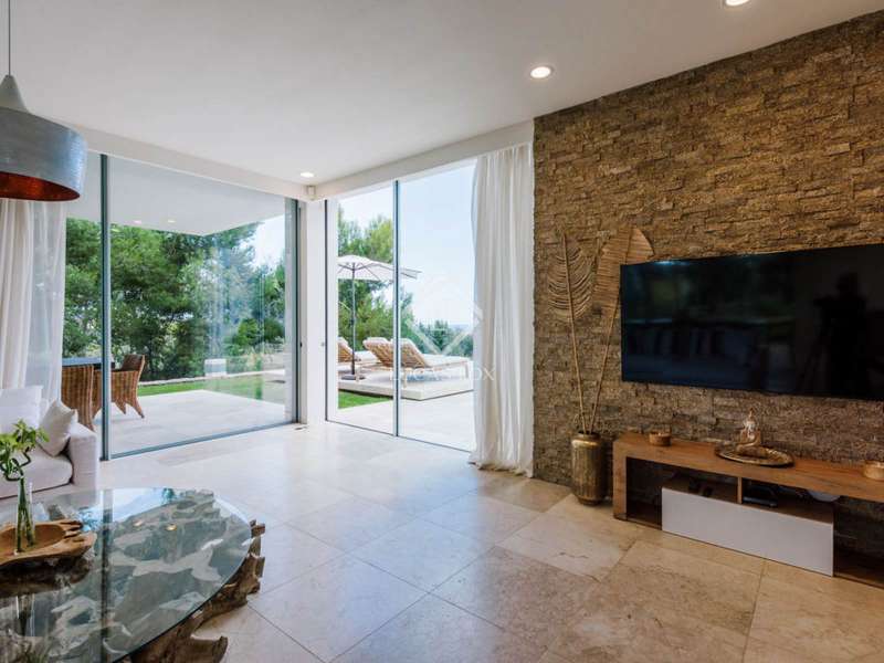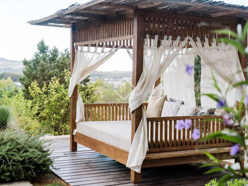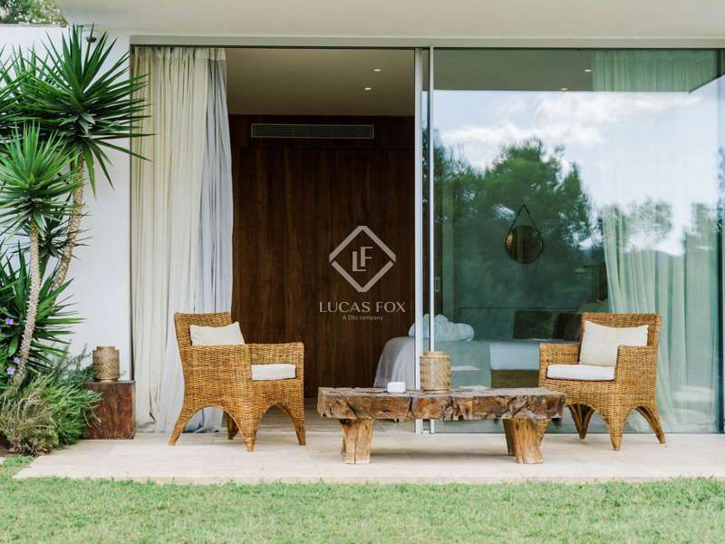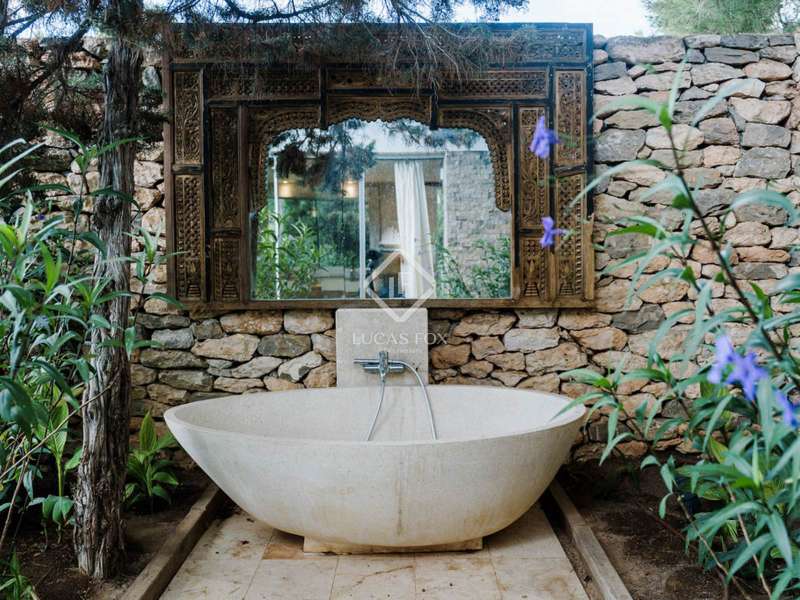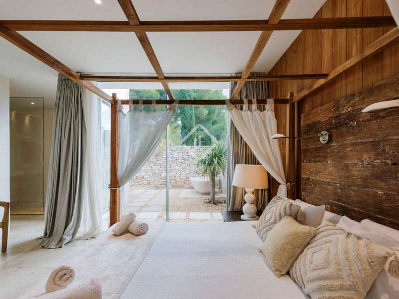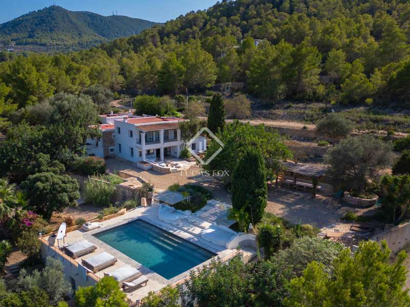 Perched high in the hills of Benimussa, this stunning 5-bedroom villa offers absolute privacy, panoramic views over San Antonio Bay, and some of the most unforgettable sunsets on the island. Designed with elegance, comfort, and Mediterranean charm, the property presents a unique retreat as well as a high-value investment opportunity in Ibiza. Generous single-level living encompasses 440 m² of main interiors, complemented by additional annexes for a total of 585 m² on a 21,000 m² plot. The property boasts five luxury bedrooms, each with en-suite bathroom and direct garden access, including three with outdoor bathtubs, while one functions as a private guest house. Expansive living areas feature a large lounge, dining room, and fully equipped Miele kitchen with direct outdoor access. Mature gardens with centuries-old olive trees and pines frame multiple terraces, shaded chill-out corners, and a covered outdoor dining area. Two swimming pools, a main pool of 68 m² and a secondary plunge pool, provide ample space for relaxation, alongside an exclusive rooftop terrace with a covered chill-out zone and sweeping panoramic views. Premium comforts include underfloor heating, air conditioning, a Sonos sound system, fibre-optic internet, perimeter alarm with 12 cameras, and refined finishes throughout. Sustainability is ensured with a private water well and solar panels that provide significant energy self-sufficiency. This impressive luxury villa with a tourist licence would make an exceptional family home, holiday property or lucrative rental investment. Please contact us for further information.