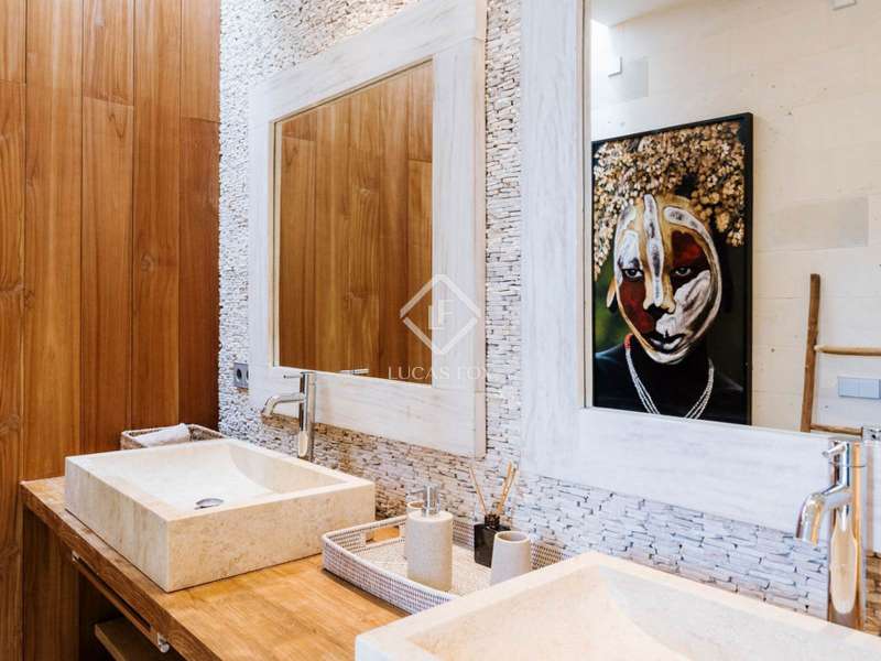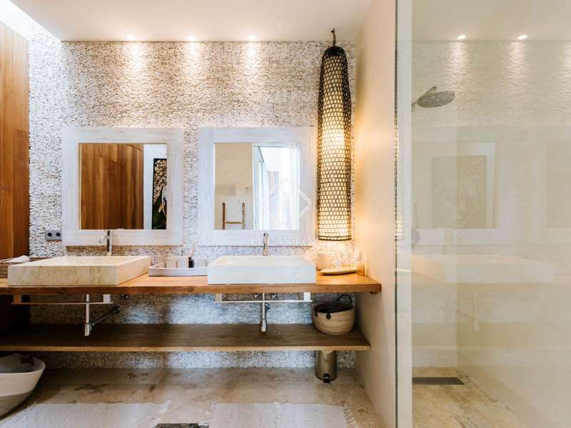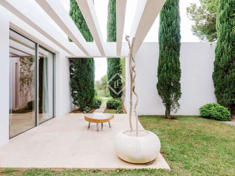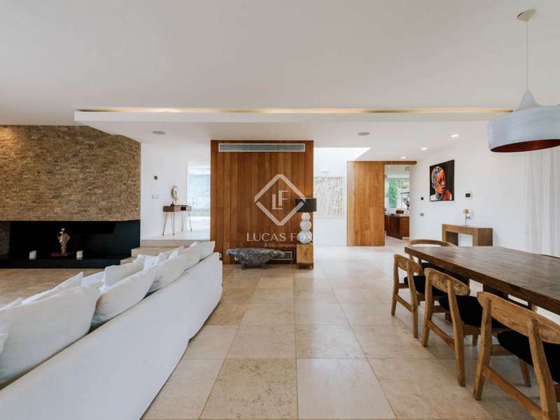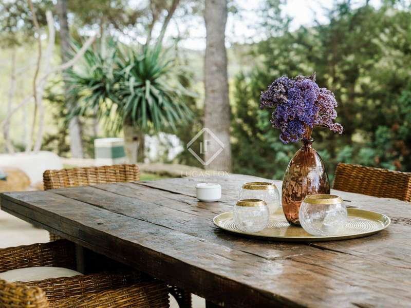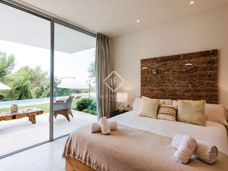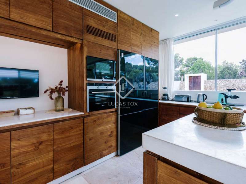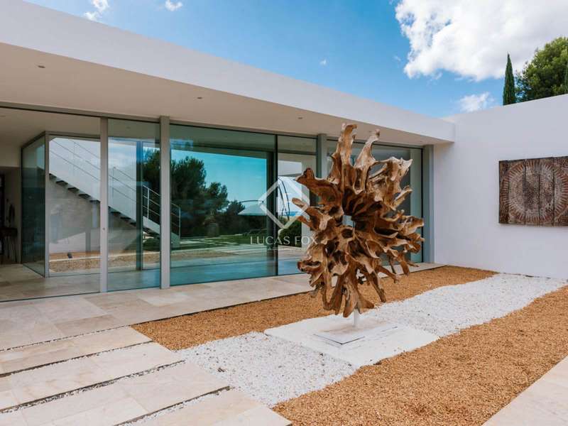 Perched high in the hills of Benimussa, this stunning 5-bedroom villa offers absolute privacy, panoramic views over San Antonio Bay, and some of the most unforgettable sunsets on the island. Designed with elegance, comfort, and Mediterranean charm, the property presents a unique retreat as well as a high-value investment opportunity in Ibiza. Generous single-level living encompasses 440 m² of main interiors, complemented by additional annexes for a total of 585 m² on a 21,000 m² plot. The property boasts five luxury bedrooms, each with en-suite bathroom and direct garden access, including three with outdoor bathtubs, while one functions as a private guest house. Expansive living areas feature a large lounge, dining room, and fully equipped Miele kitchen with direct outdoor access. Mature gardens with centuries-old olive trees and pines frame multiple terraces, shaded chill-out corners, and a covered outdoor dining area. Two swimming pools, a main pool of 68 m² and a secondary plunge pool, provide ample space for relaxation, alongside an exclusive rooftop terrace with a covered chill-out zone and sweeping panoramic views. Premium comforts include underfloor heating, air conditioning, a Sonos sound system, fibre-optic internet, perimeter alarm with 12 cameras, and refined finishes throughout. Sustainability is ensured with a private water well and solar panels that provide significant energy self-sufficiency. This impressive luxury villa with a tourist licence would make an exceptional family home, holiday property or lucrative rental investment. Please contact us for further information.