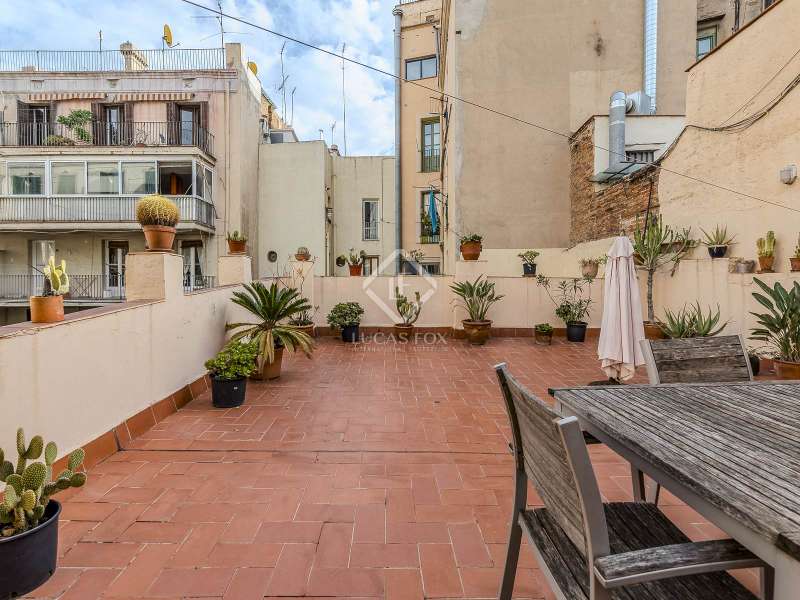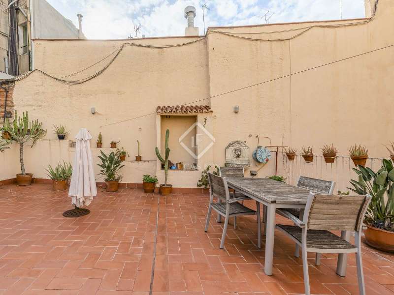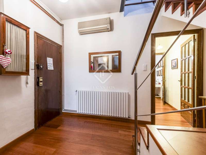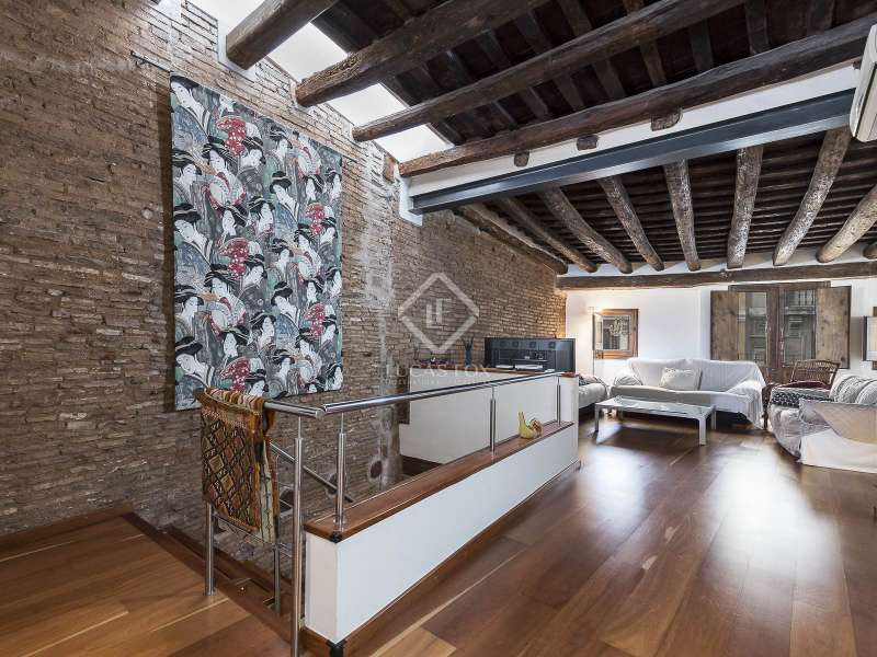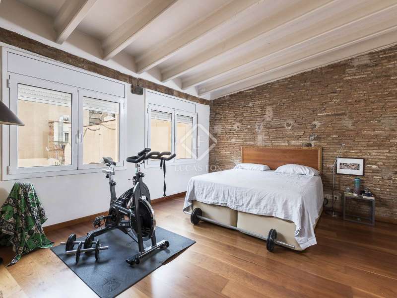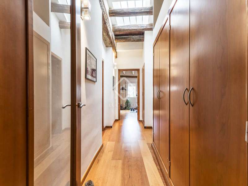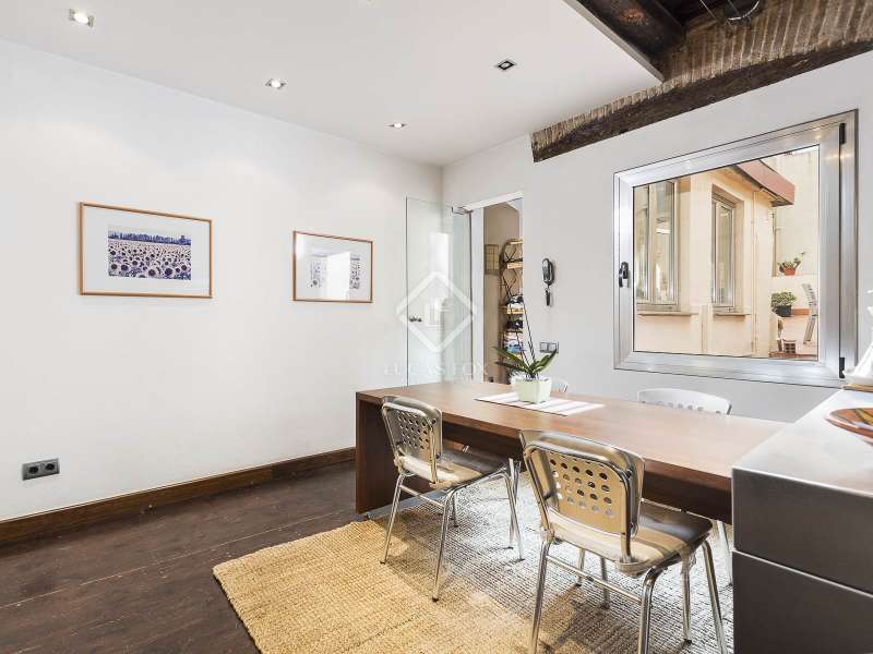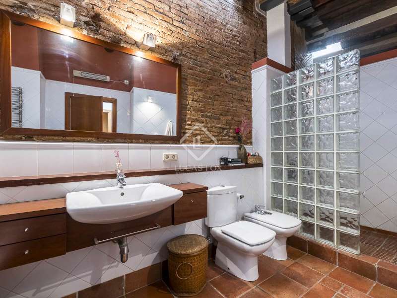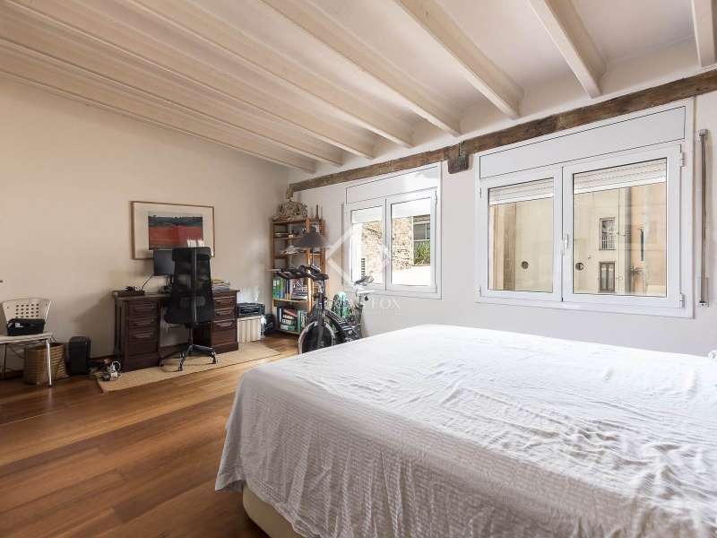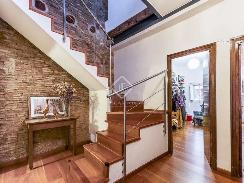 This spectacular duplex located in the heart of Barcelona combines the charm of the original elements with all modern comforts. It has two independent levels, each with its own entrance. The first floor includes two double bedrooms, which are very bright thanks to their large windows. It also has a full bathroom and a study with its own bathroom . From here we access a renovated open kitchen with designer finishes, which has access to the property's large terrace. A staircase from the entrance hall leads us to the second floor , where we have a spacious dining room living room that is very cozy due to its exposed wooden beams and a fireplace that gives it a rustic touch. This floor is completed with the large master suite with a huge dressing room, a full bathroom and beautiful views of the property's terrace. The property is equipped with radiator heating and ducted air conditioning.