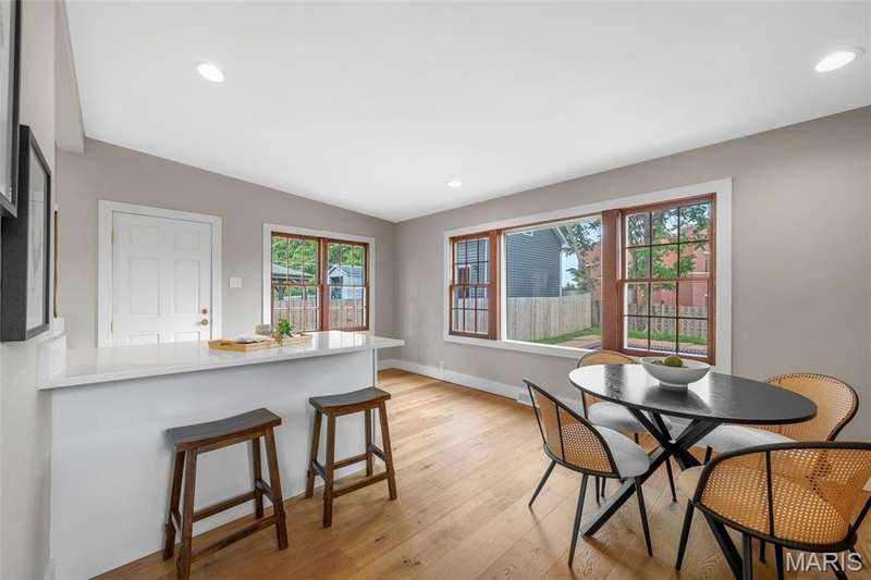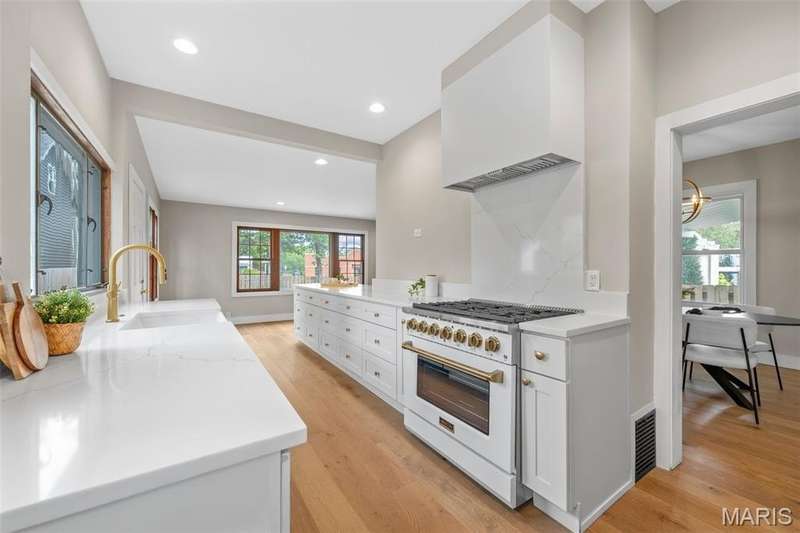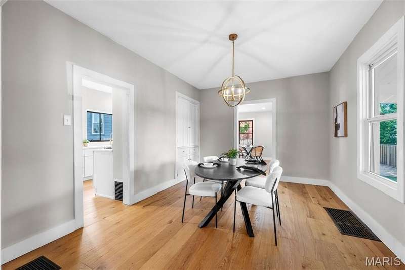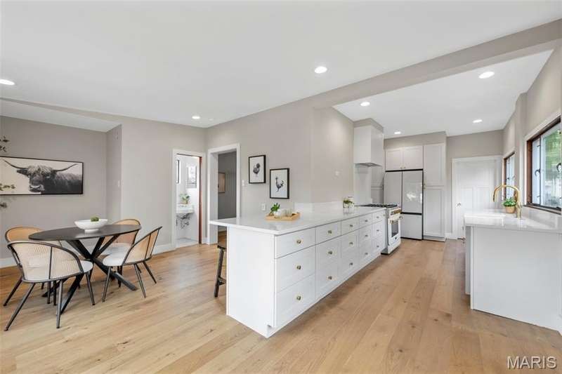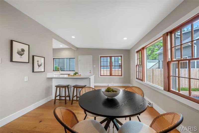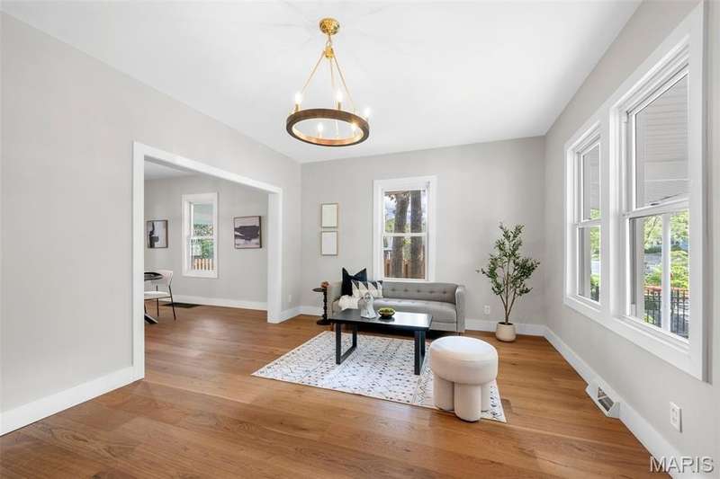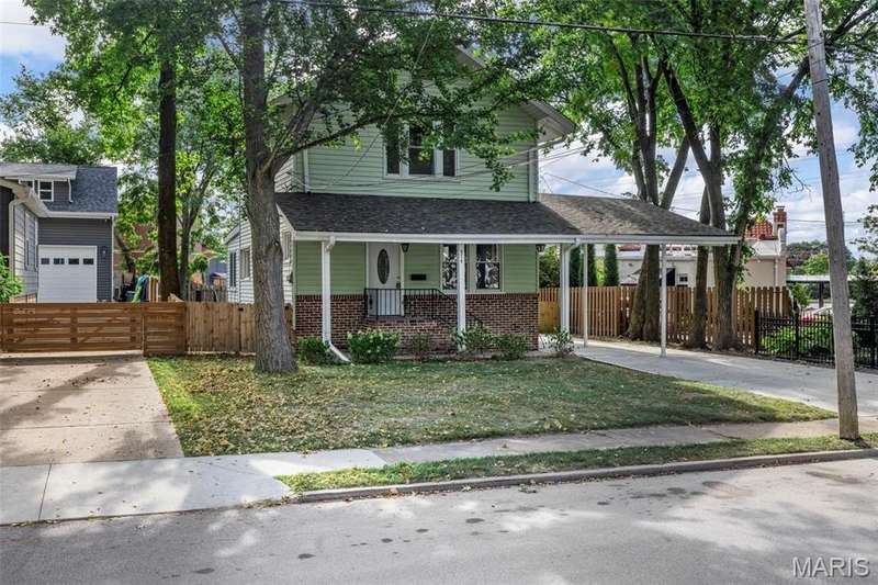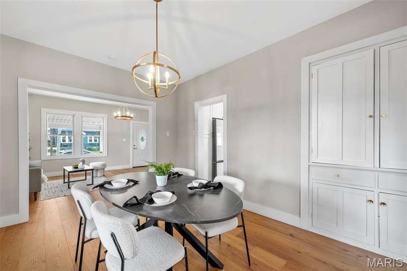 Webster Groves Gem with walkability to coffee and shops! Modern finishes on an established street allow for character and updates to blend seamlessly. Tall ceilings, fresh paint, wide trim, and luxury lighting are found throughout. The living room flows into a fabulous dining/flex space with original built-ins and a powder bath. No expense was spared in the kitchen - the custom cabinets, solid white tops and beautiful gold fixtures make this kitchen magazine worthy. The appliances are also top of the line with a gas stove, dishwasher and glass white fridge. The breakfast room offers a casual eat in kitchen with an island bar option and large picture window. Upstairs you will find 2 generous bedrooms, ample storage and a full luxury marble bath. Paved driveway, attached carport, newly sodded and fenced lot plus sidewalks to take you to your favorite Webster shops.