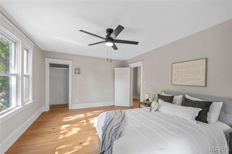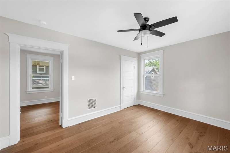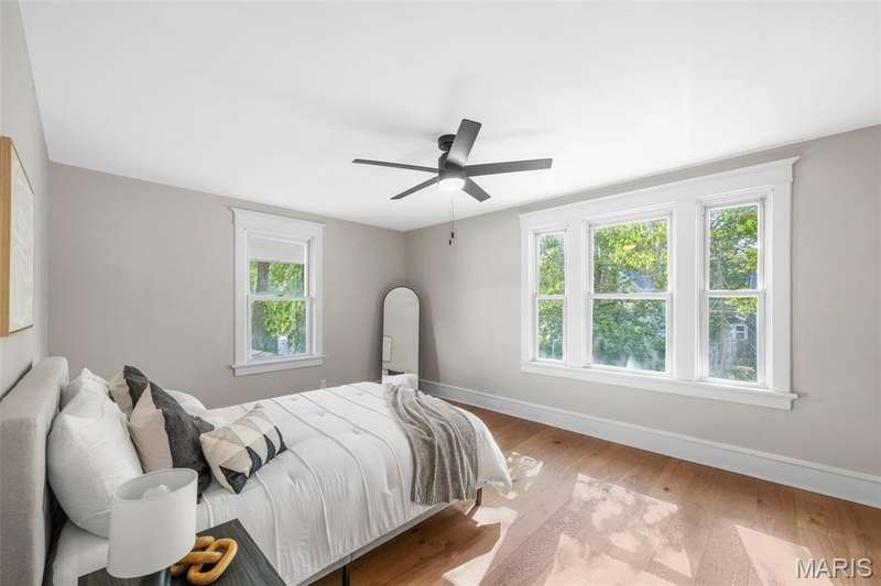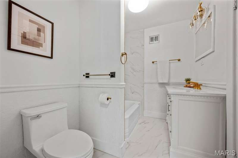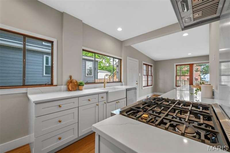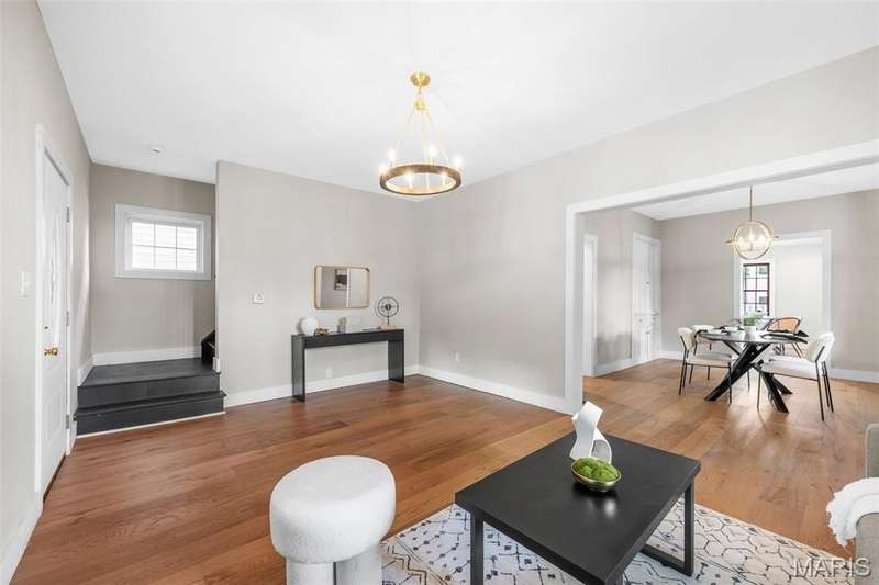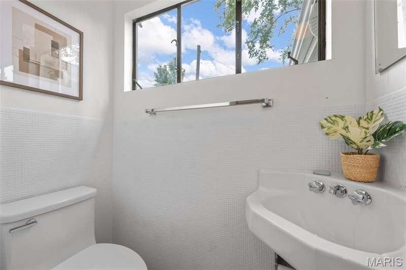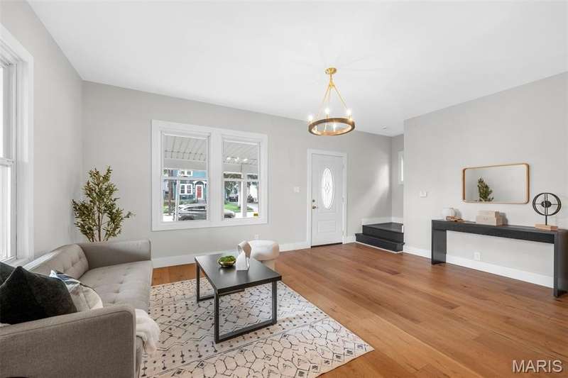 Webster Groves Gem with walkability to coffee and shops! Modern finishes on an established street allow for character and updates to blend seamlessly. Tall ceilings, fresh paint, wide trim, and luxury lighting are found throughout. The living room flows into a fabulous dining/flex space with original built-ins and a powder bath. No expense was spared in the kitchen - the custom cabinets, solid white tops and beautiful gold fixtures make this kitchen magazine worthy. The appliances are also top of the line with a gas stove, dishwasher and glass white fridge. The breakfast room offers a casual eat in kitchen with an island bar option and large picture window. Upstairs you will find 2 generous bedrooms, ample storage and a full luxury marble bath. Paved driveway, attached carport, newly sodded and fenced lot plus sidewalks to take you to your favorite Webster shops.