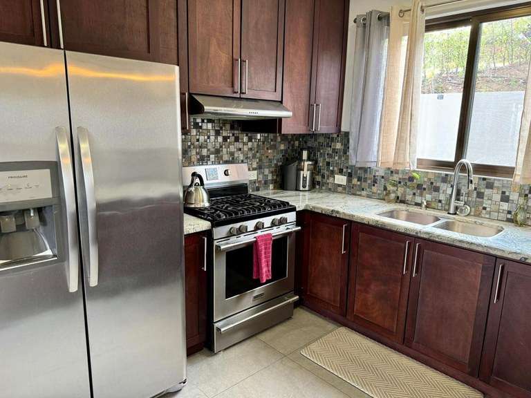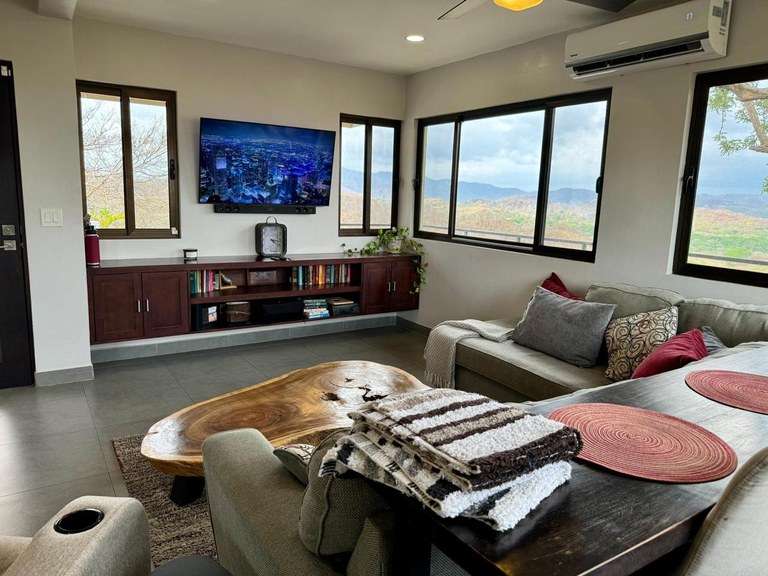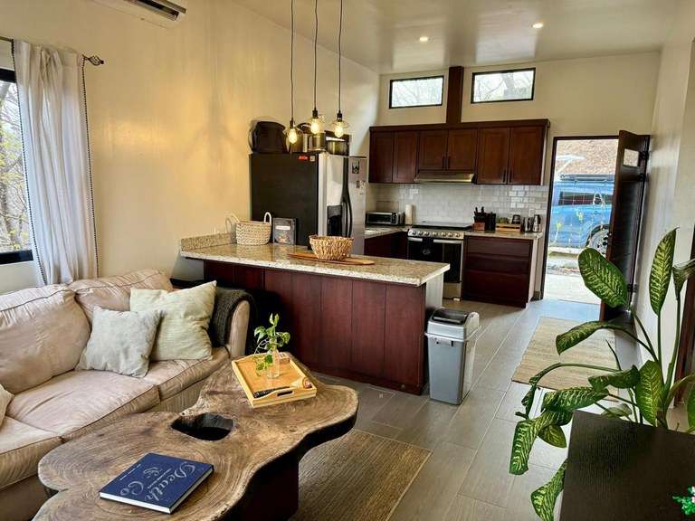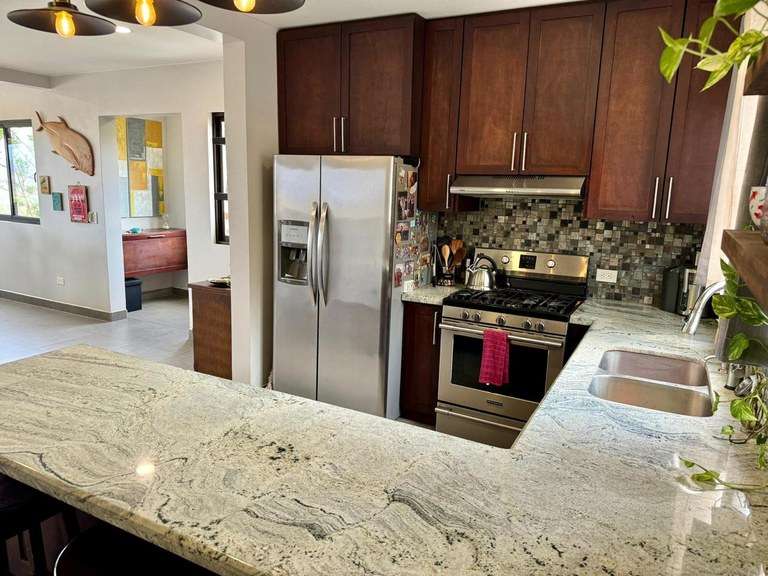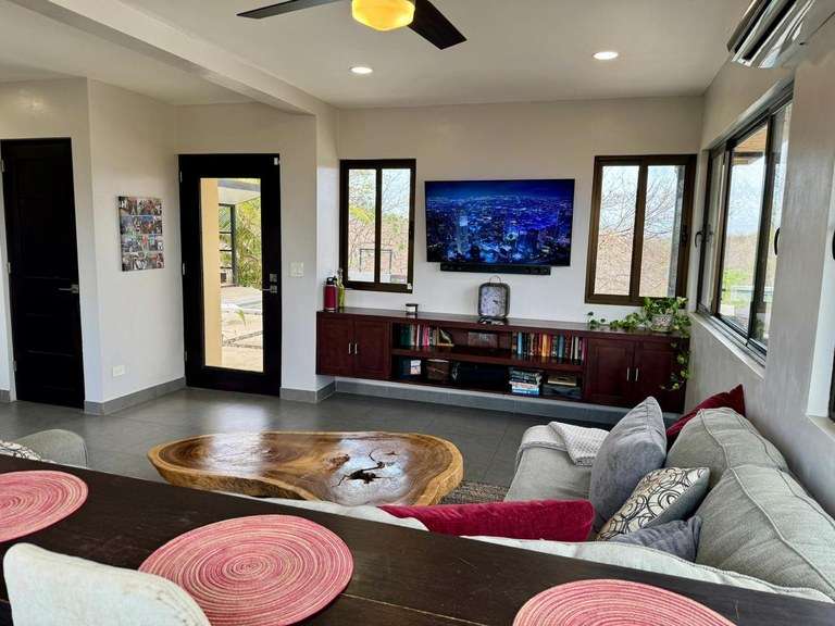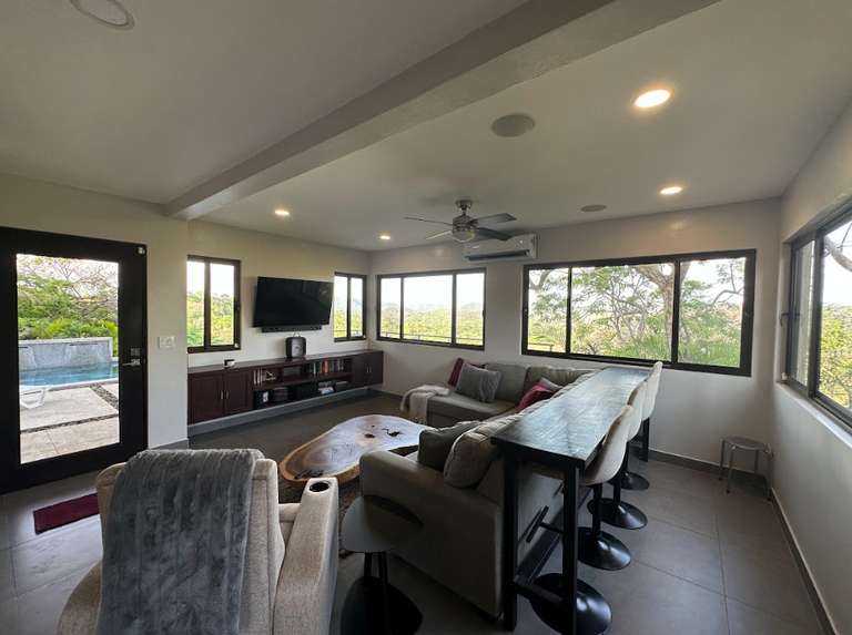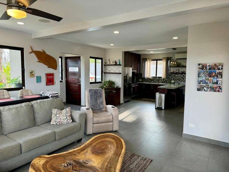 Outside, the property is adorned with conveniences like an electric gate, automatic sprinkler system, and exterior lighting, enhancing security and convenience. The mature gardens add a touch of natural beauty, complemented by a gas BBQ area perfect for outdoor gatherings. The highlight of this property is the expansive pool with an infinity edge and a cascading waterfall, inviting you to relax and unwind in style. Situated just a 2-3 minute drive from Playa Grande beach, renowned for its world-class surfing, this location offers the best of coastal living and recreation.