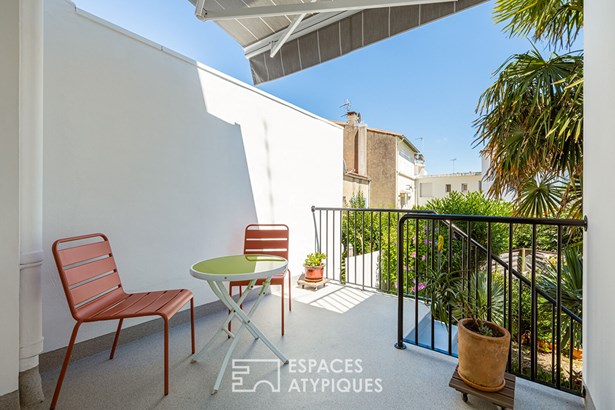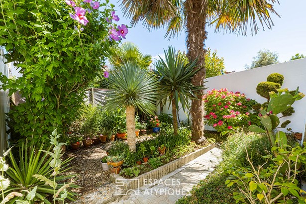 Outside, the enclosed and carefully planted garden provides peace and privacy. Palm trees, bay trees, yuccas, and flower beds create a lush setting reminiscent of an artist's garden. In perfect continuity with the living room, the terrace becomes the ideal place to enjoy sun-drenched moments.
