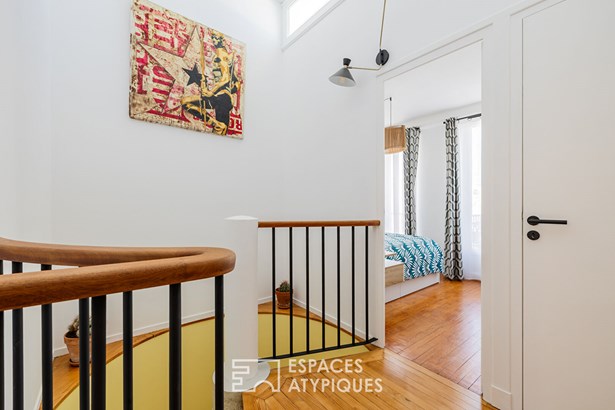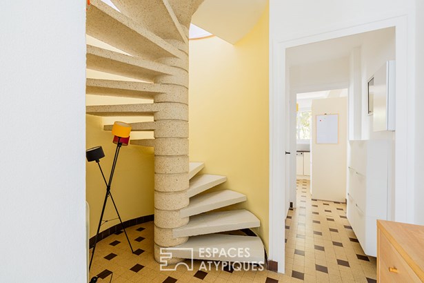 The charm is felt from the moment you enter. The living areas, located on the first level, are organized around a welcoming living room with a fireplace and large windows. The period flooring gives the property a warm and authentic atmosphere. Two bedrooms, covered in solid parquet, are located upstairs, with individual bathrooms. A loggia typical of Royan's modernist buildings pleasantly extends one of the spaces. The sculptural concrete spiral staircase is also an architectural highlight, a true backbone of the house. A vast basement completes the ensemble, offering interesting storage and development possibilities.