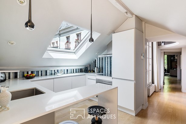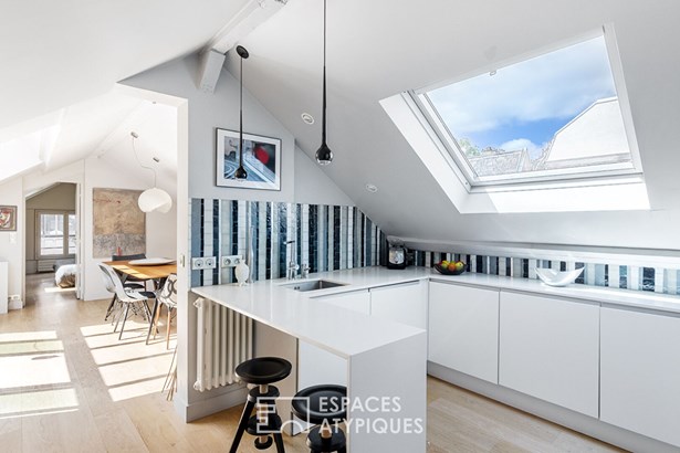 In the highly sought-after South Pigalle district, just off Rue des Martyrs, this 160.45 sqm (122.18 sqm Carrez) dual-aspect apartment is located on the second and top floor of a building with a caretaker via a staircase.