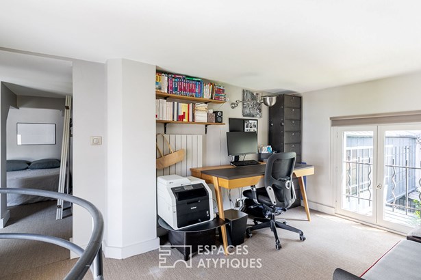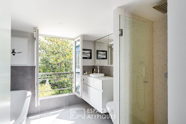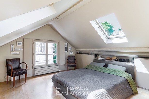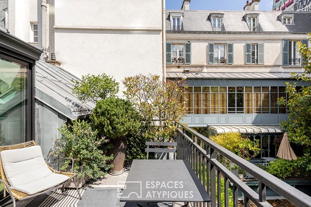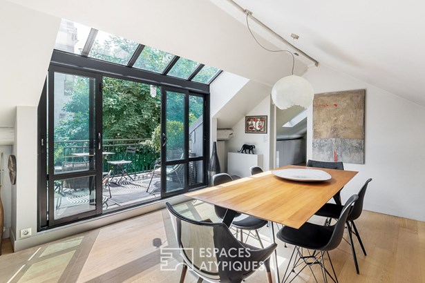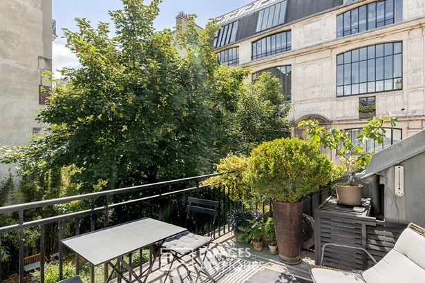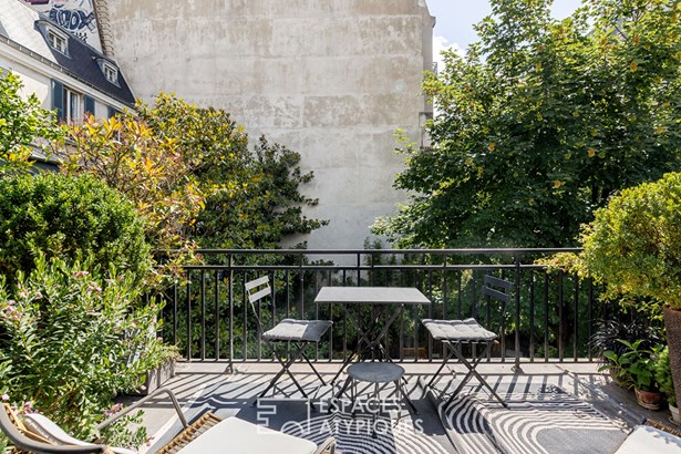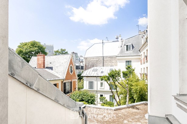 Elegantly renovated by an architect, it boasts a 10 sqm private terrace overlooking the condominium gardens: a true haven of peace, rare in the heart of Paris, bathed in light and serenity.