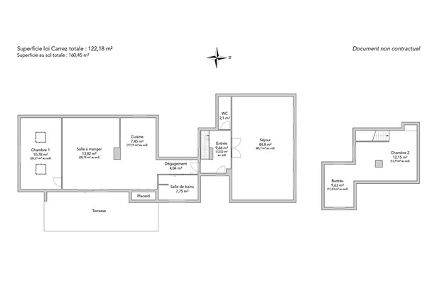 Finally, from the entrance, a staircase leads to an additional level accommodating two sleeping areas or an office.