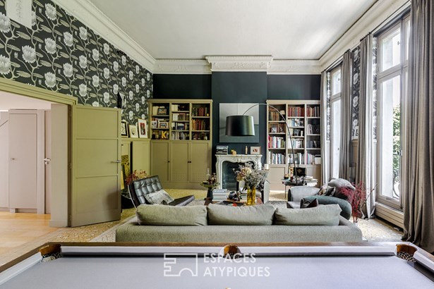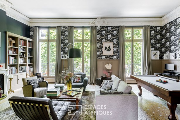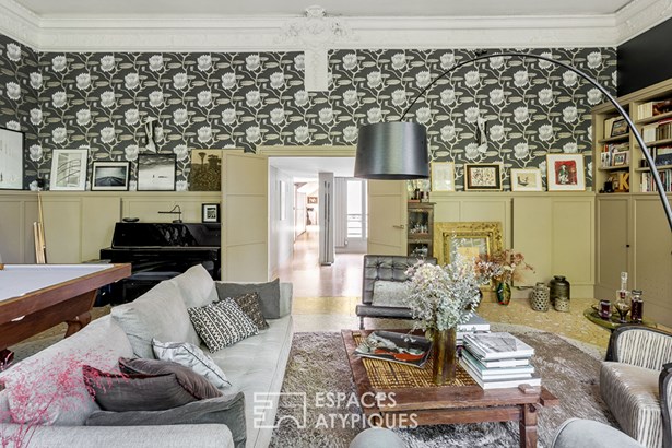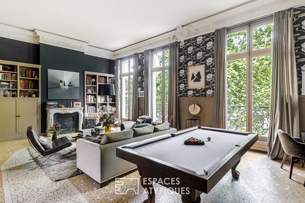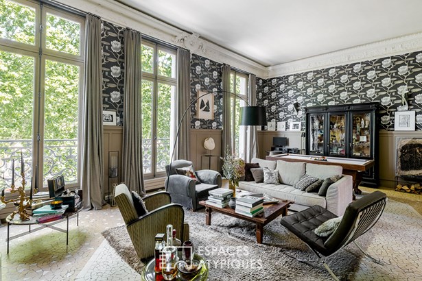 The apartment opens onto an entrance hall leading to a vast reception room, enhanced by 4-meter-high ceilings, a fireplace with period moldings, large French windows, and custom-made fittings.