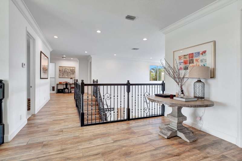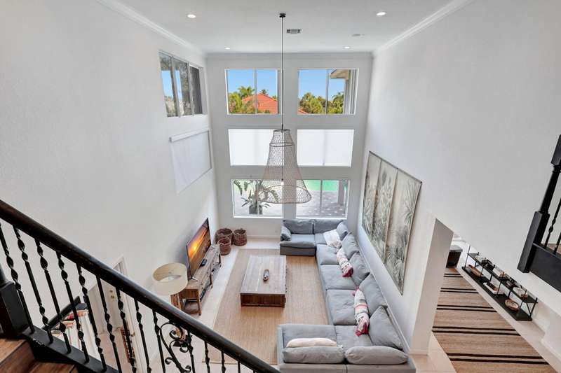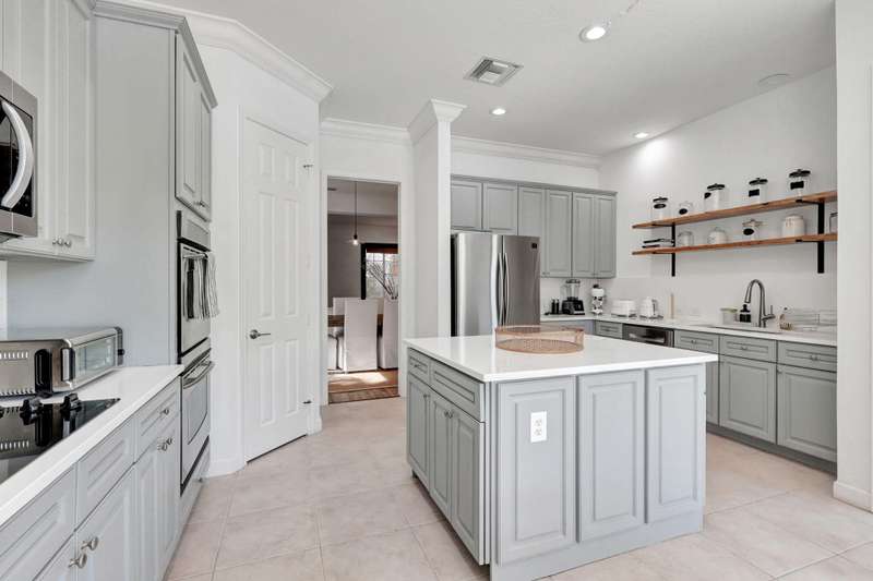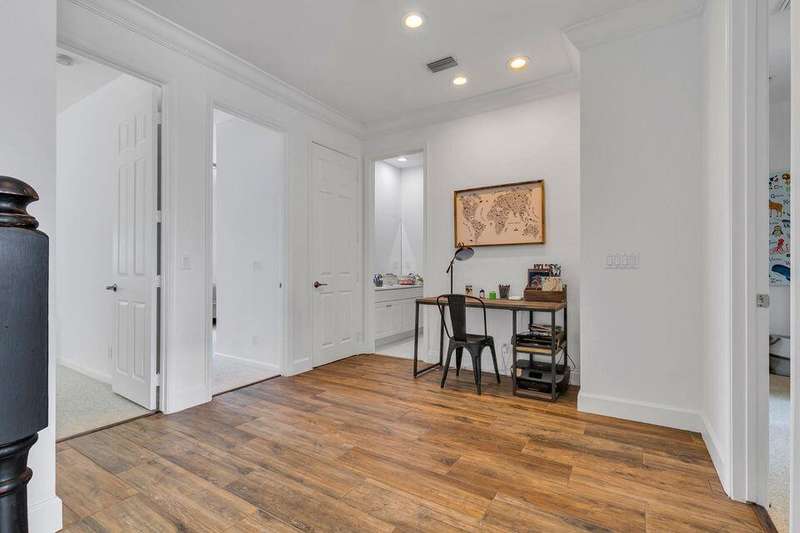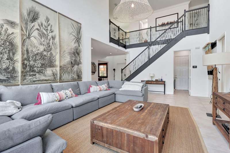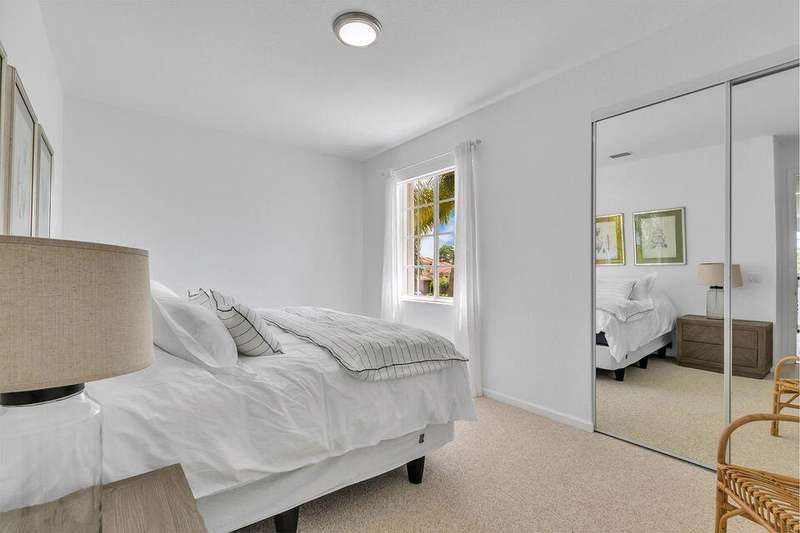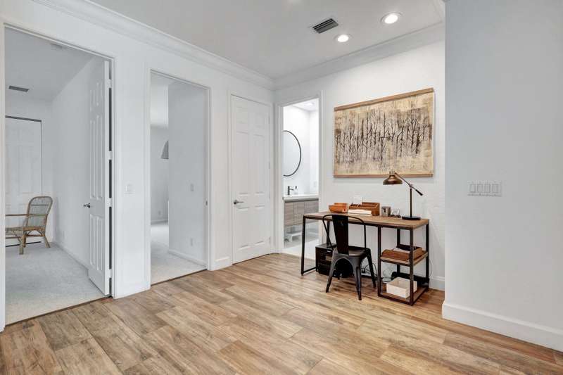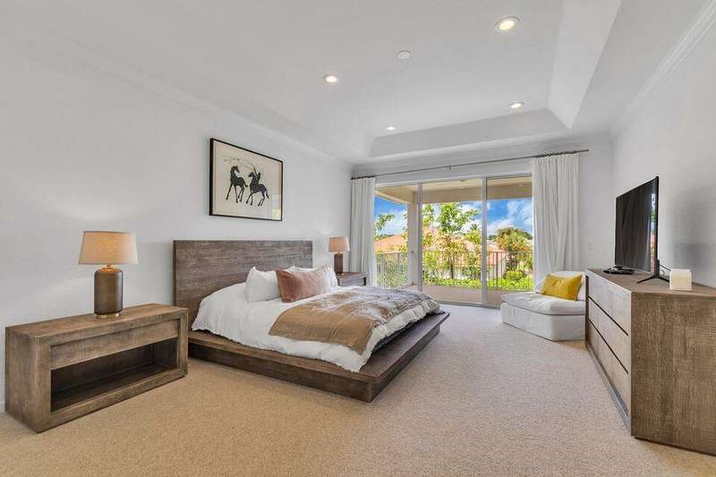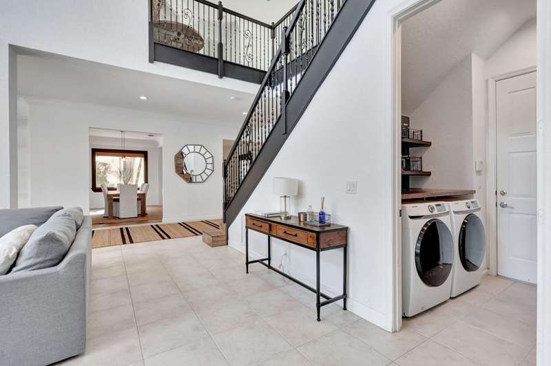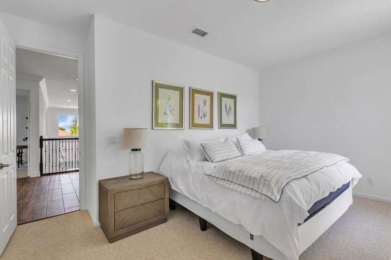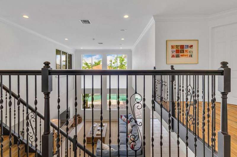 This stately home, beautifully decorated with top-of-the-line RH furniture, boasts tasteful colors and decor throughout. The first floor features a full bedroom and bath, while upstairs offers generously sized bedrooms, including a large main bedroom with a walk-in closet, ensuite bath, and private balcony.and displaying a wardrobe in a way that's both functional and stylish. Adjacent to the main bedroom is a spa-inspired bathroom that rivals those in the most luxurious resorts. The bath is equipped with dual vanities, , a separate rain shower, and elegant tile work, all contributing to a sense of ultimate relaxation and comfort. Enjoy privacy with a large fenced backyard at the end of a cul-de-sac. Located in a 24-hour man-gated community, it's close to major highways,