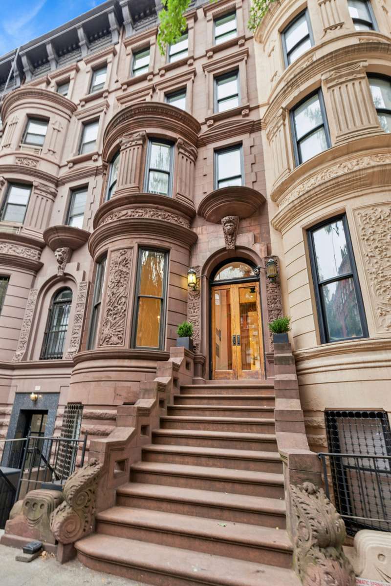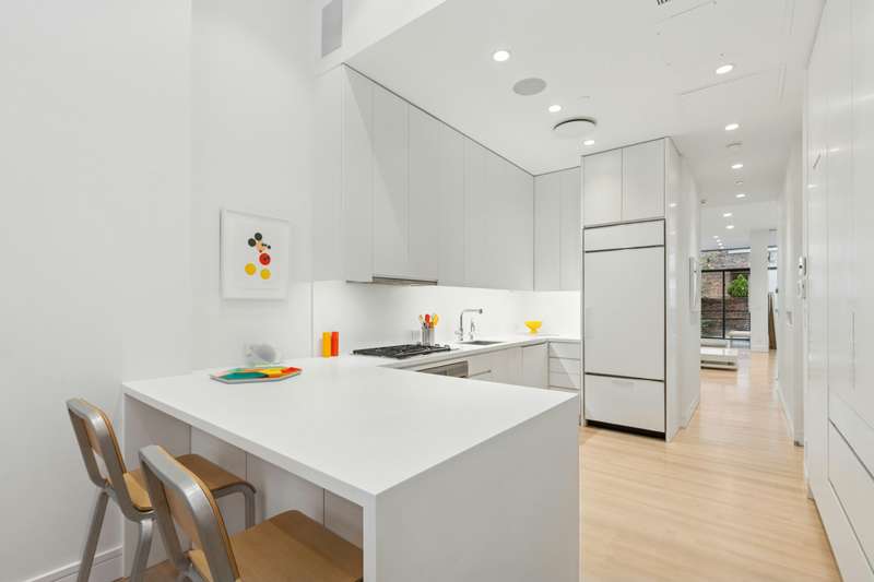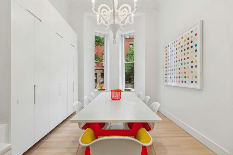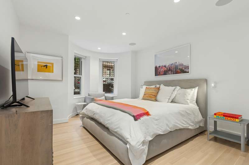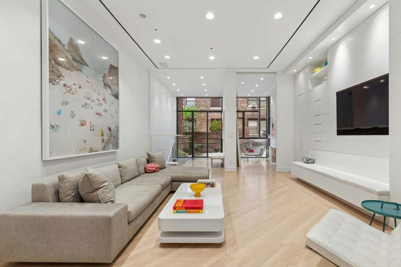 The parlor-level entry sets the tone with custom coat and ;shoe storage designed for both elegance and practicality. To the left, a sleek ;chef's kitchen gleams with top-of-the-line Miele, Wolf, and Sub-Zero ;appliances, complemented by a convenient seated bar top for casual dining or ;conversation. The generously proportioned dining room boasts soaring 12.6-foot ;ceilings and is framed by dramatic 9-foot curved glass bay windows, flooding ;the space with southern light and offering picturesque views over West 71st ;Street. Comfortably accommodating eight guests, making it ideal for both ;intimate dinners and larger gatherings. To the right, the expansive living room ;is bathed in northern light through dramatic floor-to-ceiling windows and ;enhanced by custom built-ins and lofty 11-foot ceilings, creating an atmosphere ;of airiness and grandeur. This level also includes a sunlit home office and a ;full bathroom appointed with Dornbracht fixtures and a wall-hung toilet. ;Overlooking the private garden, a balcony offers a tranquil retreat, while a