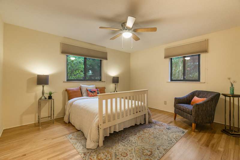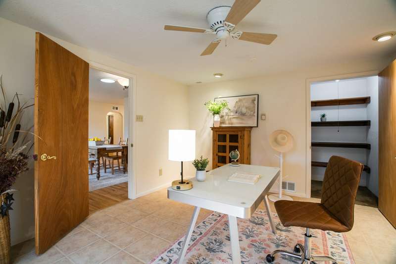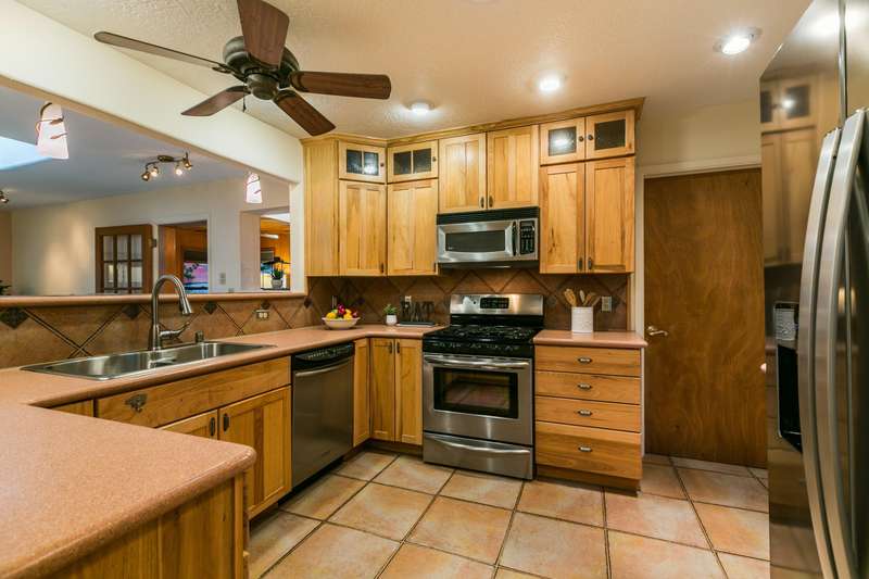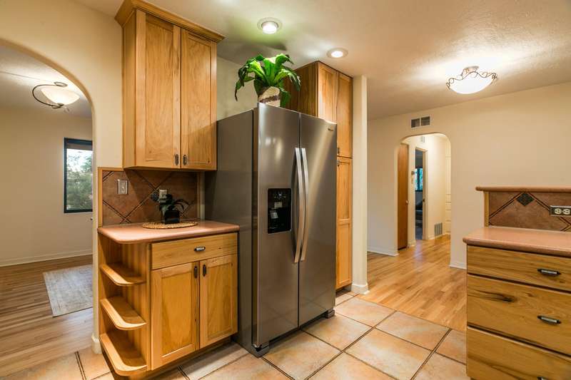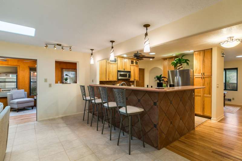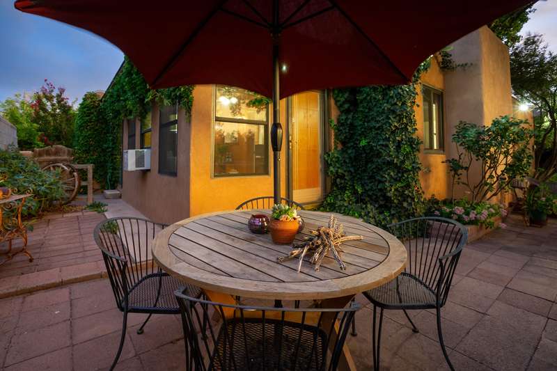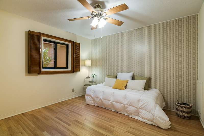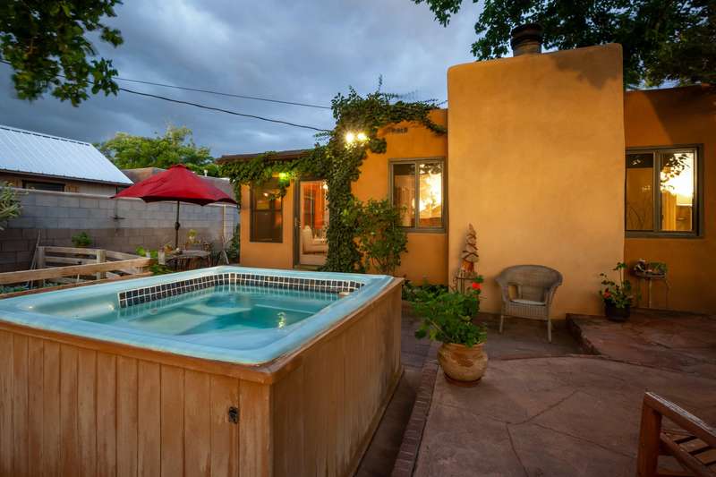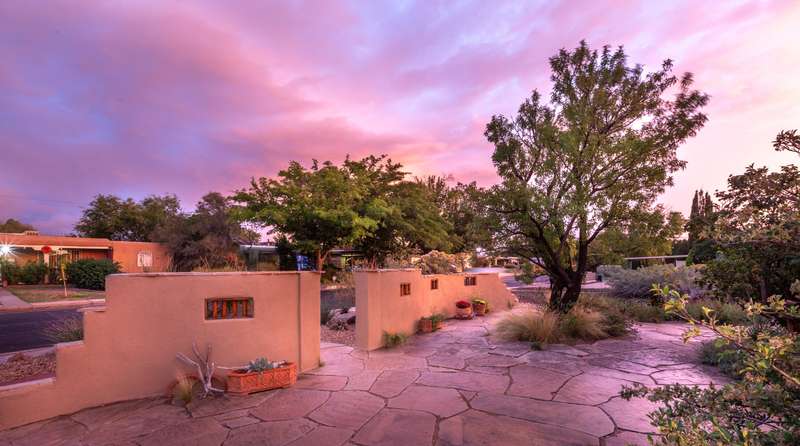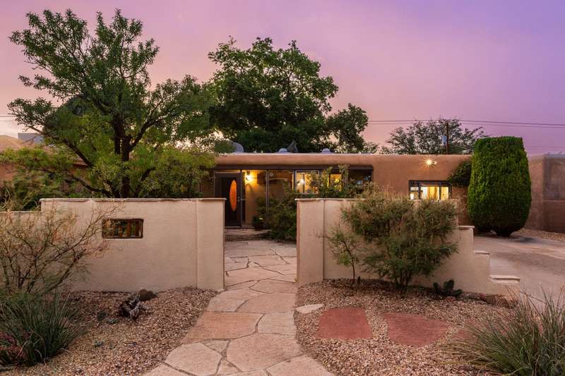 Treasured gem near Kirtland & Sandia Labs. Quality materials including, beautiful 3/4'' hardwood floors, pecan paneling in cozy sunroom, passive solar enclosed front porch, thermal windows, antique accents: cherry fireplace mantle w/marble surround. Custom antique vanities in the two bathrooms, italian tile, & hall bath w/ jetted tub & cstm barrel arch. Four bdrms with split primary bdrm that includes large walk in & en suite 3/4 bath w/Italian tile & ceramic sink. Open updated kitchen, wrap around breakfast bar, Corian counters, updated appliances w/ 5 burner gas stove. Skylights & solar tubes t/o for great natural light. Roof replaced in 2020, water heater & evap replaced. Bckyrd oasis w/hot tub & shade tree, pavers t/o & storage, alley access with protected wrought iron gate.