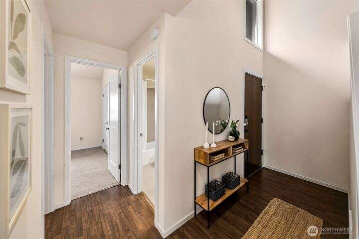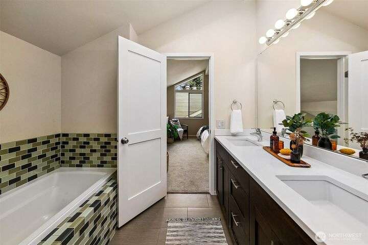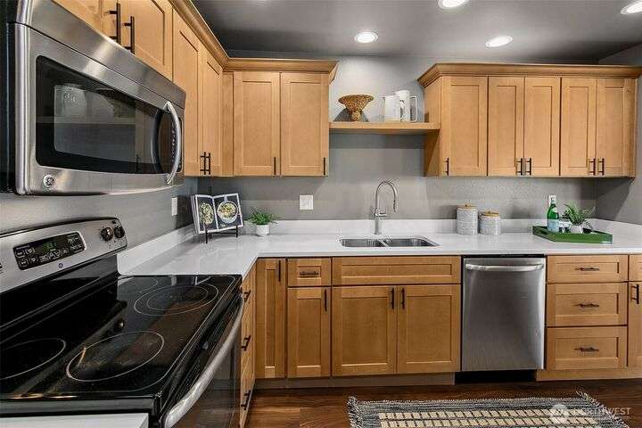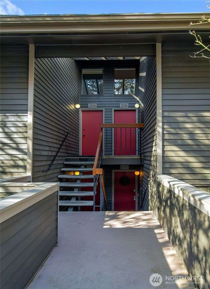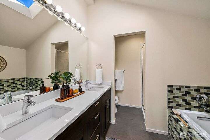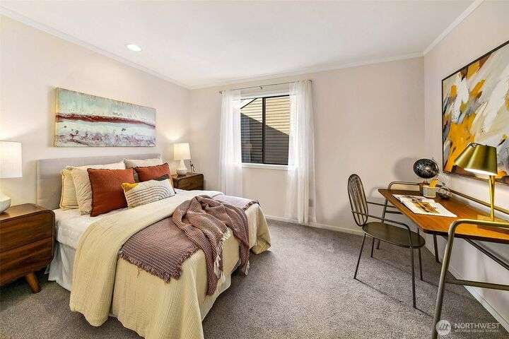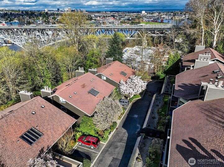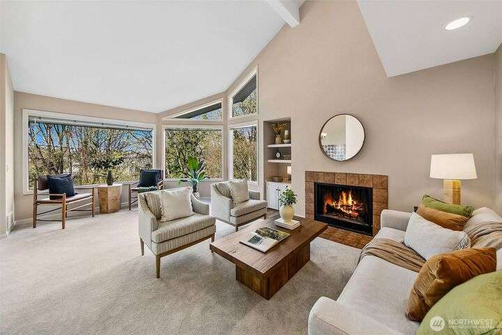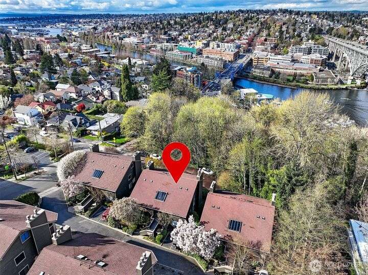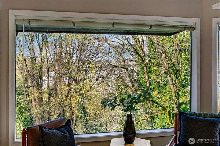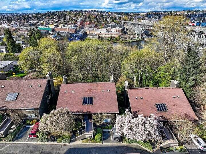 Enjoy ultimate privacy looking out big windows to trees, Fremont, and Lake Union. Top floor 2 level condo is not your basic condo with vaulted ceilings and huge windows. Brand new kitchen (in 2025!) with hardwoods, formal dining space, a private deck, and large living room featuring a fireplace and walls of windows. 3 bedrooms; two on the main floor with a full bath and a high ceiling loft style primary bedroom with ensuite bath and huge walk-in closet upstairs. New carpet and fresh paint throughout. Plenty of storage, including a large room for en suite laundry and extra closet space. Garage parking included and additional guest parking available. HOA includes utilities plus high speed internet, Insurance, Grounds and Exterior maintenance.