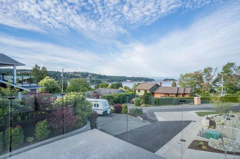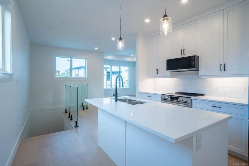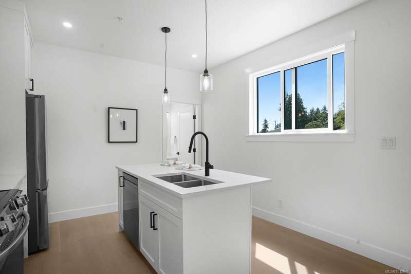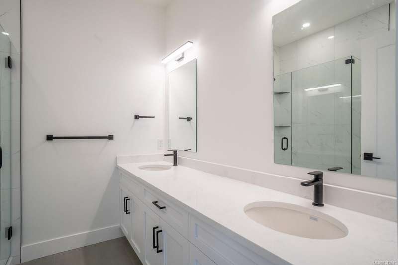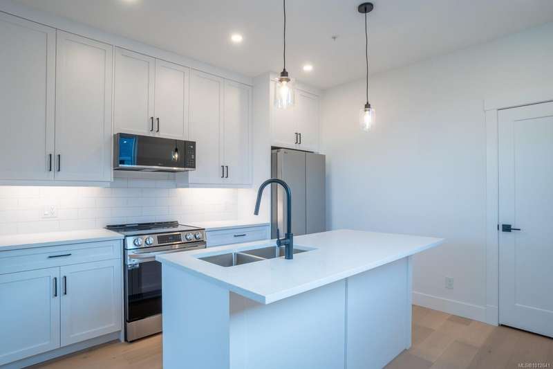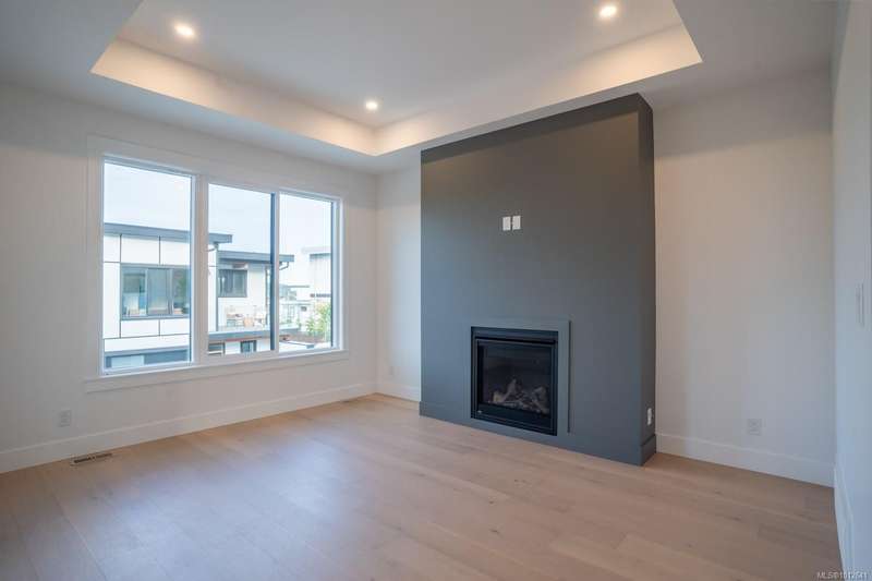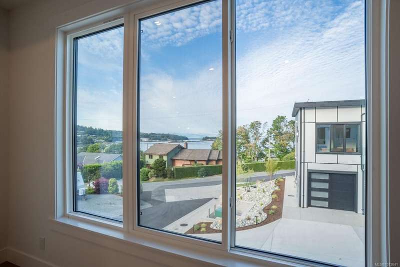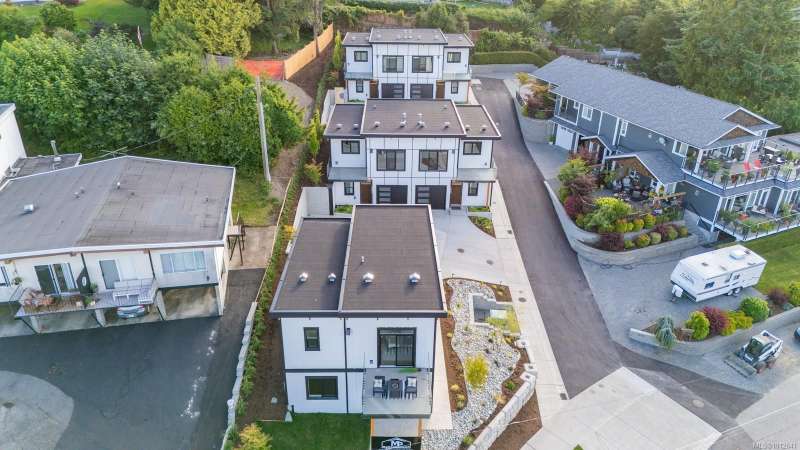 Welcome to Doctors Rd in beautiful Departure Bay—home to this stunning new 5-unit luxury townhome complex with sweeping ocean and mountain views. This is 1 of 4 two storey duplex units. Upstairs, the main living space is bright and open with views of Dep Bay, featuring engineered hardwood floors, a modern kitchen with stainless steel appliances, stone countertops, custom wood cabinetry, a cozy dining nook, a welcoming living room with an electric fireplace, a 2-piece powder room and access to a private patio w gas BBQ hook up. The spacious 11'x16' primary bedroom has a walk-in closet with custom high end shelving, and a sleek 4-piece ensuite boasting heated tile floors, a custom tiled shower and high end fixtures. The entry floor offers two additional beds, a stylish 4-piece bath, a laundry/storage room, and an attached 11'x25' garage w roughed in EV charger. Each unit additionally has: high efficiency gas furnace, A/C, high end closet organizers, hardi plank exterior, full landscaping