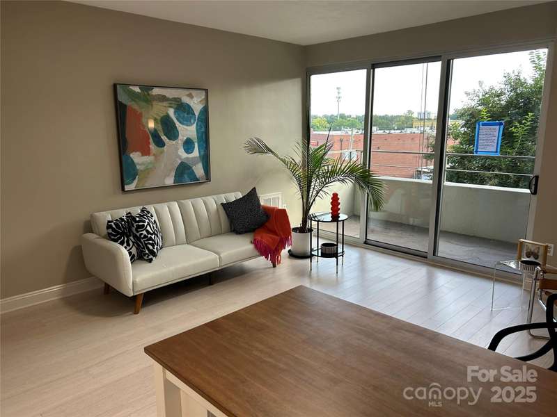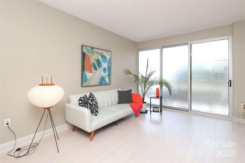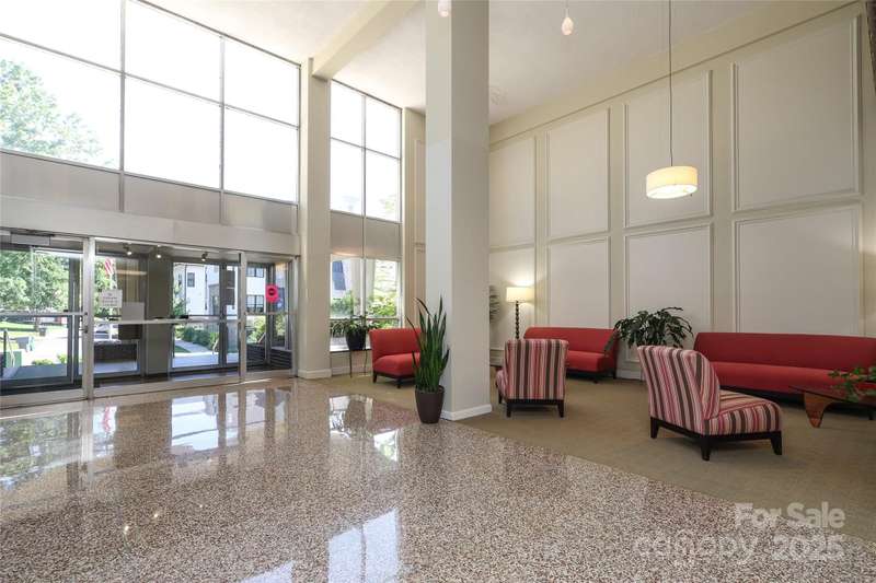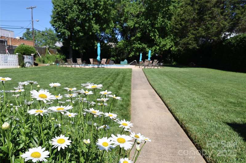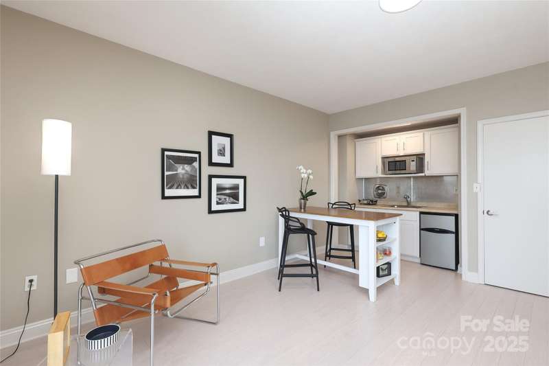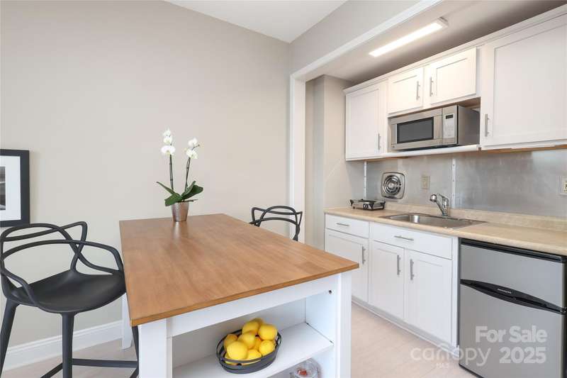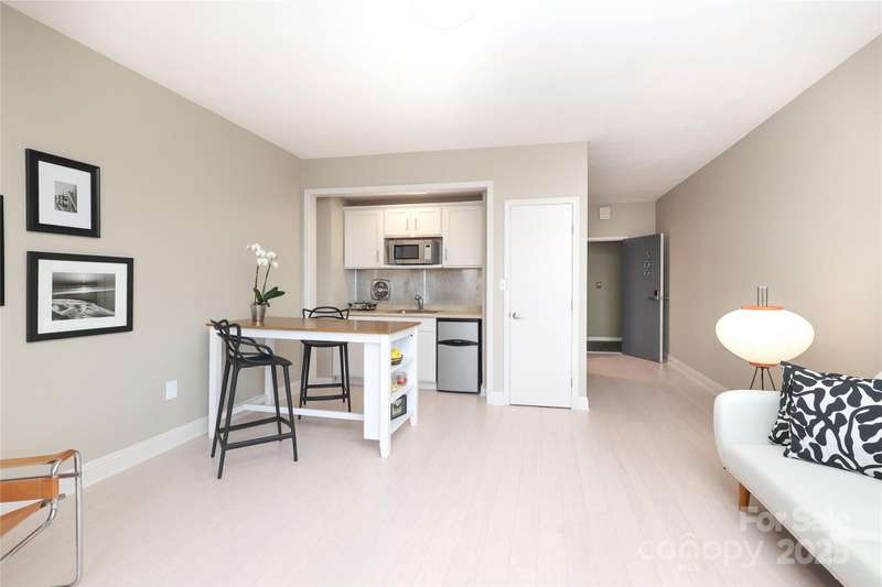 Stylish studio living at The Kimberlee. This beautifully updated studio is in one of Charlotte's most distinctive mid-century modern buildings now on the historic register. Step inside to find new eco friendly bamboo flooring, fresh paint and a moveable island for flexibility. As a Kimberlee resident, you will have access to an array of amenities including a pool, fitness center, garden plots, an expansive skyview room with great views, a storage unit on the lower level and a $50/night guest suite for visitors. Right outside this secure building is a private pedestrian bridge that take you over to the many shops and restaurants in Park Road Shopping Center. For recreation, the Little Sugar Creek Greenway is just around the corner. The HOA dues include property taxes, water/sewer. basic cable & Wi-Fi. This is a co-op, so it is cash only with no rentals. This studio isn't just a home--it's a lifestyle of community, convenience, timeless design and a great value.