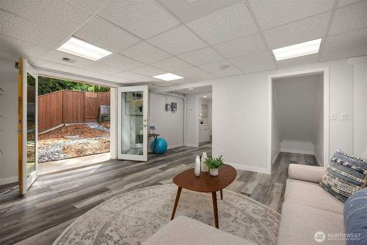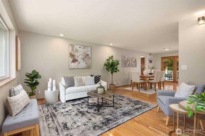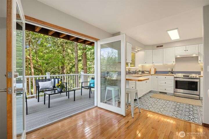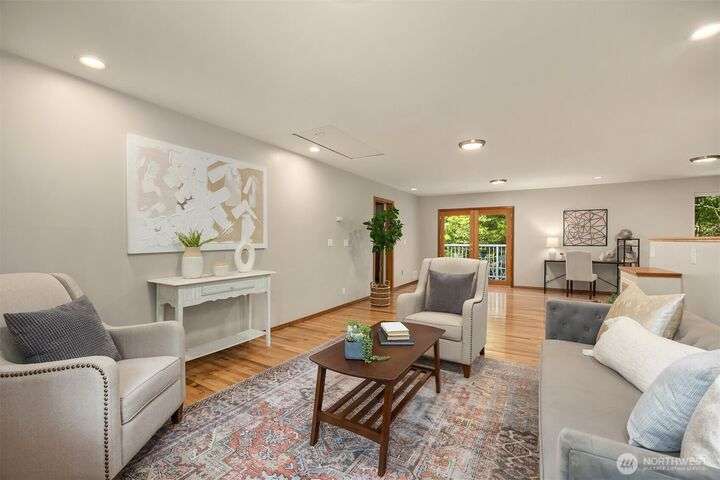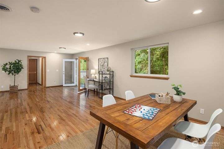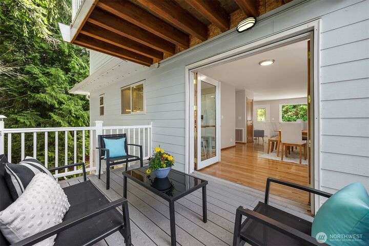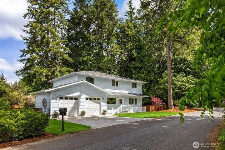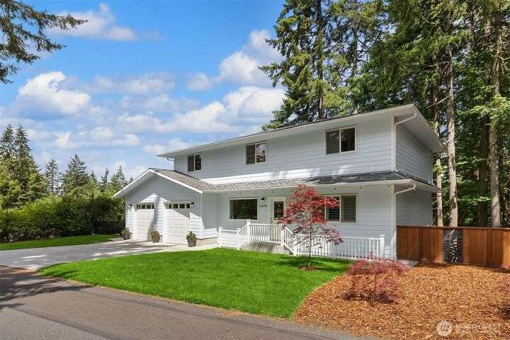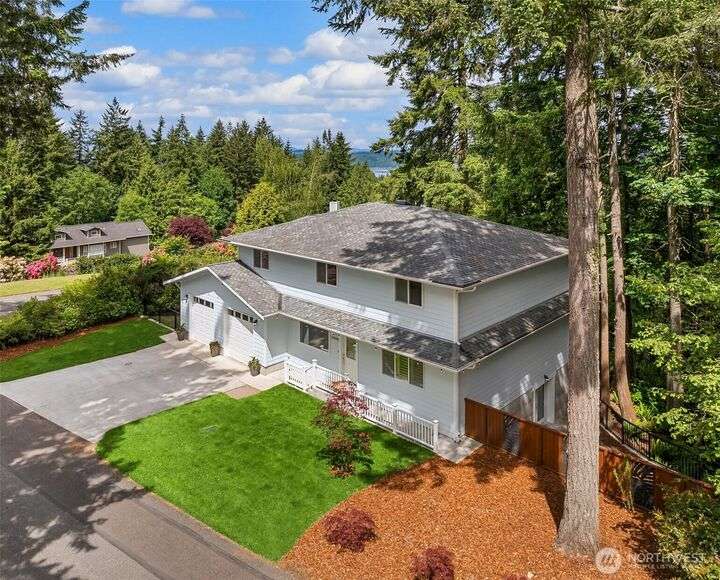 This lovely home located in the Pioneer Hill West Community offers living space for all. Enjoy sunlight throughout the day and your own personal backyard forest. This graciously sized home features a convenient main floor primary, 2 large bedrooms upstairs with a huge bonus space that can be used for a media room, playroom, office or workout space with a cute balcony featuring partial views of the Olympic mountains and your private backyard forest. The fully finished, daylight basement features french doors leading out to a fully fenced side yard, a full bathroom and loads of storage. Easy access to all the PNW activities and a short distance to Poulsbo. Dues include unlimited water and a community park located across the street!