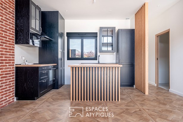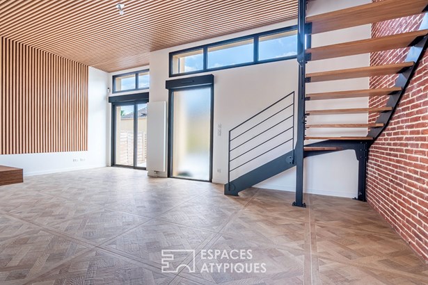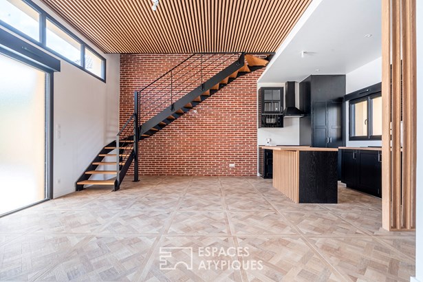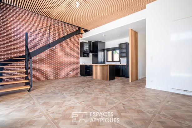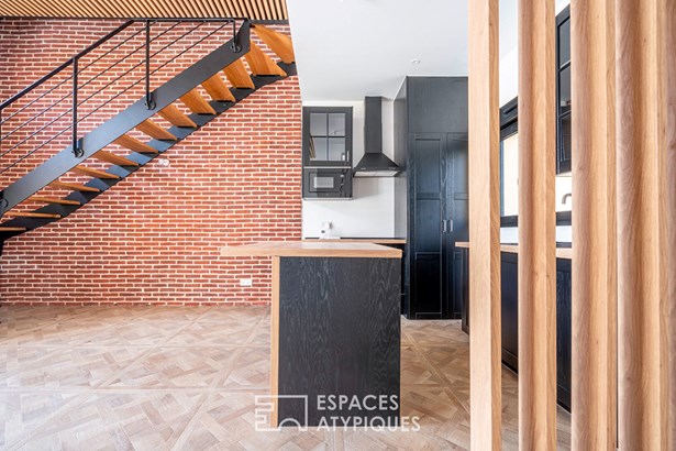 The ground floor features a discreet but functional entrance hall with cupboard, guest WC and utility room, creating a fluid transition to the living area. Bathed in light by a bay window topped with transoms, this room boasts a ceiling height of 3.40 m and opens onto a garden of around 55 m2. The kitchen, with its central island, has a natural place here, with a direct link to the social areas.