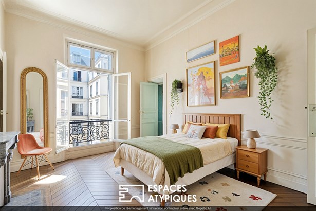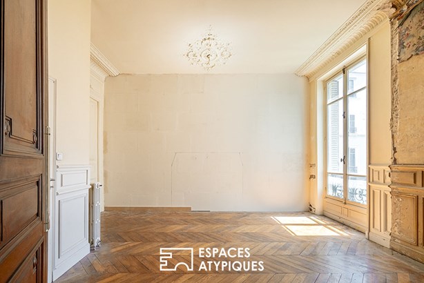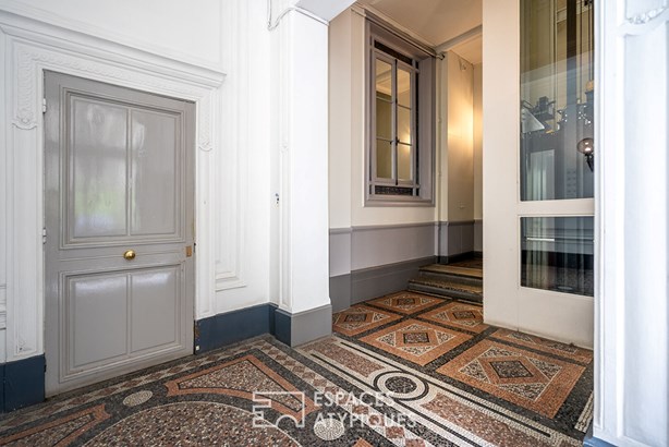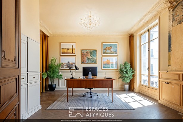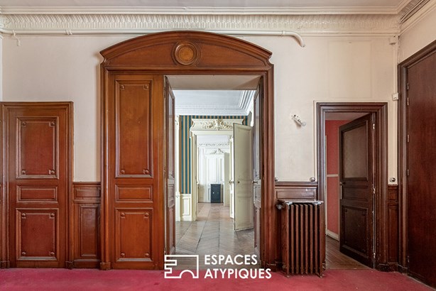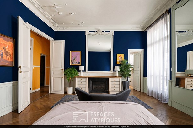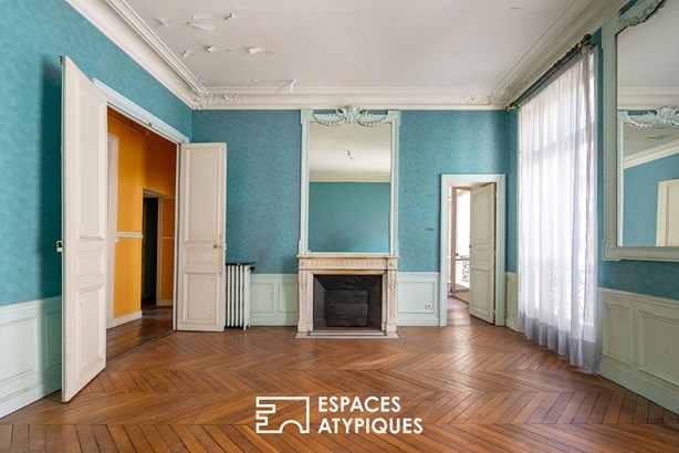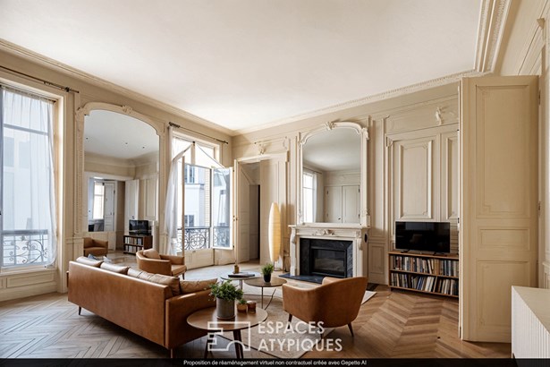 On the second floor of a former late 19th-century mansion, this 218.83m2 (2,300 sq ft) Carrez law apartment boasts exceptional volumes and undeniable charm, featuring herringbone parquet floors, sculpted marble fireplaces, and period moldings and decor.