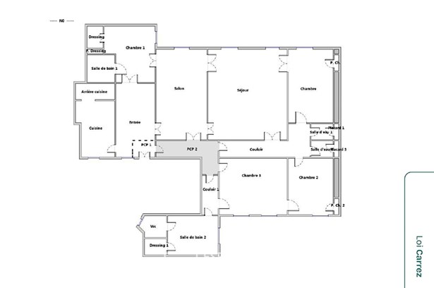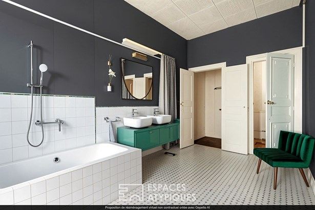 Bathed in light and with a 3.5m ceiling height, it offers significant potential for a bold transformation of this noble and elegant space. It comprises an entrance hall, a kitchen, a 56m2 living and dining room, four bedrooms of 27m2, 22m2, and 17m2, two bathrooms, and a separate toilet.