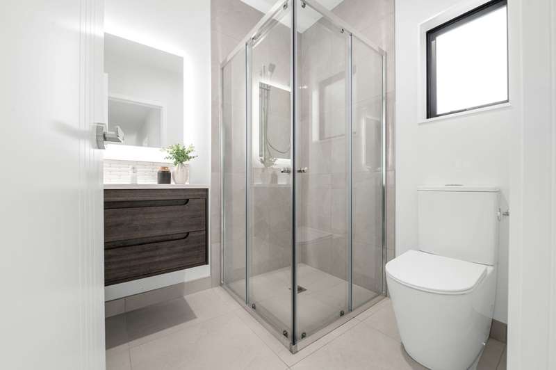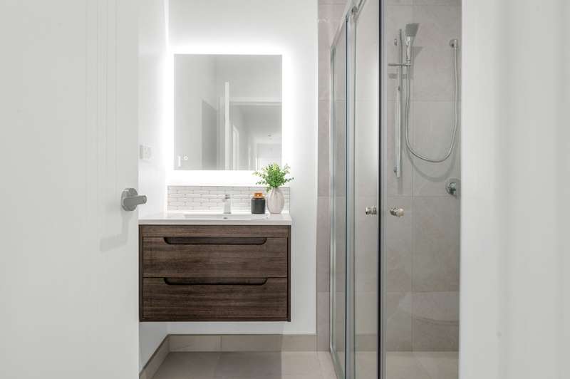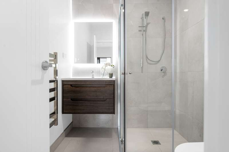 Accommodation is thoughtfully finished, with the master enjoying its own fully tiled ensuite. Frameless showers, LED-lit mirrors and chrome fittings give both bathrooms a clean, contemporary look.