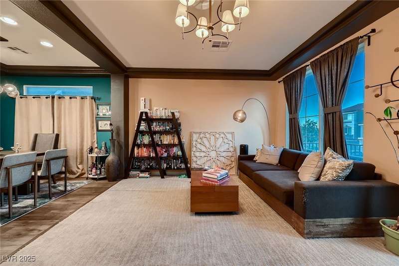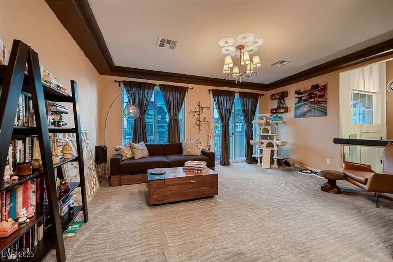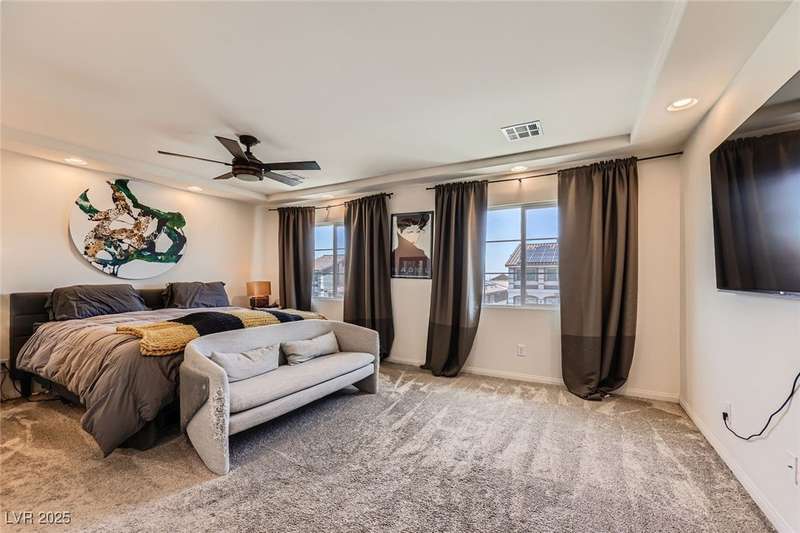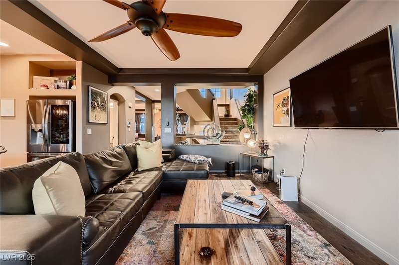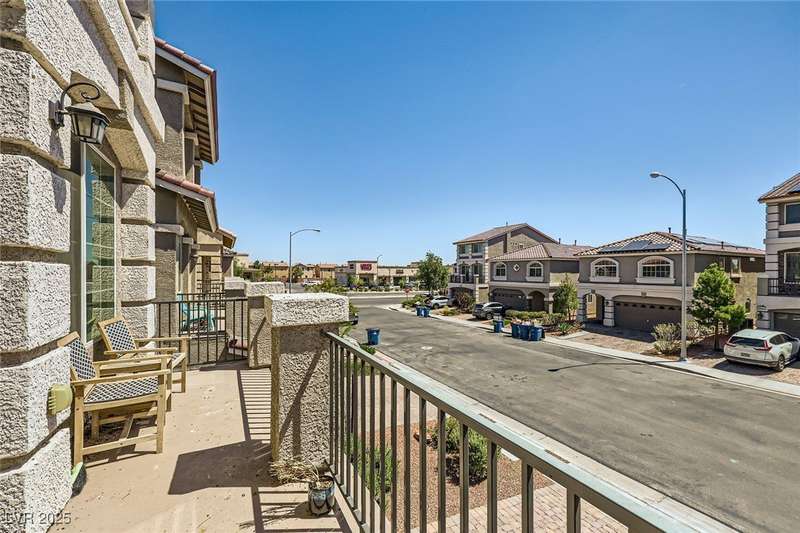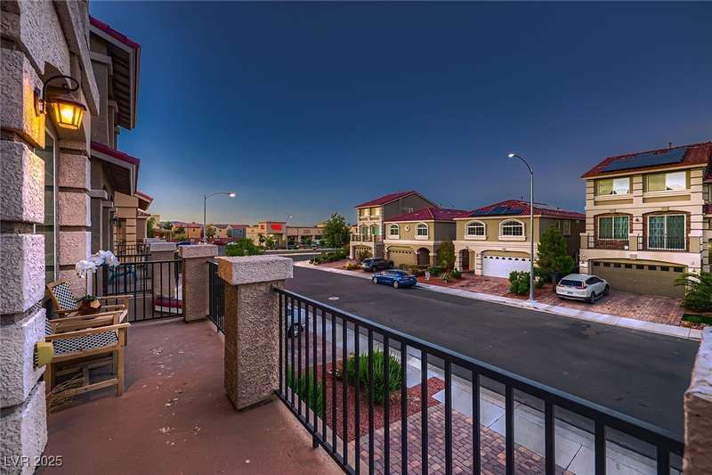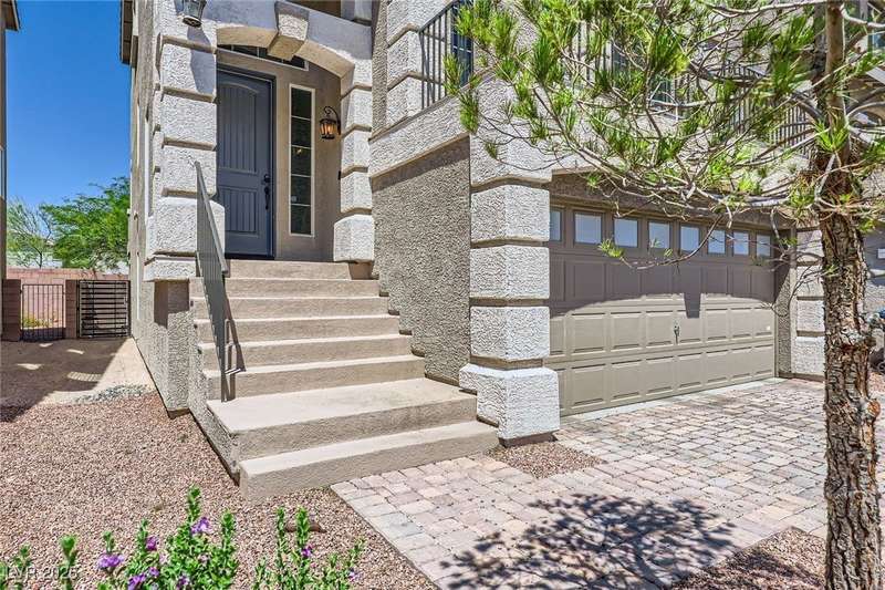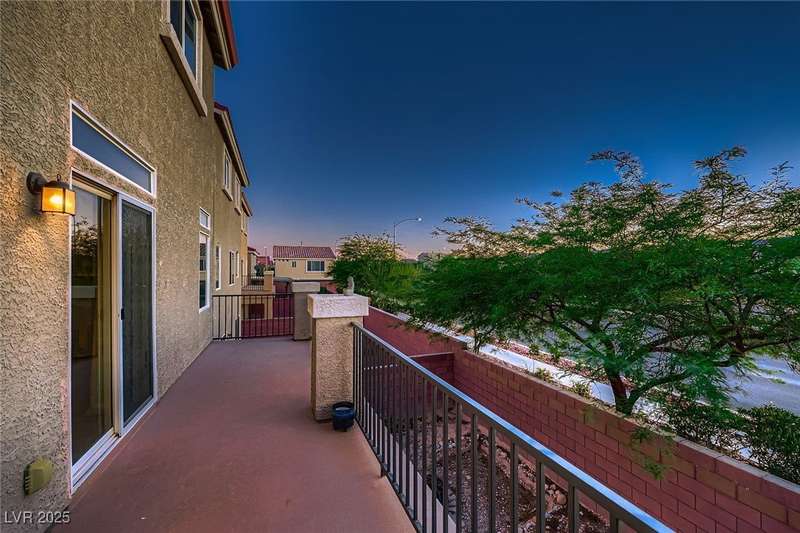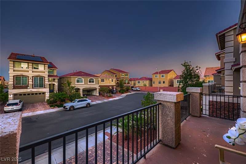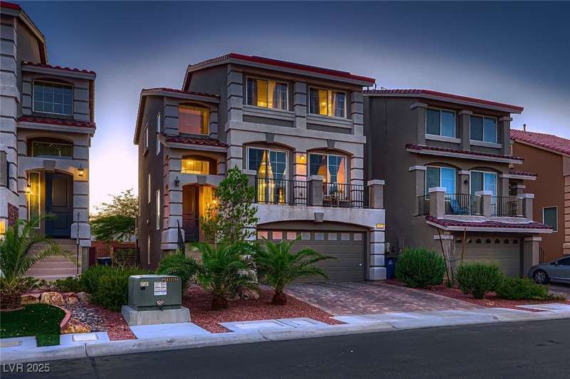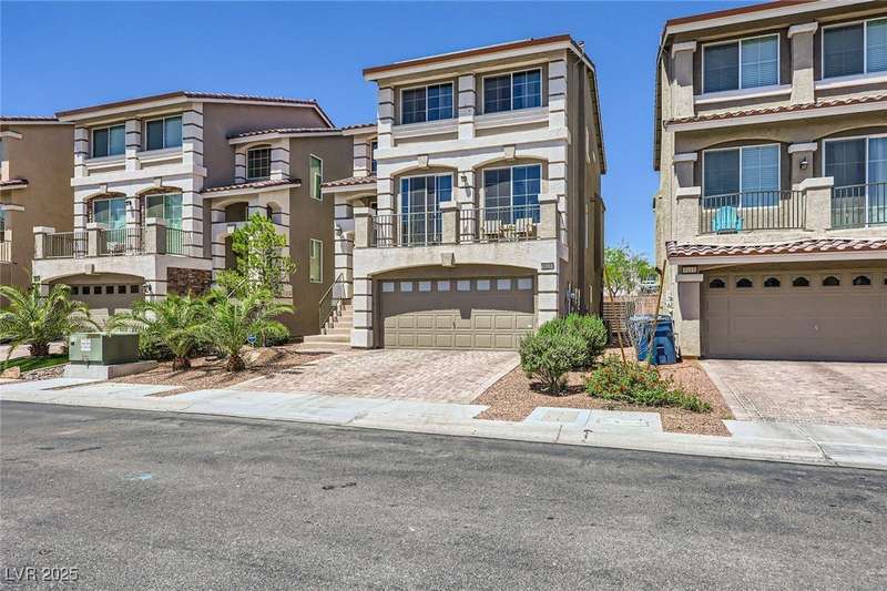 Meticulously maintained tri-level home, in the highly sought-after Coronado Ranch community. Low HOA of just $35/month & equipped with solar panels, this home is both energy-efficient and cost-effective. Attention to detail & upgrades throughout—crown molding, designer light fixtures enhance the home. Main living level boasts an ideal open-concept layout with two private balconies, for a seamless indoor-outdoor living experience. Spacious living room & cozy family room sit adjacent to the formal dining area, for versatile gathering spaces. Kitchen is complete with granite countertops, top-of-the-line stainless steel refrigerator, & a casual dining space. Downstairs, a huge media room features a projector system & private access to the generously sized backyard with covered patio & no rear neighbors. Upstairs, retreat to your expansive primary suite with space for a sitting area or office setup leading to a luxurious en-suite bathroom with walk-in shower & custom walk-in closet.