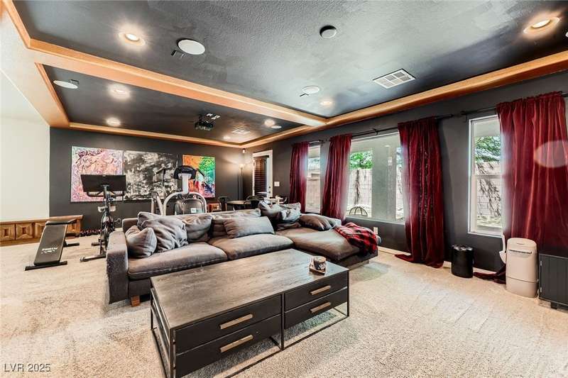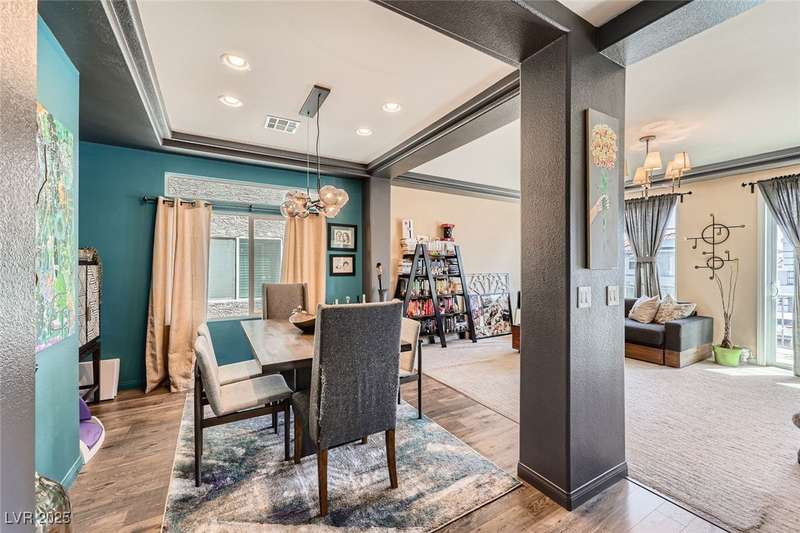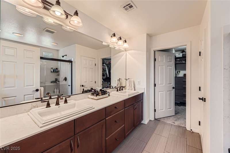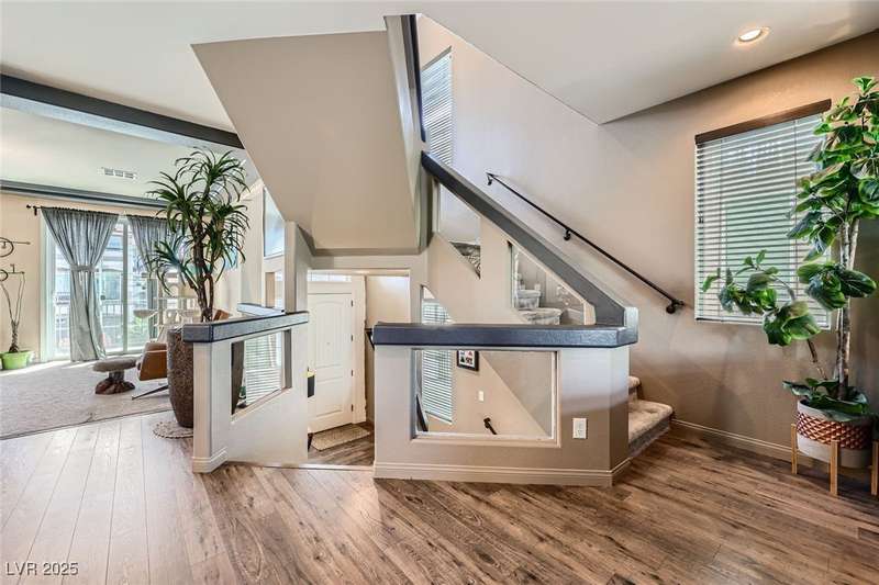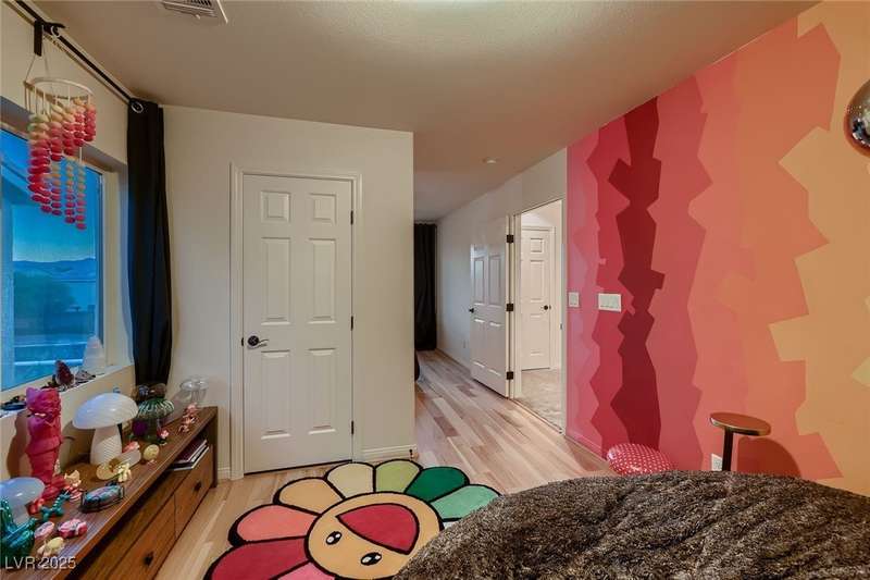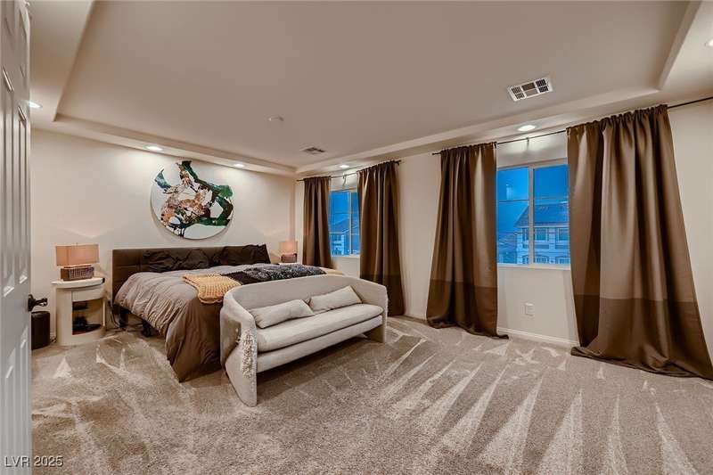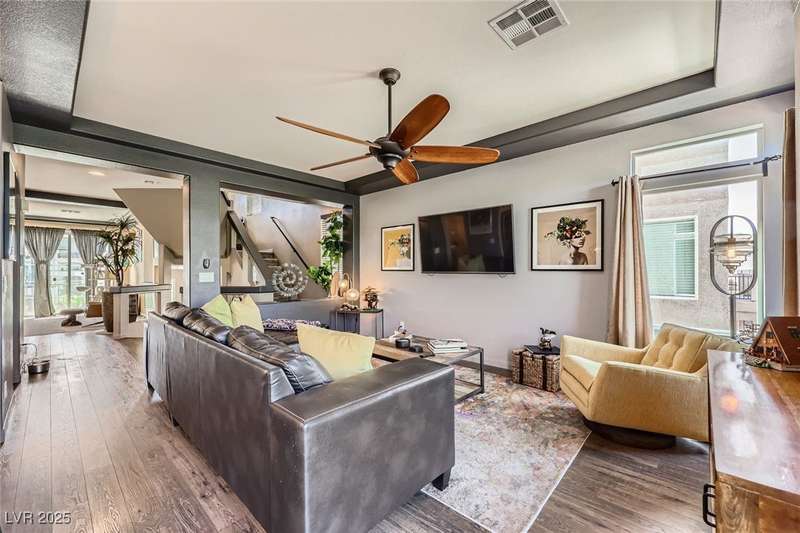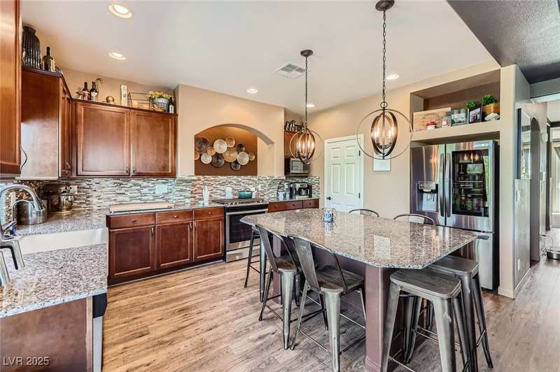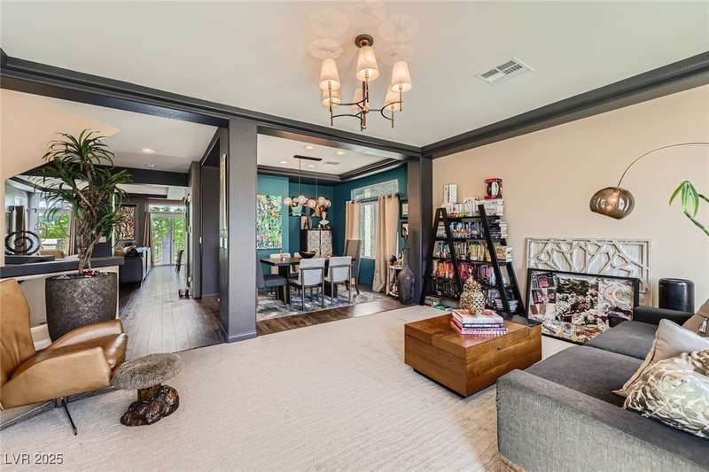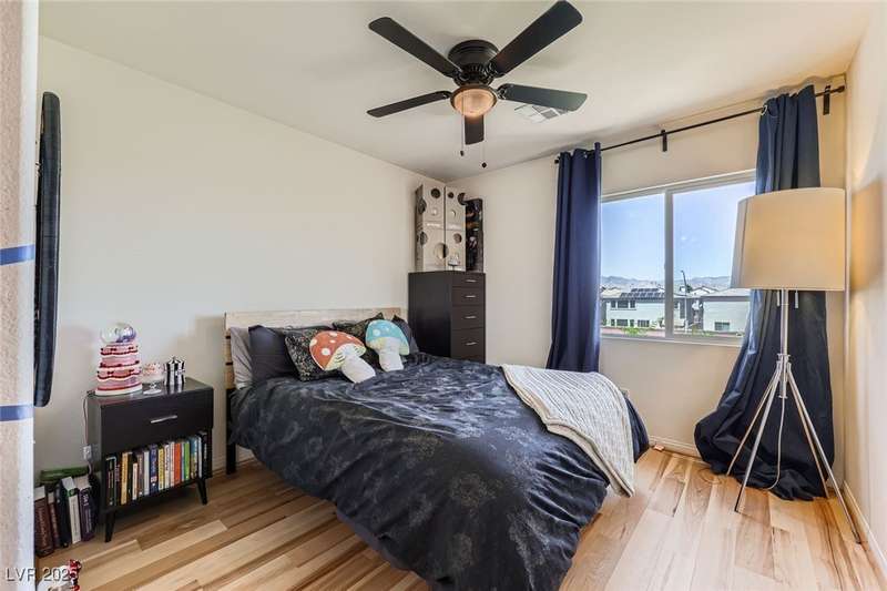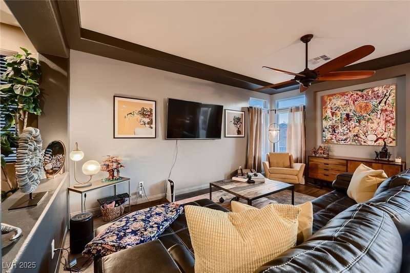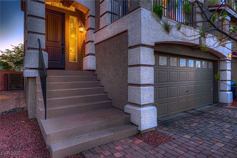 Meticulously maintained tri-level home, in the highly sought-after Coronado Ranch community. Low HOA of just $35/month & equipped with solar panels, this home is both energy-efficient and cost-effective. Attention to detail & upgrades throughout—crown molding, designer light fixtures enhance the home. Main living level boasts an ideal open-concept layout with two private balconies, for a seamless indoor-outdoor living experience. Spacious living room & cozy family room sit adjacent to the formal dining area, for versatile gathering spaces. Kitchen is complete with granite countertops, top-of-the-line stainless steel refrigerator, & a casual dining space. Downstairs, a huge media room features a projector system & private access to the generously sized backyard with covered patio & no rear neighbors. Upstairs, retreat to your expansive primary suite with space for a sitting area or office setup leading to a luxurious en-suite bathroom with walk-in shower & custom walk-in closet.