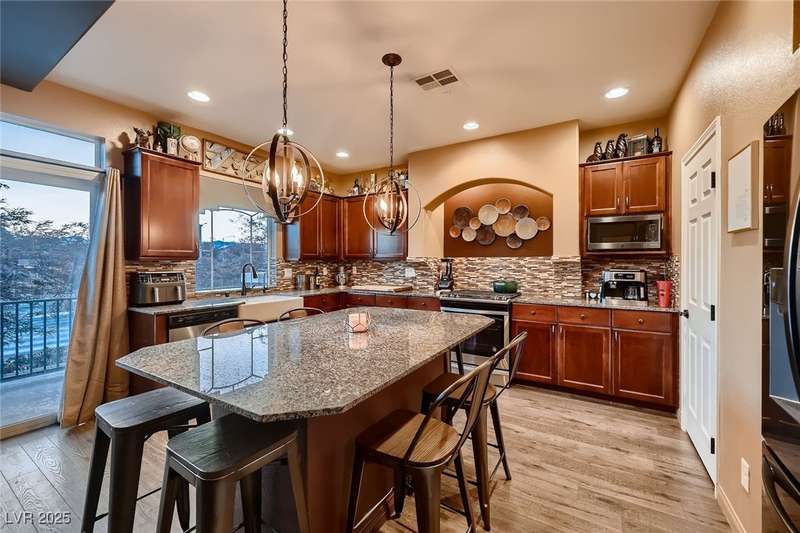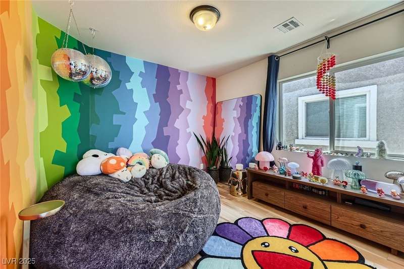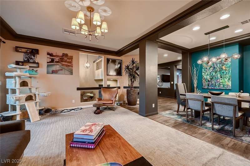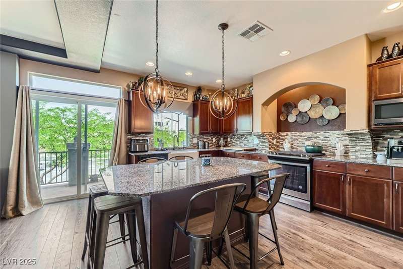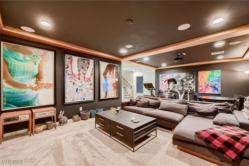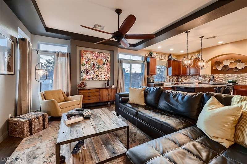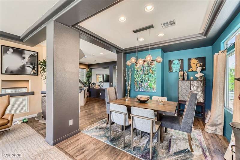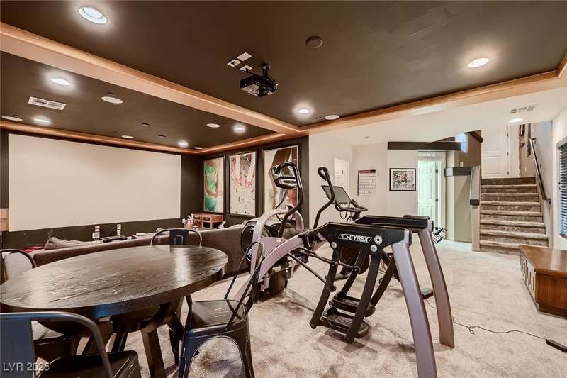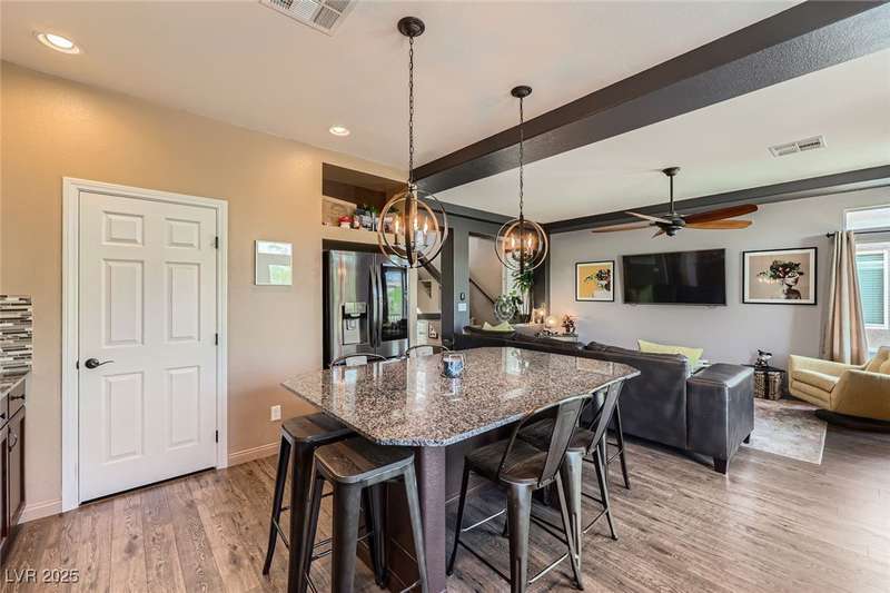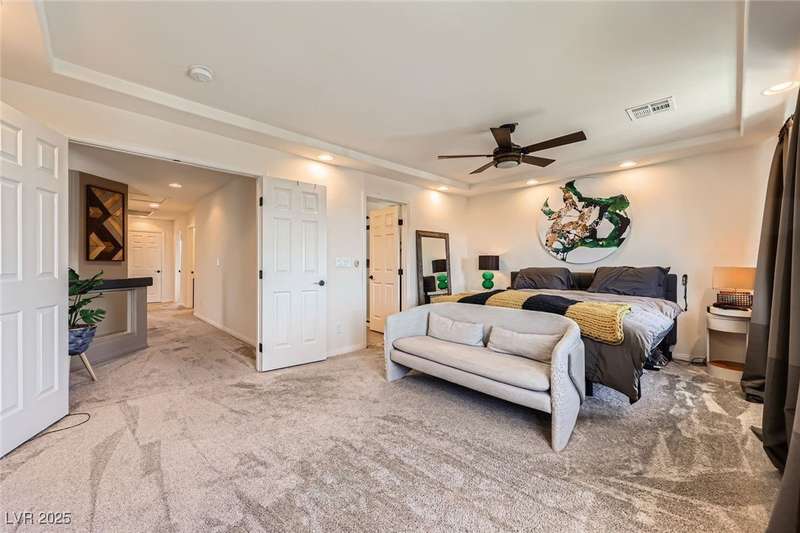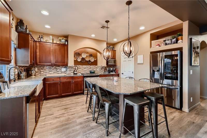 Meticulously maintained tri-level home, in the highly sought-after Coronado Ranch community. Low HOA of just $35/month & equipped with solar panels, this home is both energy-efficient and cost-effective. Attention to detail & upgrades throughout—crown molding, designer light fixtures enhance the home. Main living level boasts an ideal open-concept layout with two private balconies, for a seamless indoor-outdoor living experience. Spacious living room & cozy family room sit adjacent to the formal dining area, for versatile gathering spaces. Kitchen is complete with granite countertops, top-of-the-line stainless steel refrigerator, & a casual dining space. Downstairs, a huge media room features a projector system & private access to the generously sized backyard with covered patio & no rear neighbors. Upstairs, retreat to your expansive primary suite with space for a sitting area or office setup leading to a luxurious en-suite bathroom with walk-in shower & custom walk-in closet.