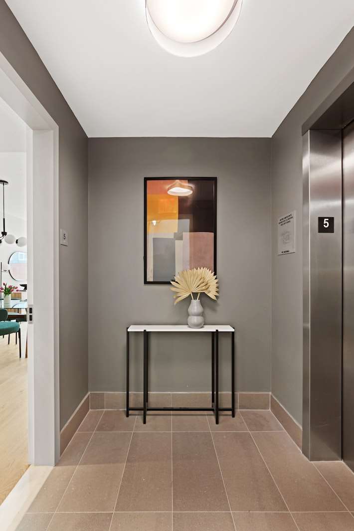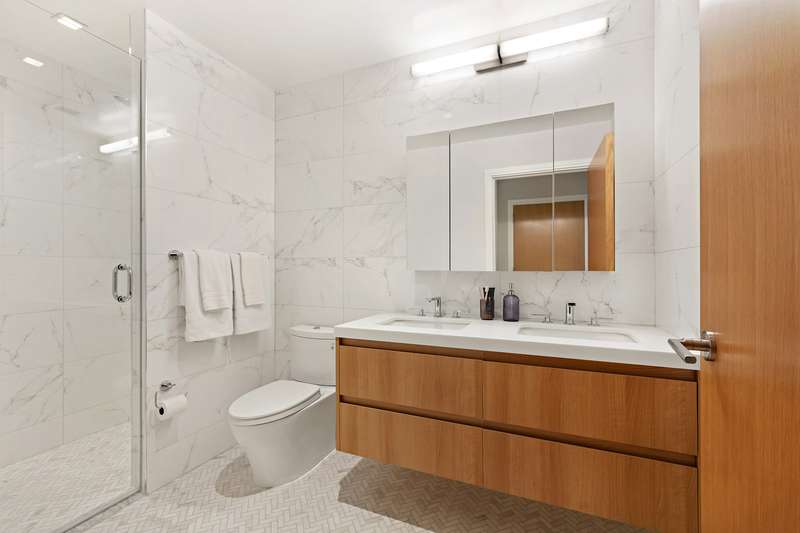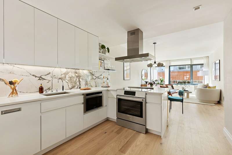Experience sustainable luxury in this 3 bed, 2 bath residence at The Dovecote, where design, functionality, and Passive House sustainability converge seamlessly. Accessed through a private elevator vestibule, the home features premium interior finishes, sound-attenuating windows for natural light, timeless white oak flooring, and an efficient VRF HVAC system. The heart of the home includes kitchens with Caesarstone countertops, Porcelanosa backsplash, custom lacquered cabinetry, and a prominent Bosch stainless steel appliance suite. The recirculating hot water system adds convenience and reduces waste. The primary bath is a clean design sanctuary with Persian white Porcelanosa floor tiles, Carrera Blanco wall tiles, a custom lacquered vanity with a Caesarstone countertop, and a walk-in shower with Grohe fixtures. The secondary bath combines Travertine-look porcelain floor tile, Italian glazed white porcelain wall tile, and a spacious soaking tub with polished chrome Kohler fixtures. Indulge in unparalleled sustainable living at The Dovecote.