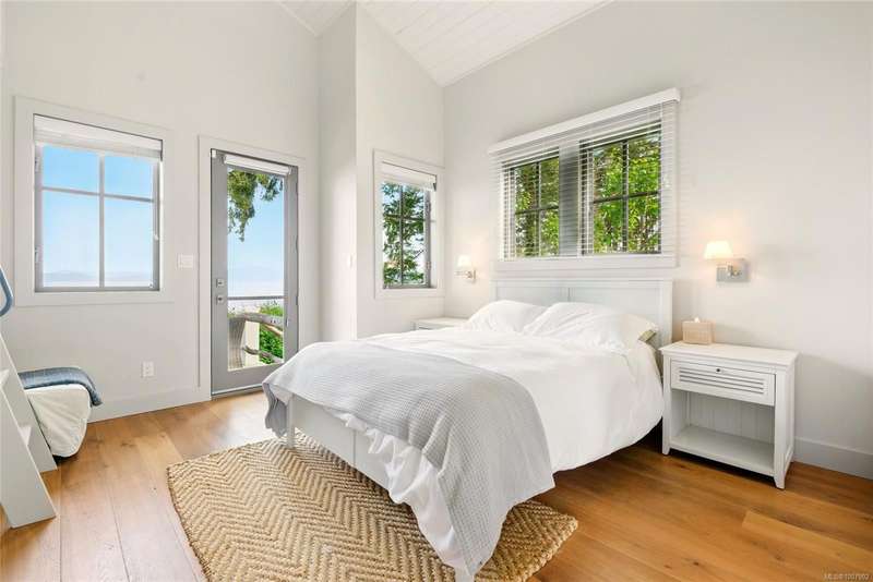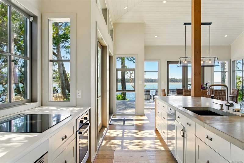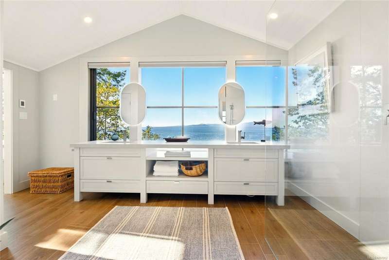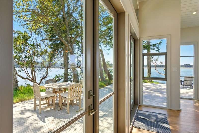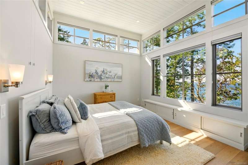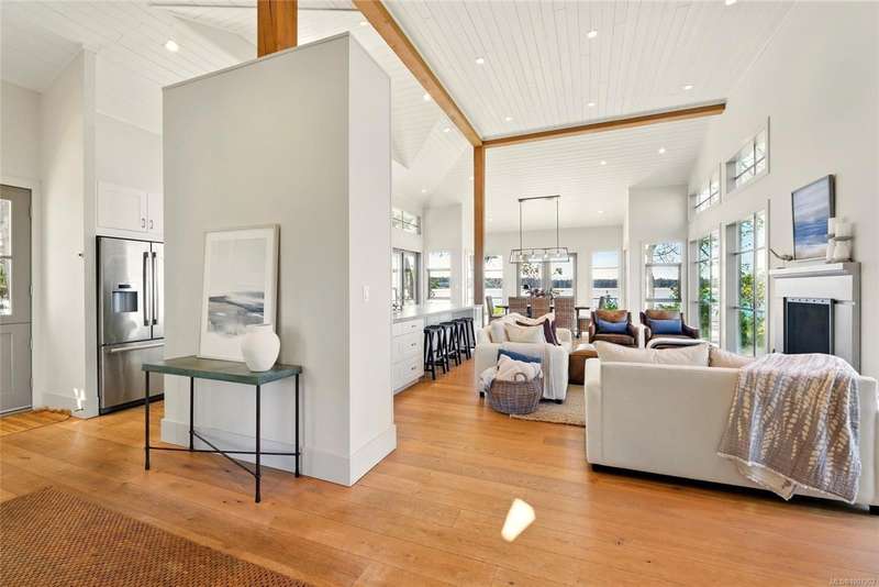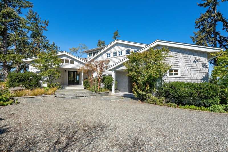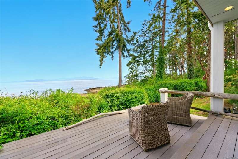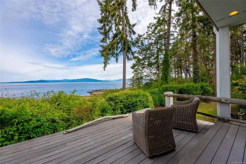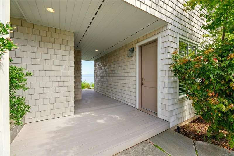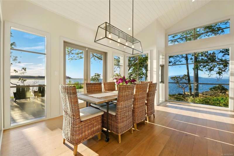 Perched at the tip of Madrona Point in Nanoose Bay, this bespoke 2011 waterfront residence by RDolan Construction captures the essence of timeless Cape Cod elegance amid Vancouver Island's most enchanting natural beauty. Set on a tranquil 0.5-acre lot embraced by parkland and lush native flora, it offers unmatched privacy and light. Inside 14-ft pine tongue-and-groove ceilings, hand-painted fir beams, radiant in-floor heating, and a 12ft custom concrete island define the airy, open-concept living space, where floor-to-ceiling windows frame sweeping ocean vistas. Two luxurious primary suites-each with walk-in closets and spa-inspired ensuites-allow for main-level ease or a secluded upper retreat. Across a breezeway, a charming guest suite with private deck invites quiet reflection. Multiple outdoor living areas offer 270° views, daily wildlife encounters, walk on waterfront access, and a private boat lift. A rare and graceful expression of coastal living, the true pearl of Madrona Drive