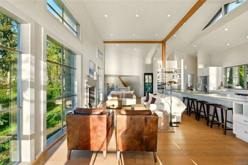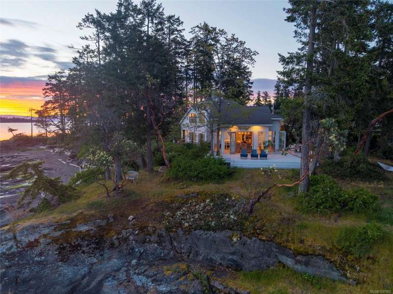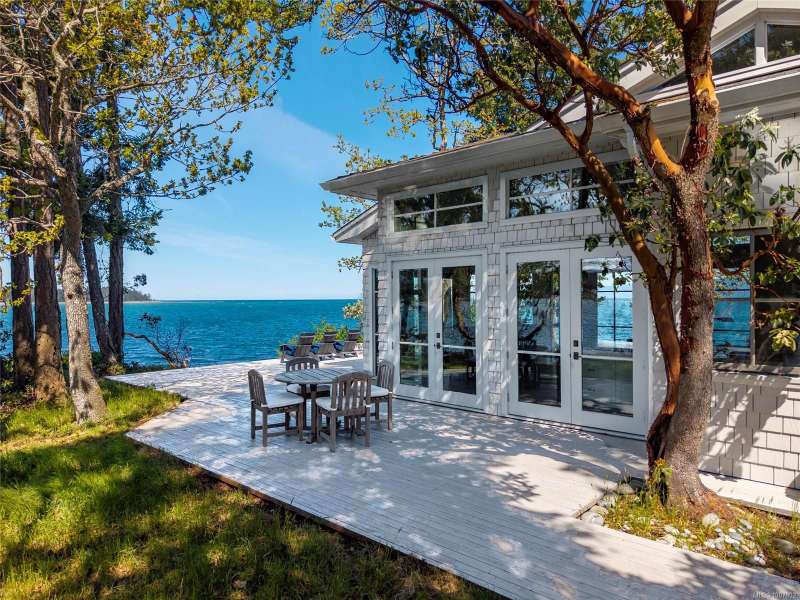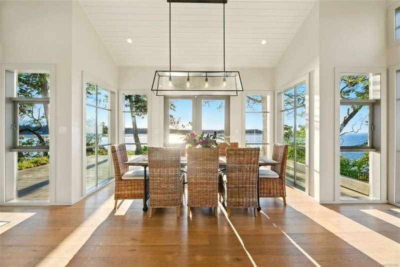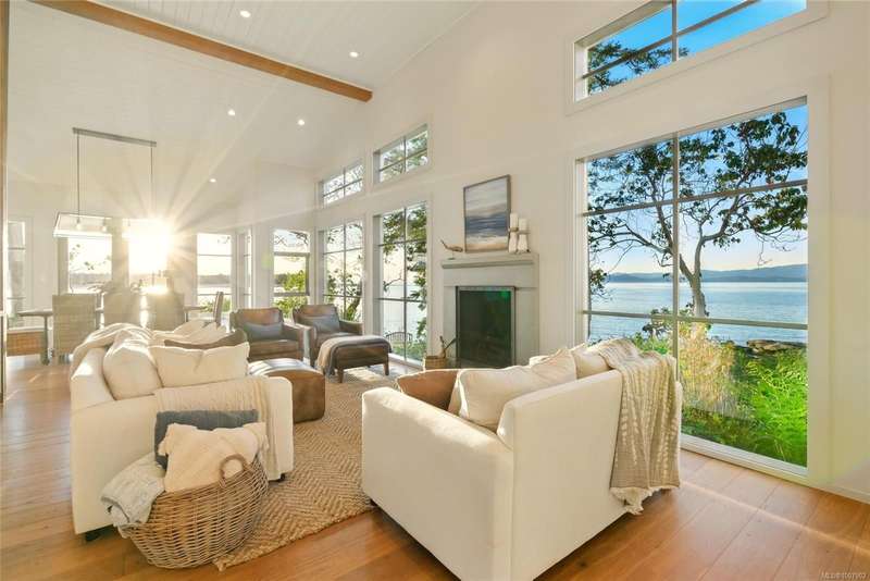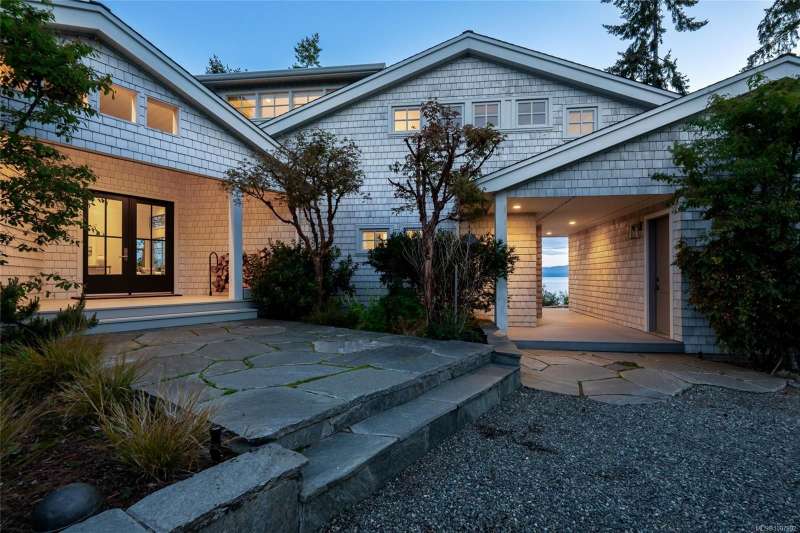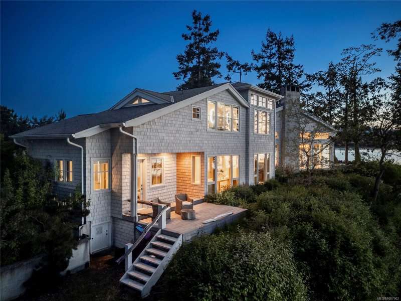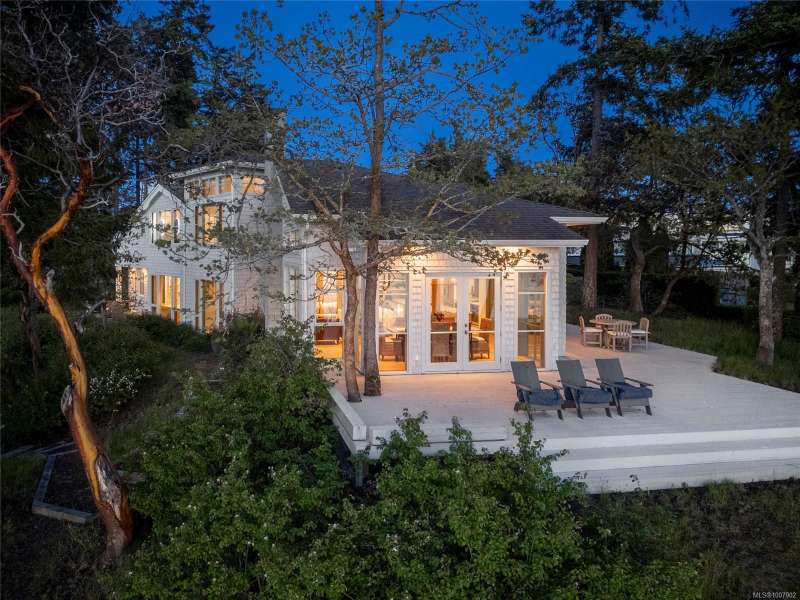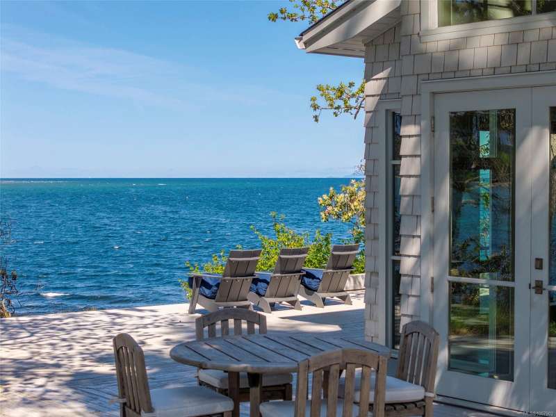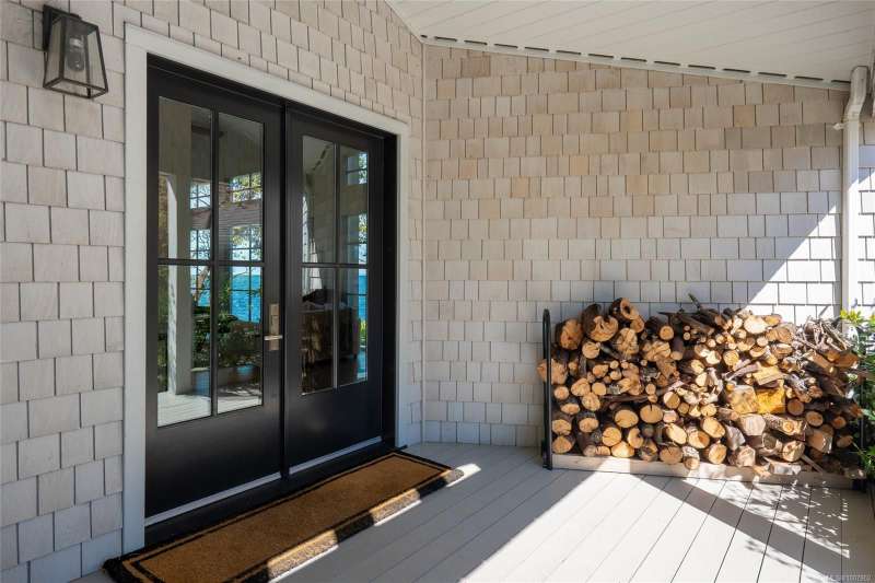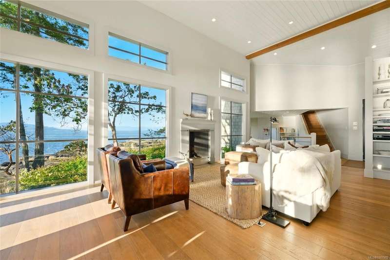 Perched at the tip of Madrona Point in Nanoose Bay, this bespoke 2011 waterfront residence by RDolan Construction captures the essence of timeless Cape Cod elegance amid Vancouver Island's most enchanting natural beauty. Set on a tranquil 0.5-acre lot embraced by parkland and lush native flora, it offers unmatched privacy and light. Inside 14-ft pine tongue-and-groove ceilings, hand-painted fir beams, radiant in-floor heating, and a 12ft custom concrete island define the airy, open-concept living space, where floor-to-ceiling windows frame sweeping ocean vistas. Two luxurious primary suites-each with walk-in closets and spa-inspired ensuites-allow for main-level ease or a secluded upper retreat. Across a breezeway, a charming guest suite with private deck invites quiet reflection. Multiple outdoor living areas offer 270° views, daily wildlife encounters, walk on waterfront access, and a private boat lift. A rare and graceful expression of coastal living, the true pearl of Madrona Drive