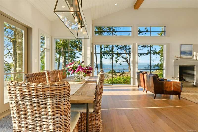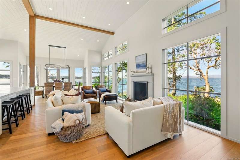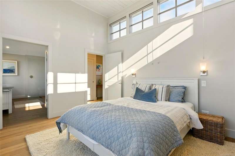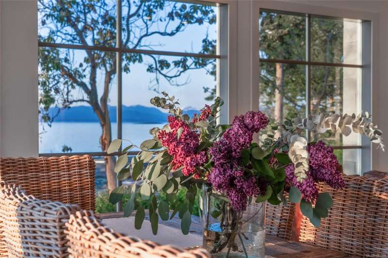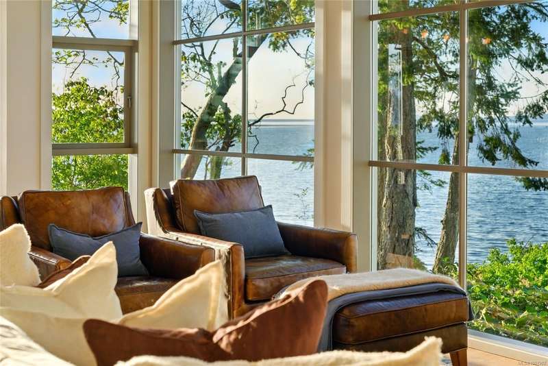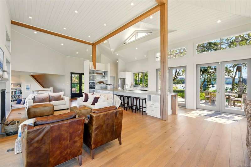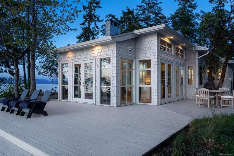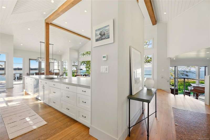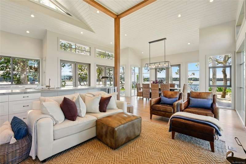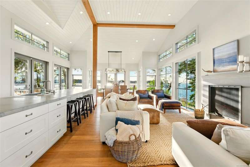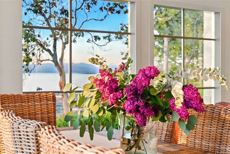 Perched at the tip of Madrona Point in Nanoose Bay, this bespoke 2011 waterfront residence by RDolan Construction captures the essence of timeless Cape Cod elegance amid Vancouver Island's most enchanting natural beauty. Set on a tranquil 0.5-acre lot embraced by parkland and lush native flora, it offers unmatched privacy and light. Inside 14-ft pine tongue-and-groove ceilings, hand-painted fir beams, radiant in-floor heating, and a 12ft custom concrete island define the airy, open-concept living space, where floor-to-ceiling windows frame sweeping ocean vistas. Two luxurious primary suites-each with walk-in closets and spa-inspired ensuites-allow for main-level ease or a secluded upper retreat. Across a breezeway, a charming guest suite with private deck invites quiet reflection. Multiple outdoor living areas offer 270° views, daily wildlife encounters, walk on waterfront access, and a private boat lift. A rare and graceful expression of coastal living, the true pearl of Madrona Drive