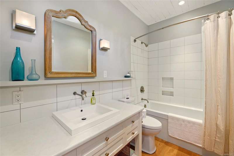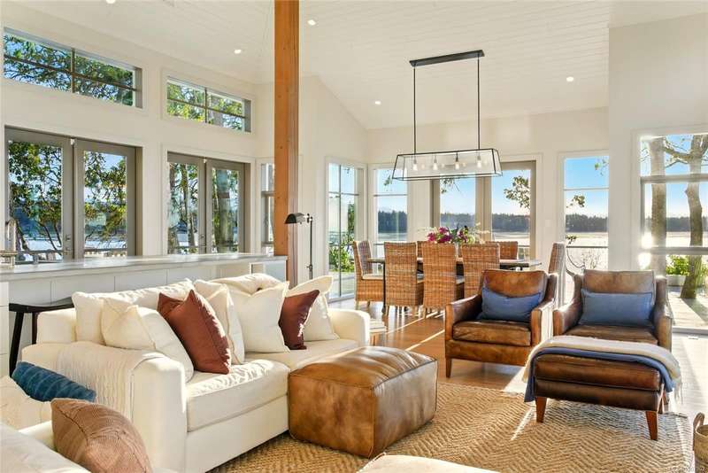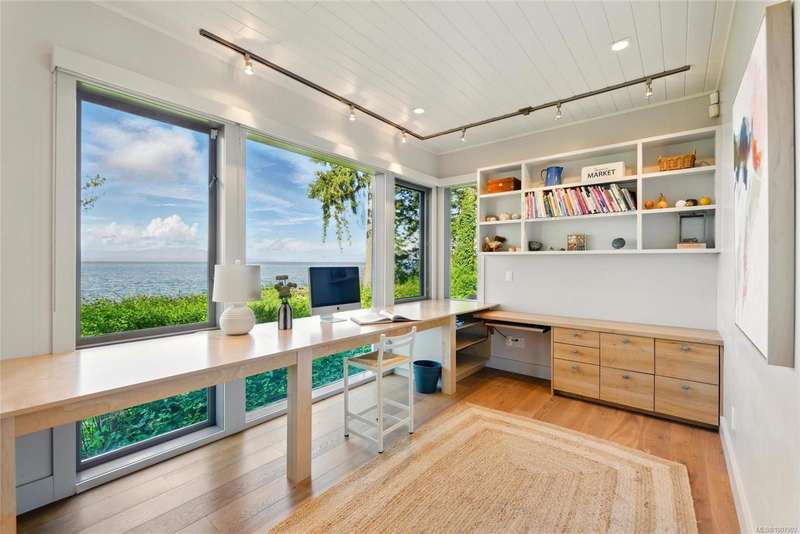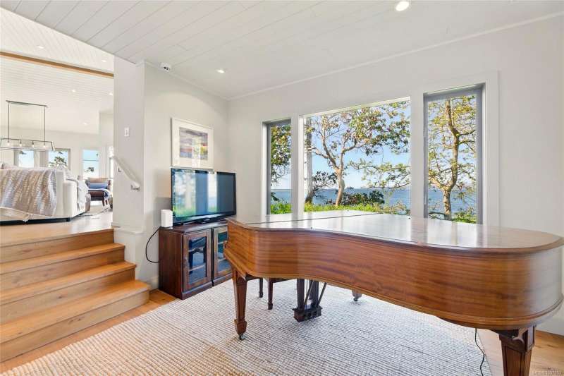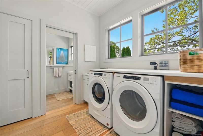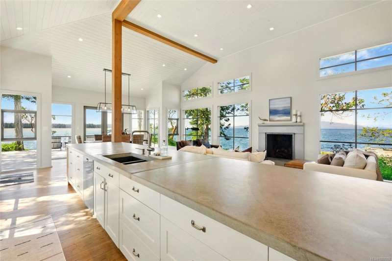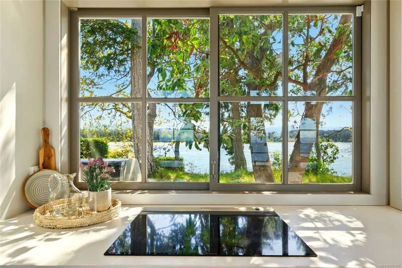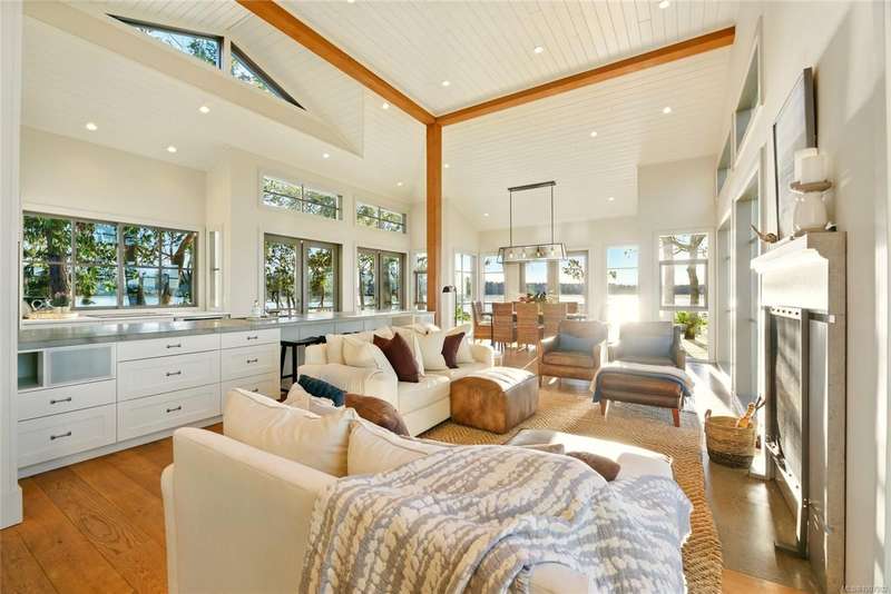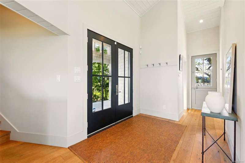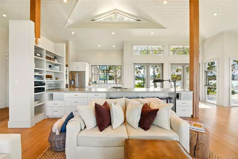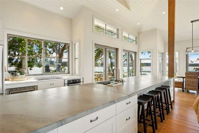 Perched at the tip of Madrona Point in Nanoose Bay, this bespoke 2011 waterfront residence by RDolan Construction captures the essence of timeless Cape Cod elegance amid Vancouver Island's most enchanting natural beauty. Set on a tranquil 0.5-acre lot embraced by parkland and lush native flora, it offers unmatched privacy and light. Inside 14-ft pine tongue-and-groove ceilings, hand-painted fir beams, radiant in-floor heating, and a 12ft custom concrete island define the airy, open-concept living space, where floor-to-ceiling windows frame sweeping ocean vistas. Two luxurious primary suites-each with walk-in closets and spa-inspired ensuites-allow for main-level ease or a secluded upper retreat. Across a breezeway, a charming guest suite with private deck invites quiet reflection. Multiple outdoor living areas offer 270° views, daily wildlife encounters, walk on waterfront access, and a private boat lift. A rare and graceful expression of coastal living, the true pearl of Madrona Drive